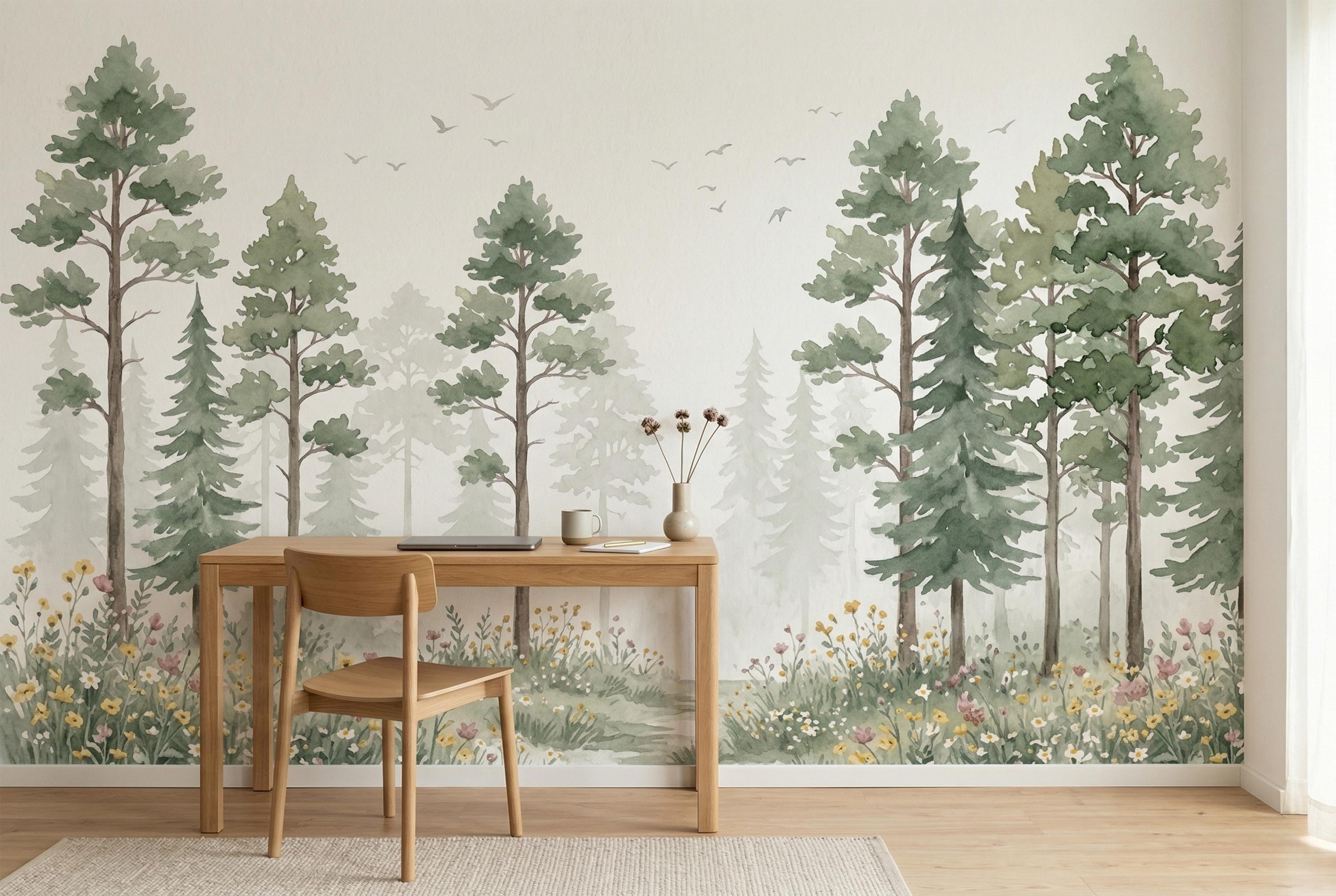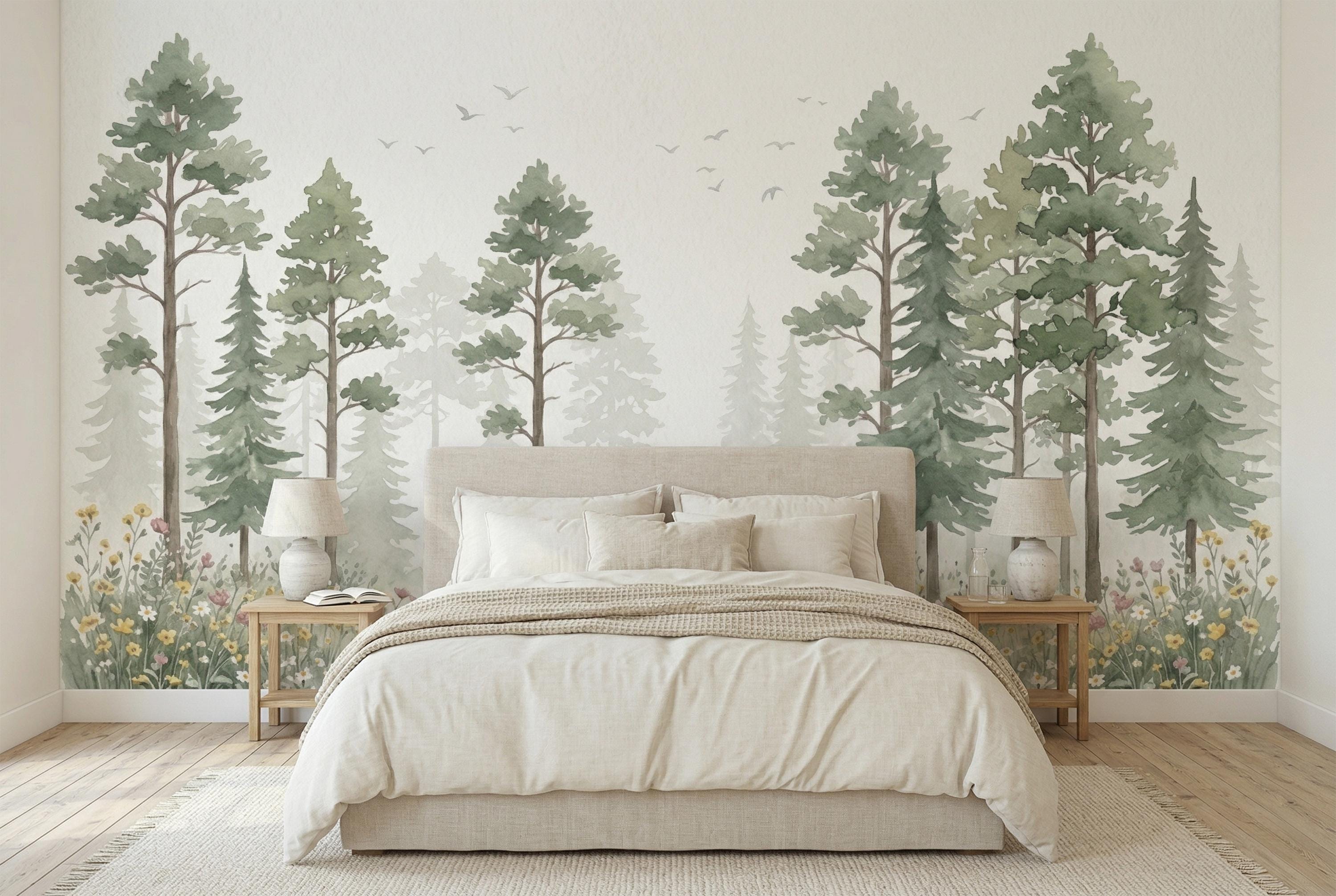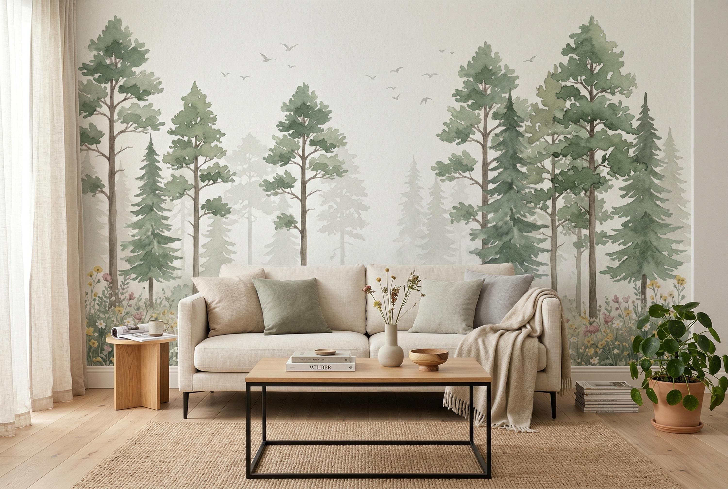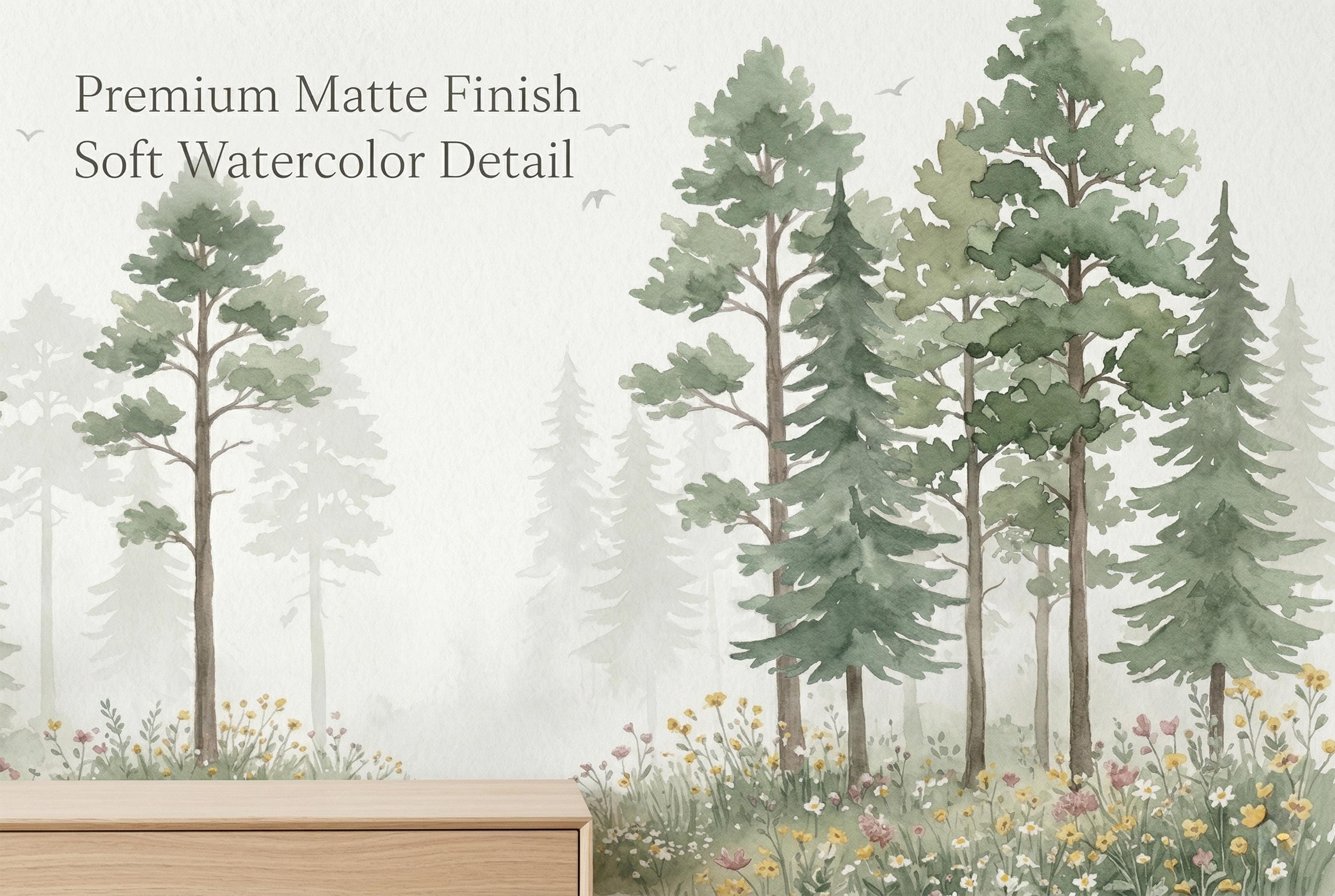 As a watercolor woodland nursery mural it is gender-neutral and enduringly relevant. As a misty forest wallpaper for living room or bedroom it creates instant calm. As a Scandi nature wall mural it fits perfectly into Japandi, boho, and minimalist interior schemes.