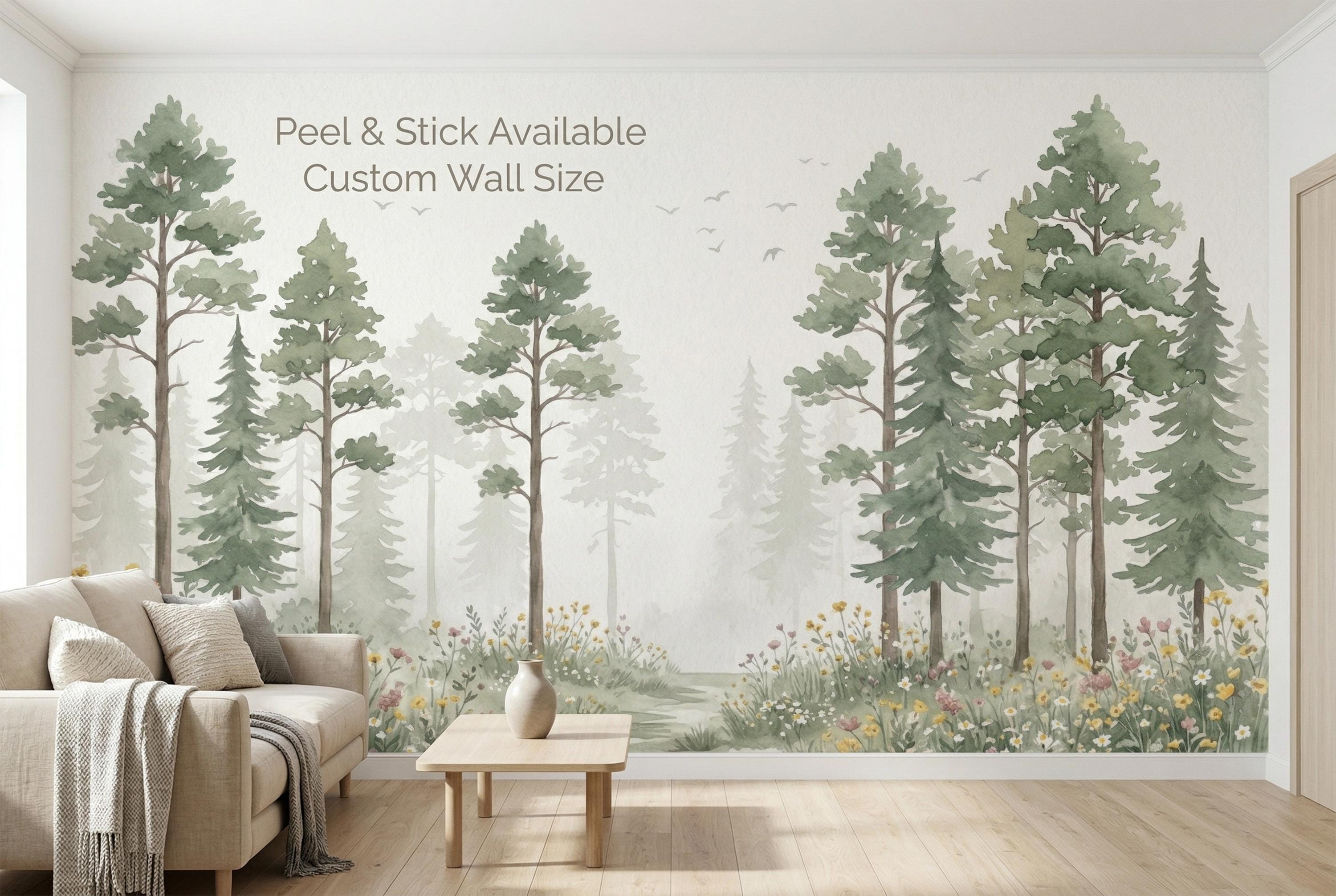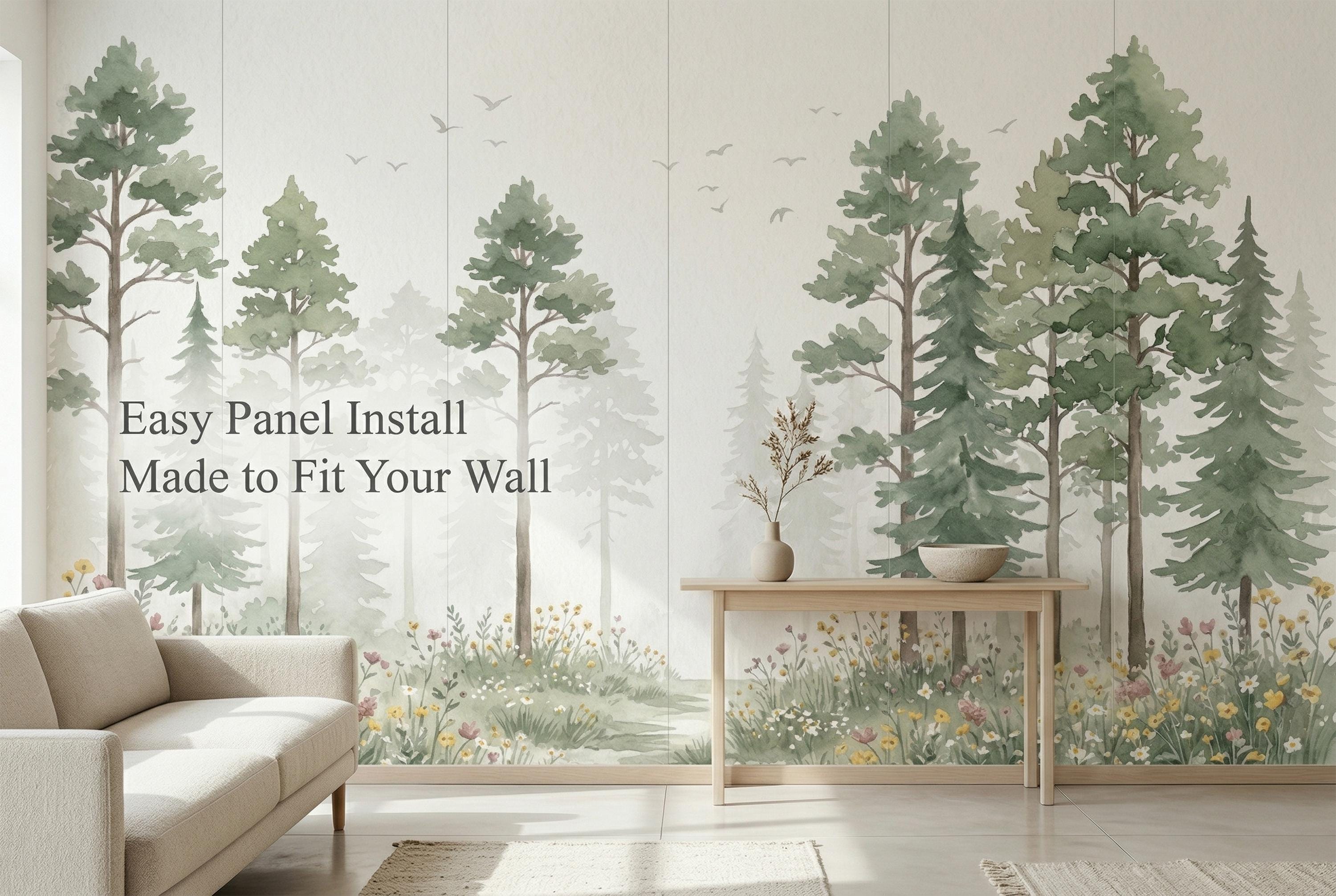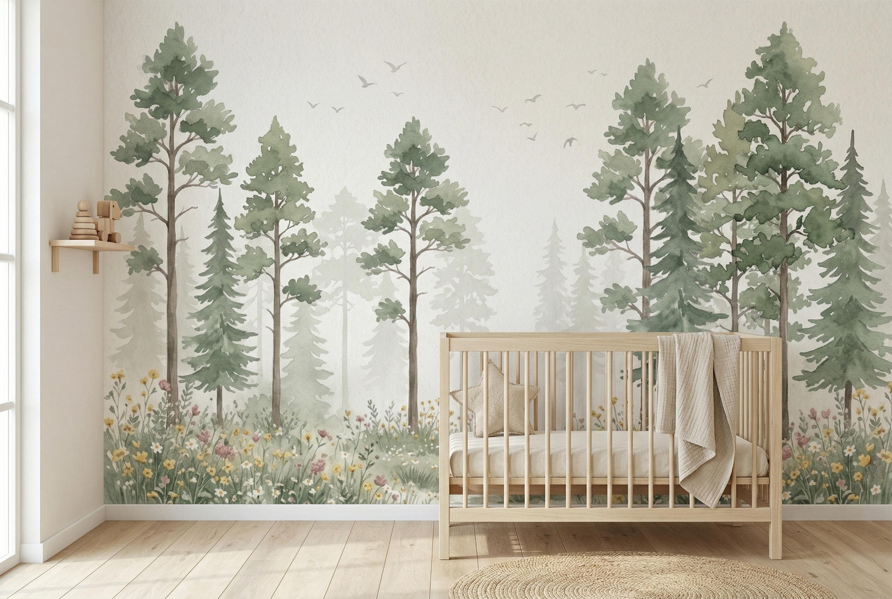 As a watercolor woodland nursery mural it is gender-neutral and enduringly relevant. As a misty forest wallpaper for living room or bedroom it creates instant calm. As a Scandi nature wall mural it fits perfectly into Japandi, boho, and minimalist interior schemes.