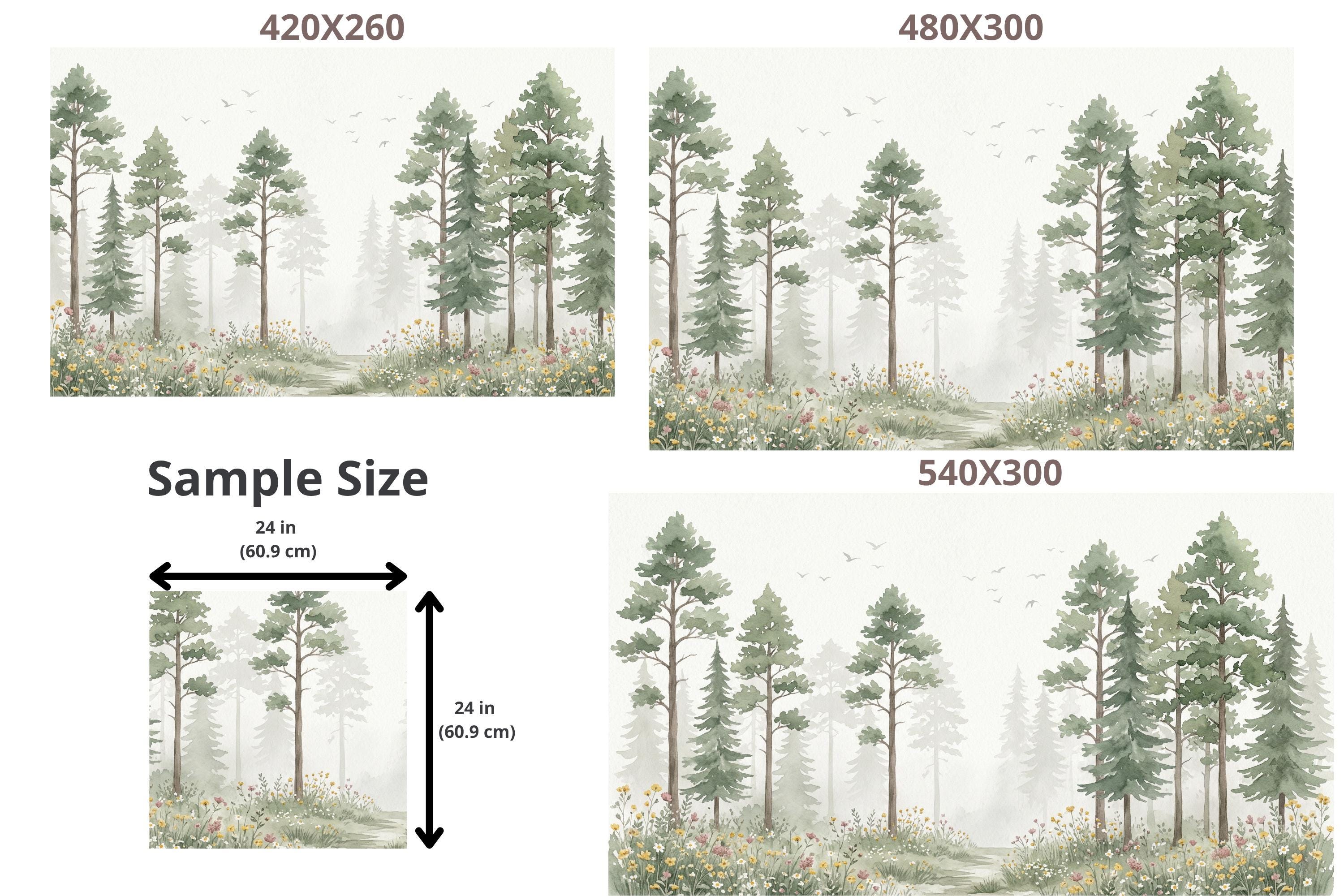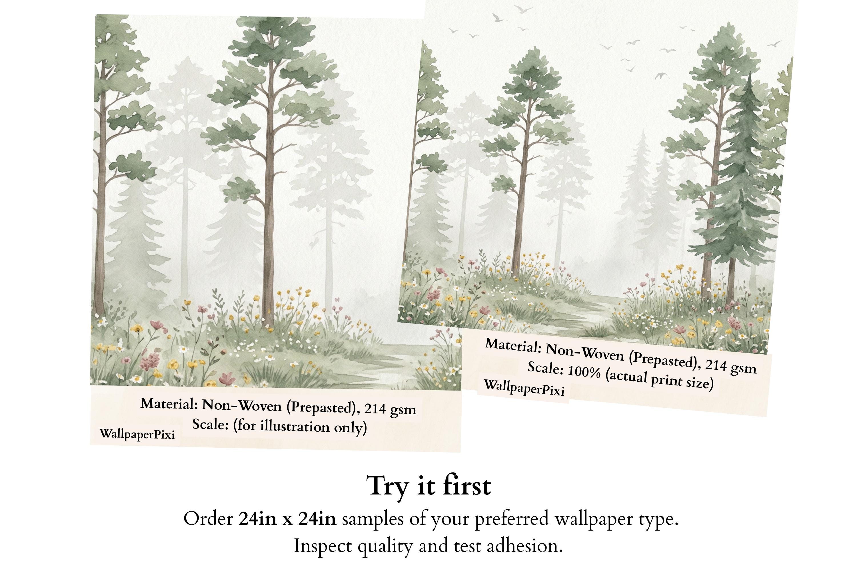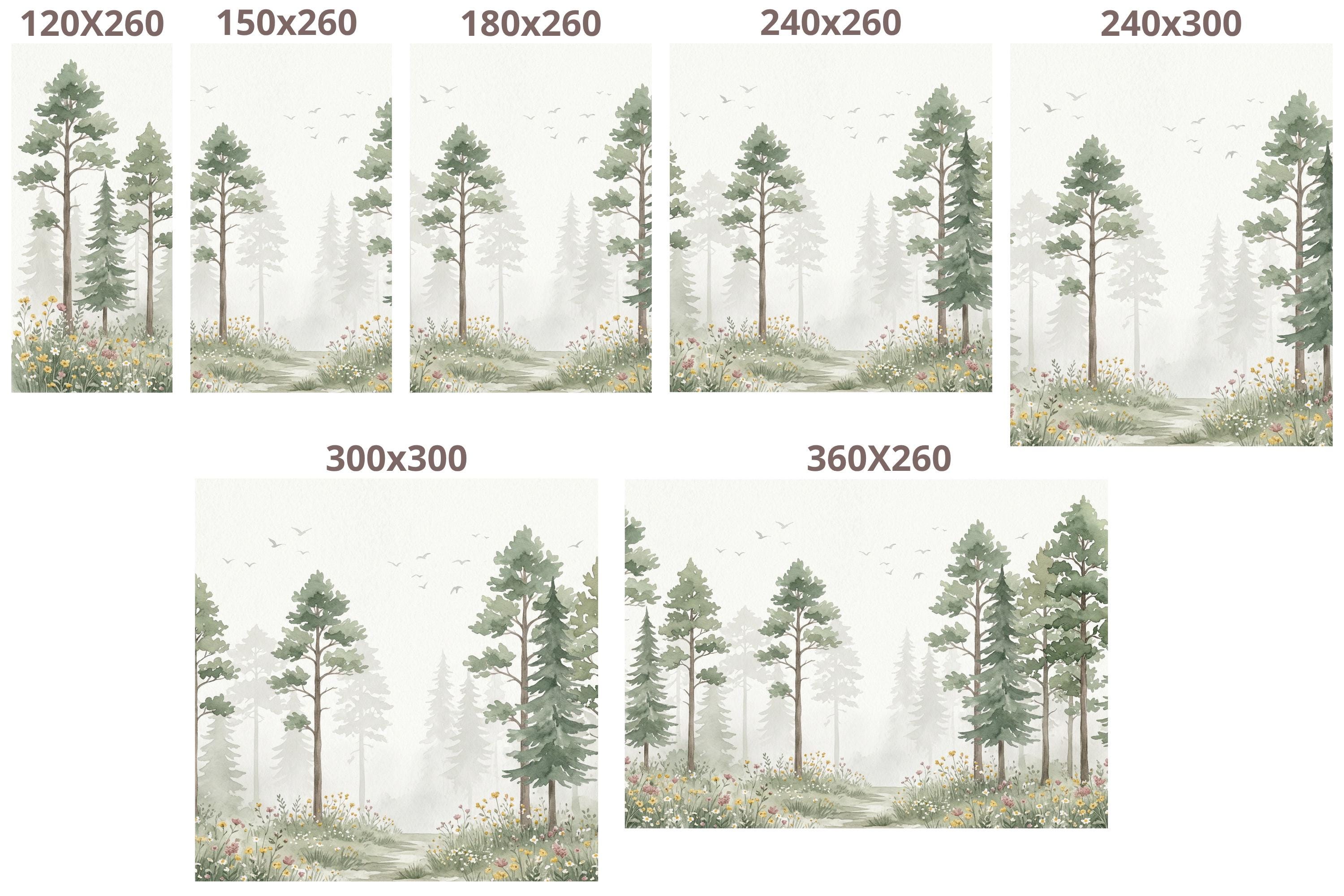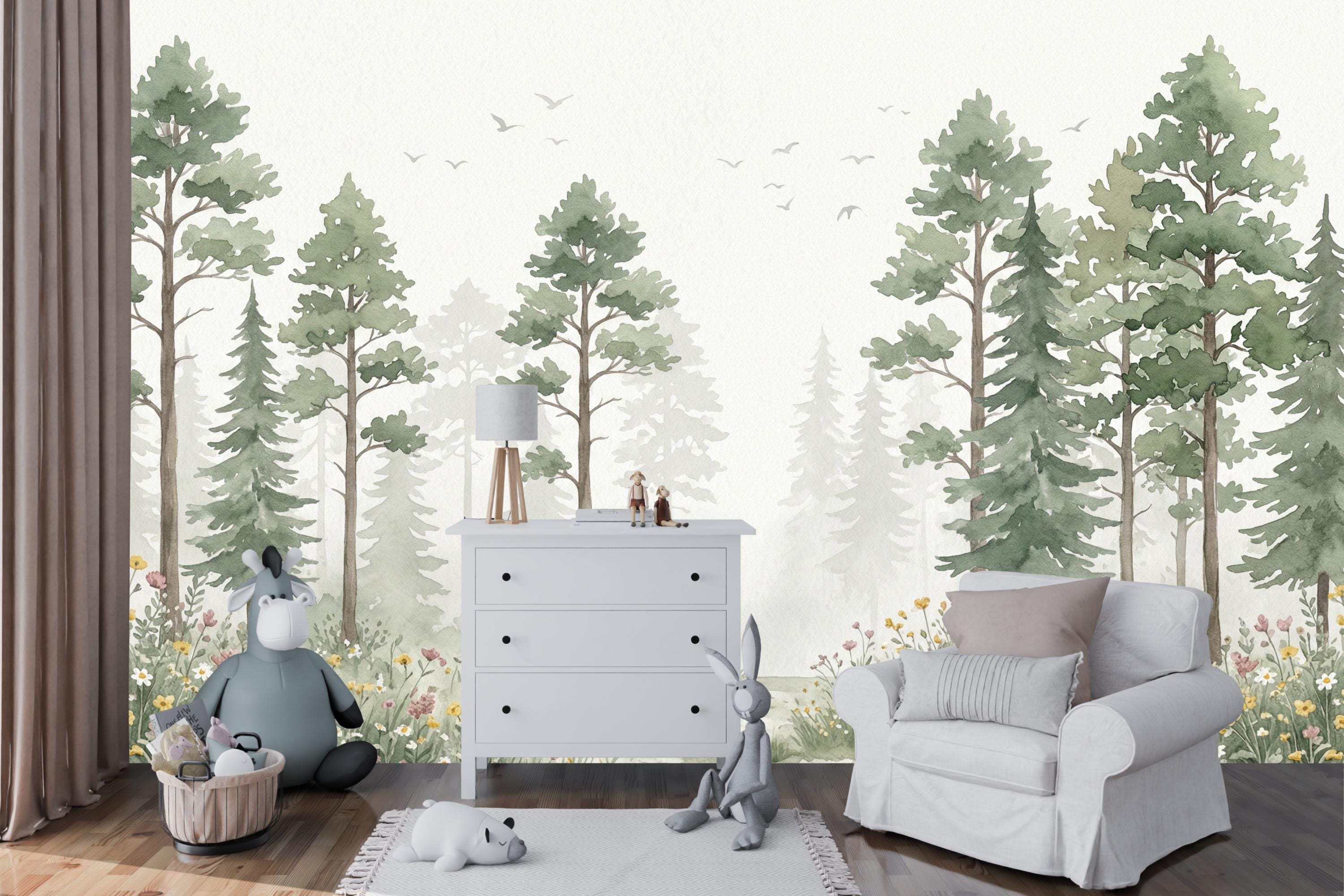 As a watercolor woodland nursery mural it is gender-neutral and enduringly relevant. As a misty forest wallpaper for living room or bedroom it creates instant calm. As a Scandi nature wall mural it fits perfectly into Japandi, boho, and minimalist interior schemes.