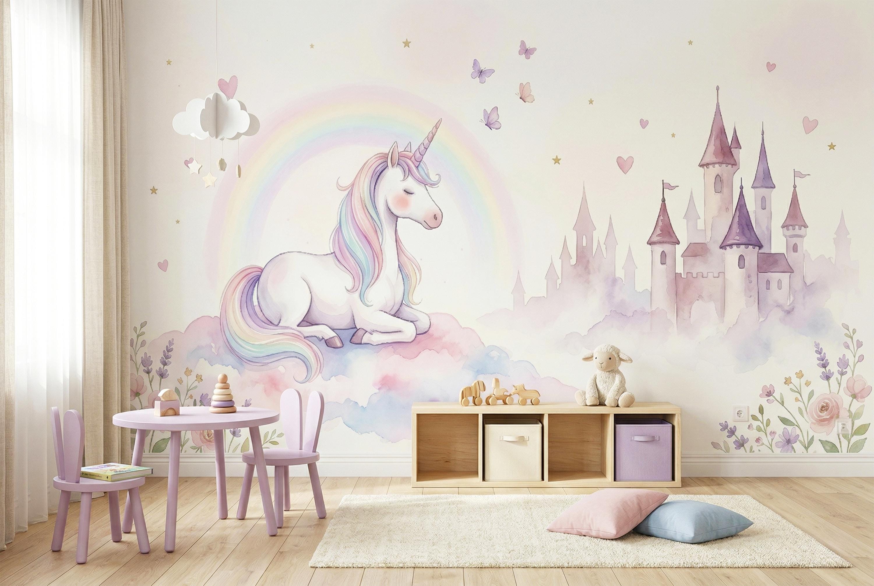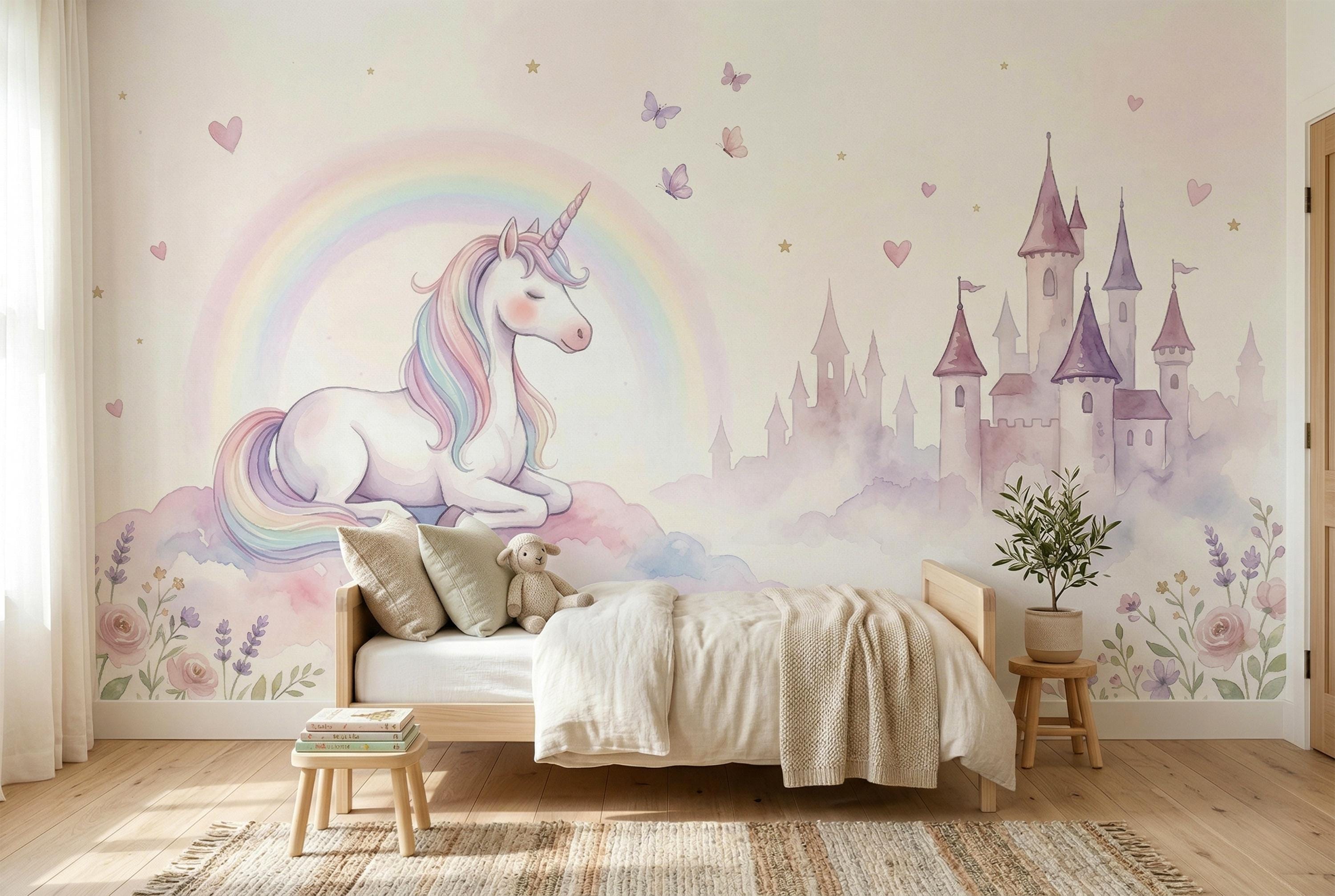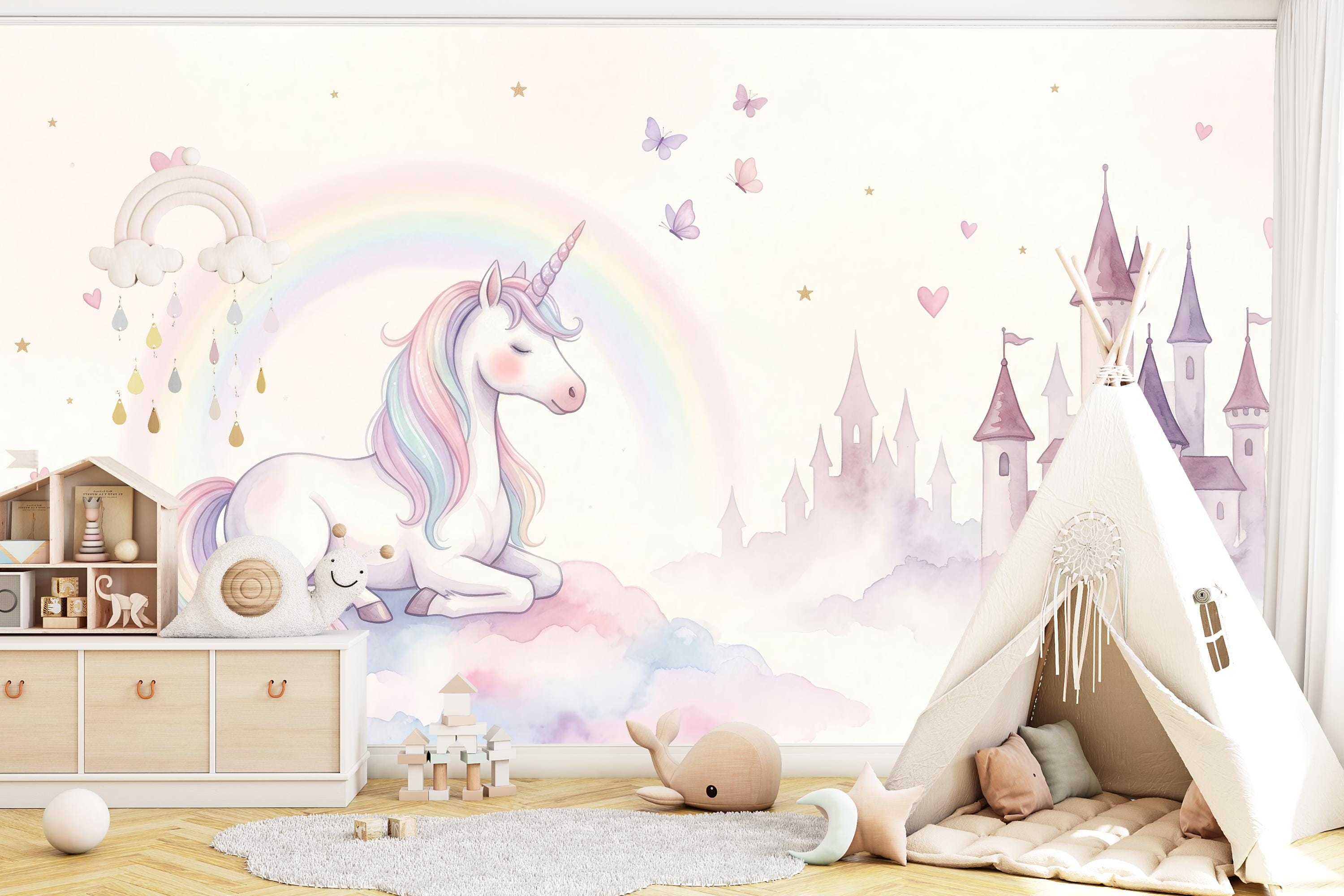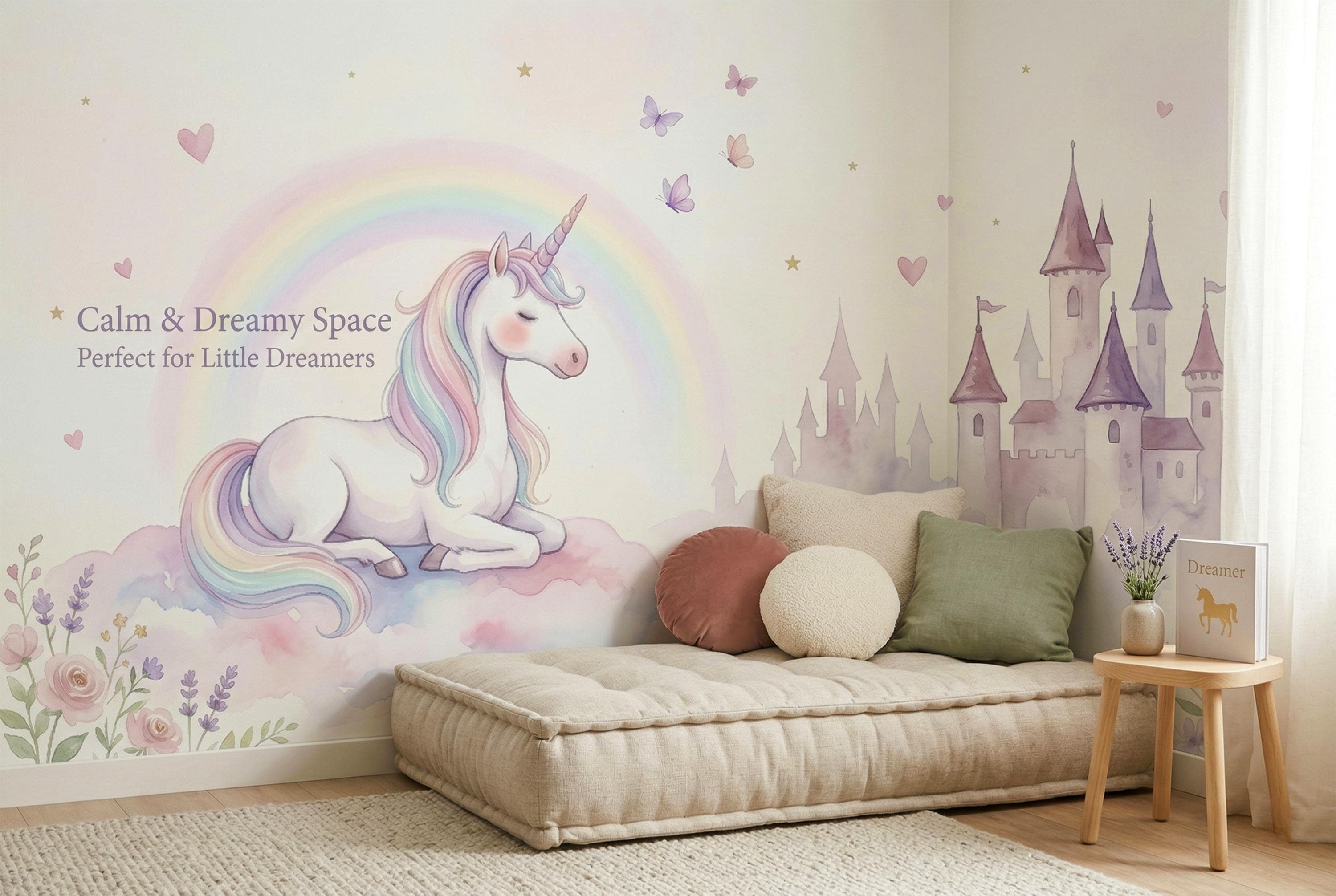 A peaceful unicorn rests on soft clouds beneath a glowing rainbow, while a dreamy castle fades into the distance. This gentle watercolor design creates a calming, magical space where imagination can quietly flourish.
