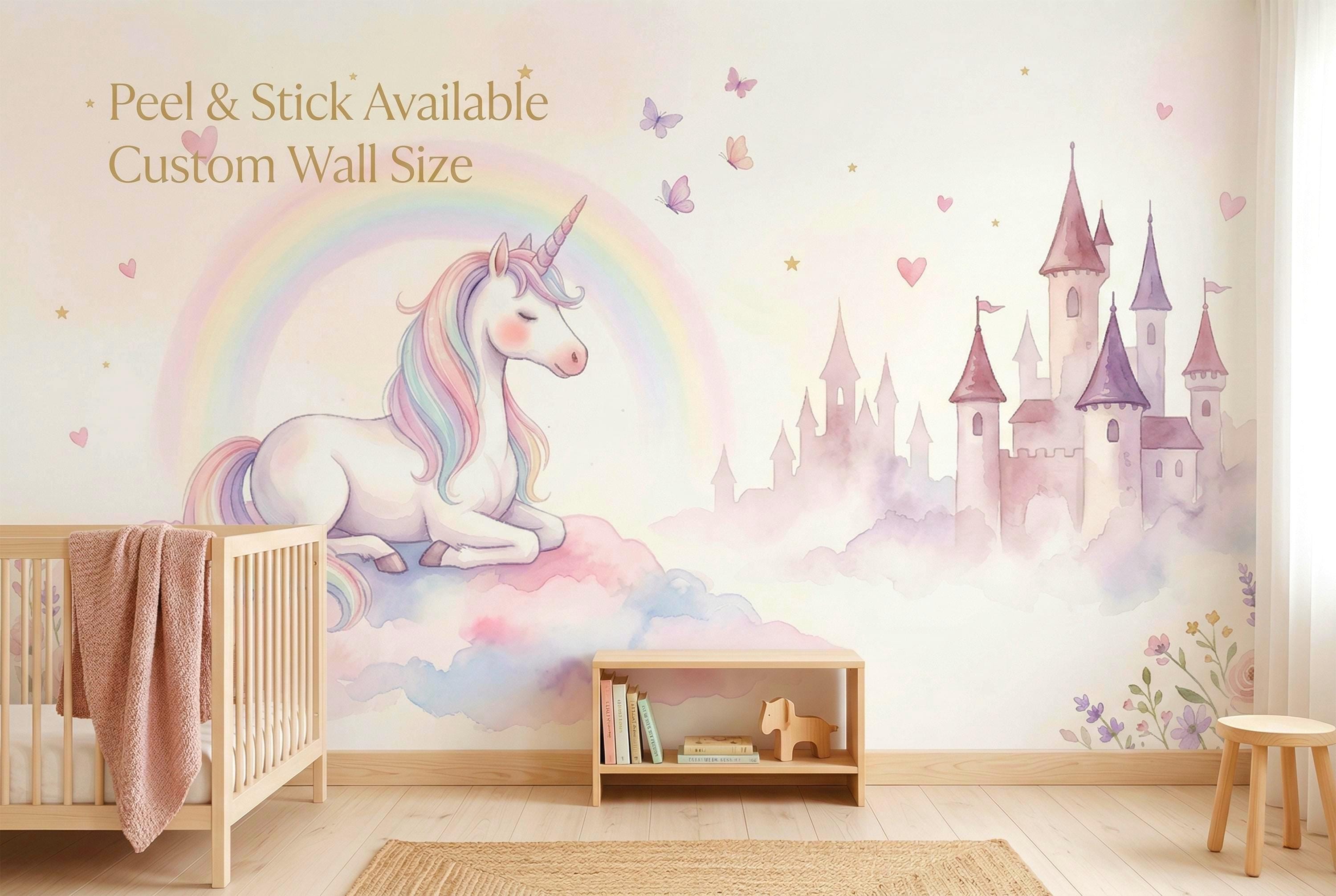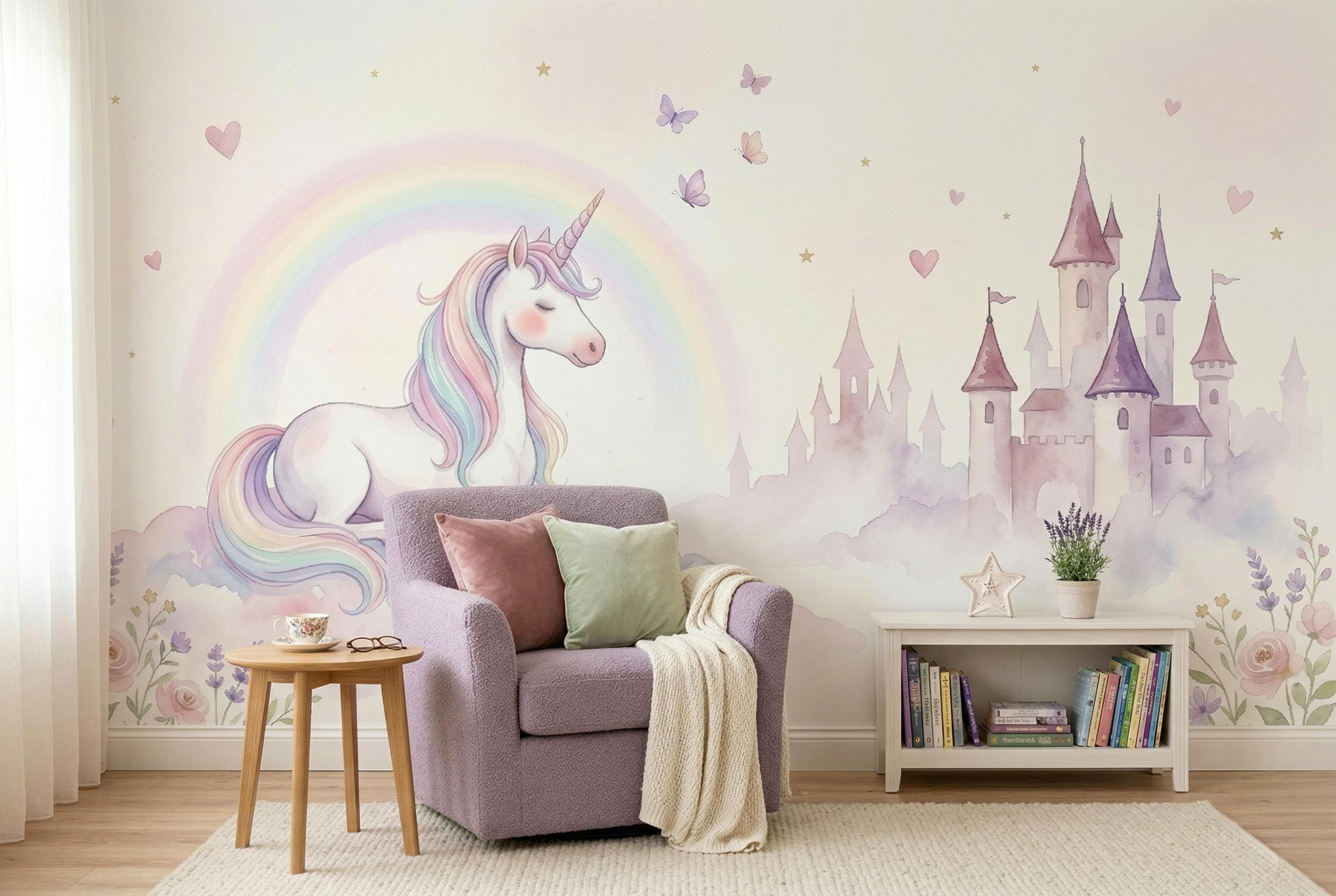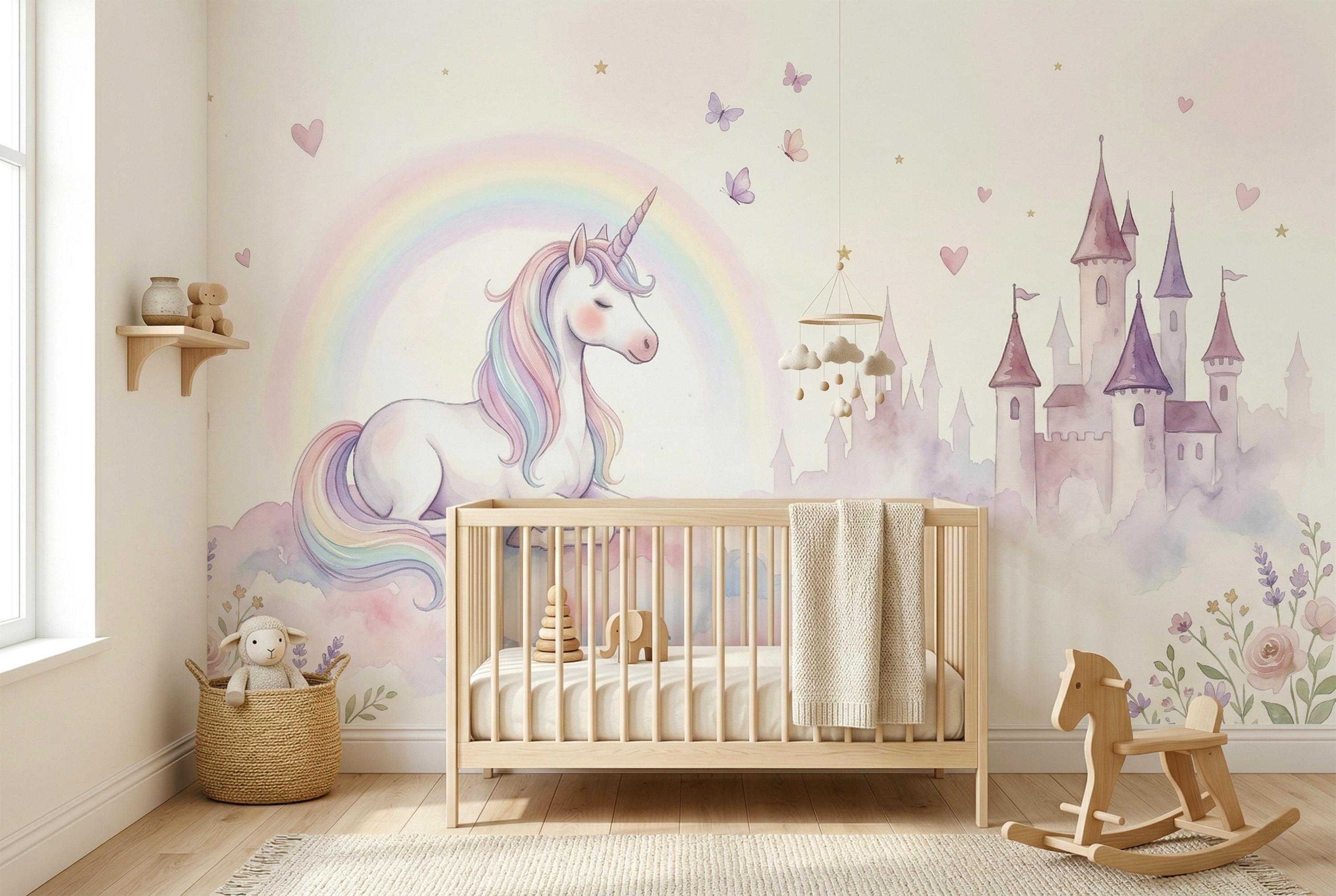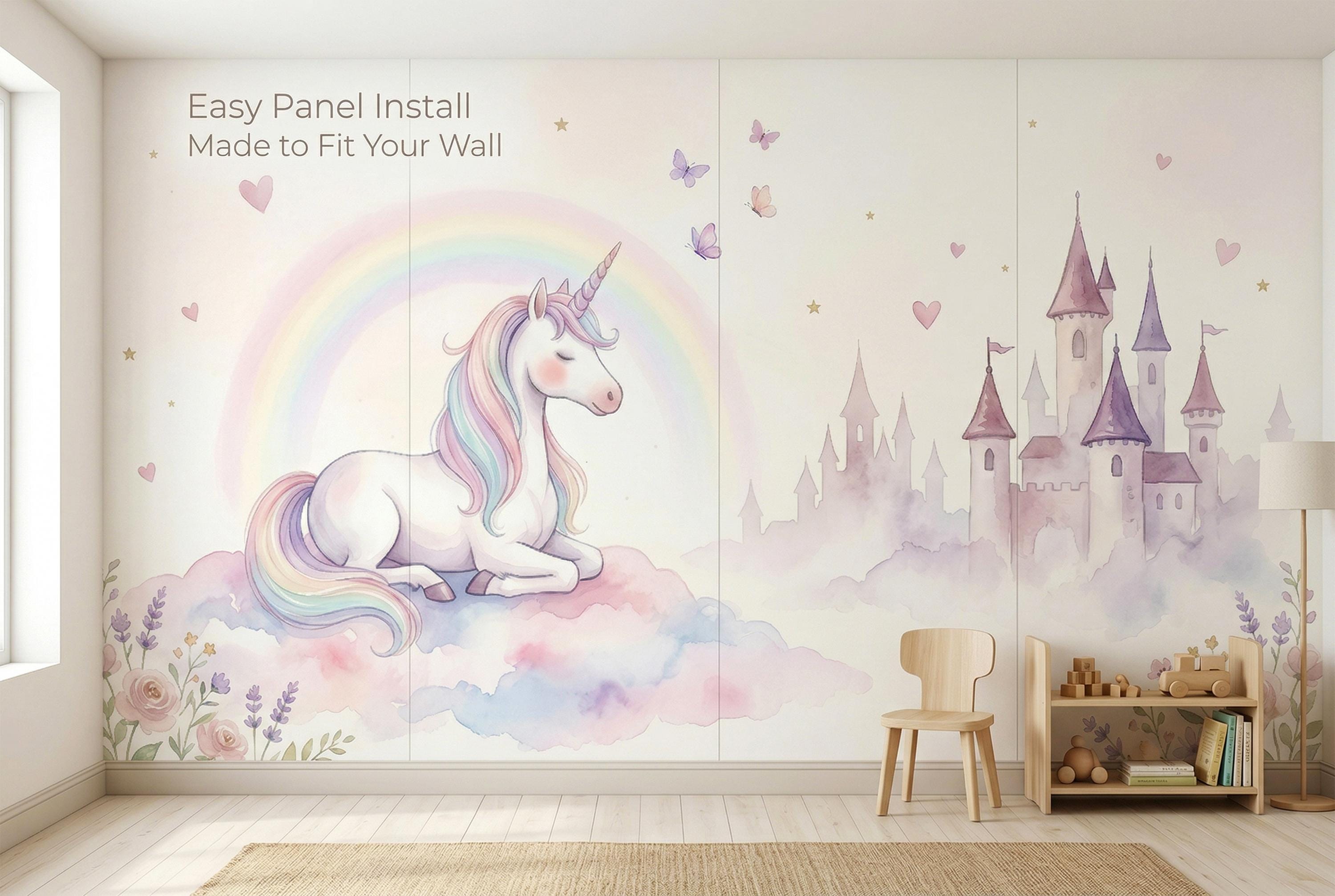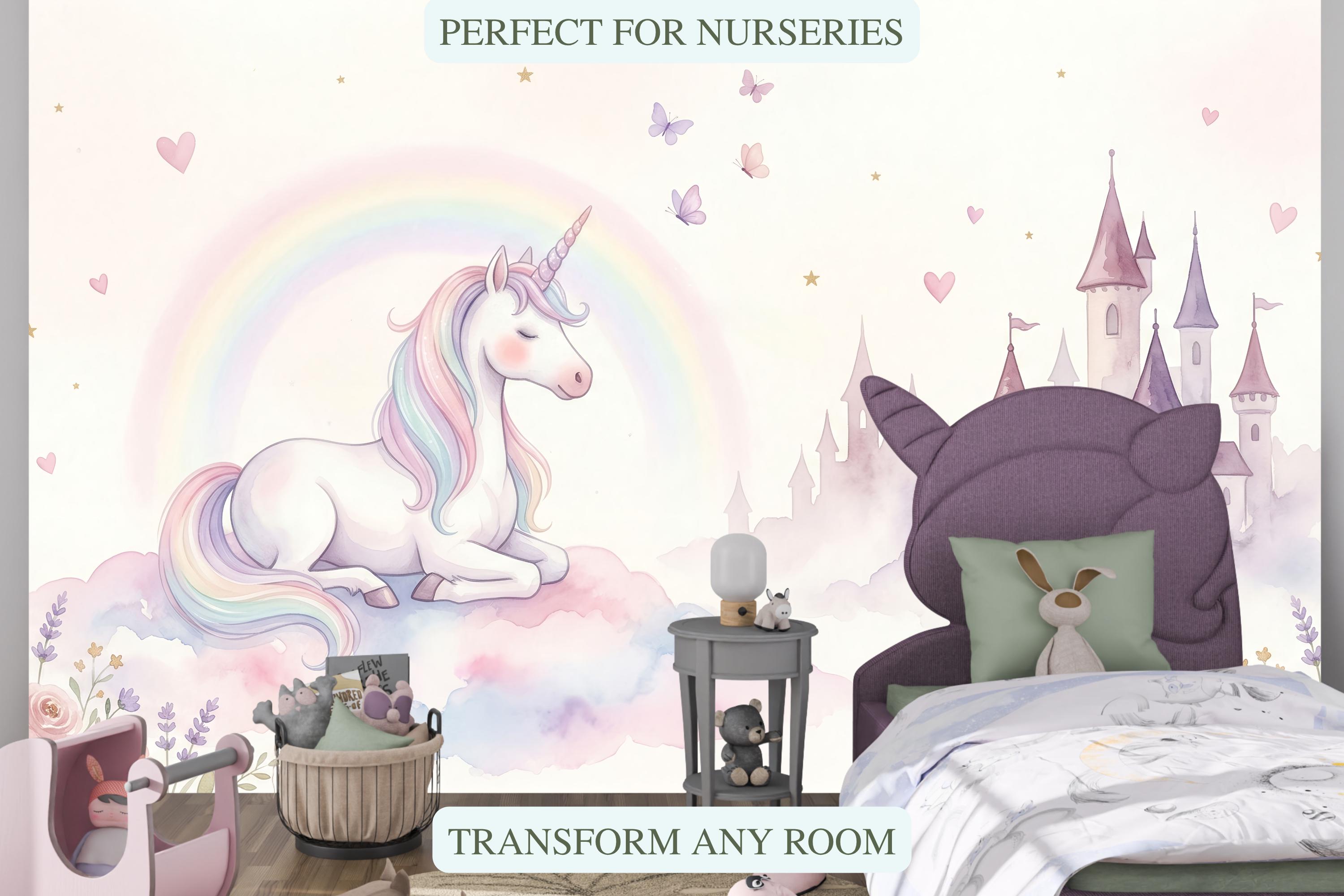 A peaceful unicorn rests on soft clouds beneath a glowing rainbow, while a dreamy castle fades into the distance. This gentle watercolor design creates a calming, magical space where imagination can quietly flourish.