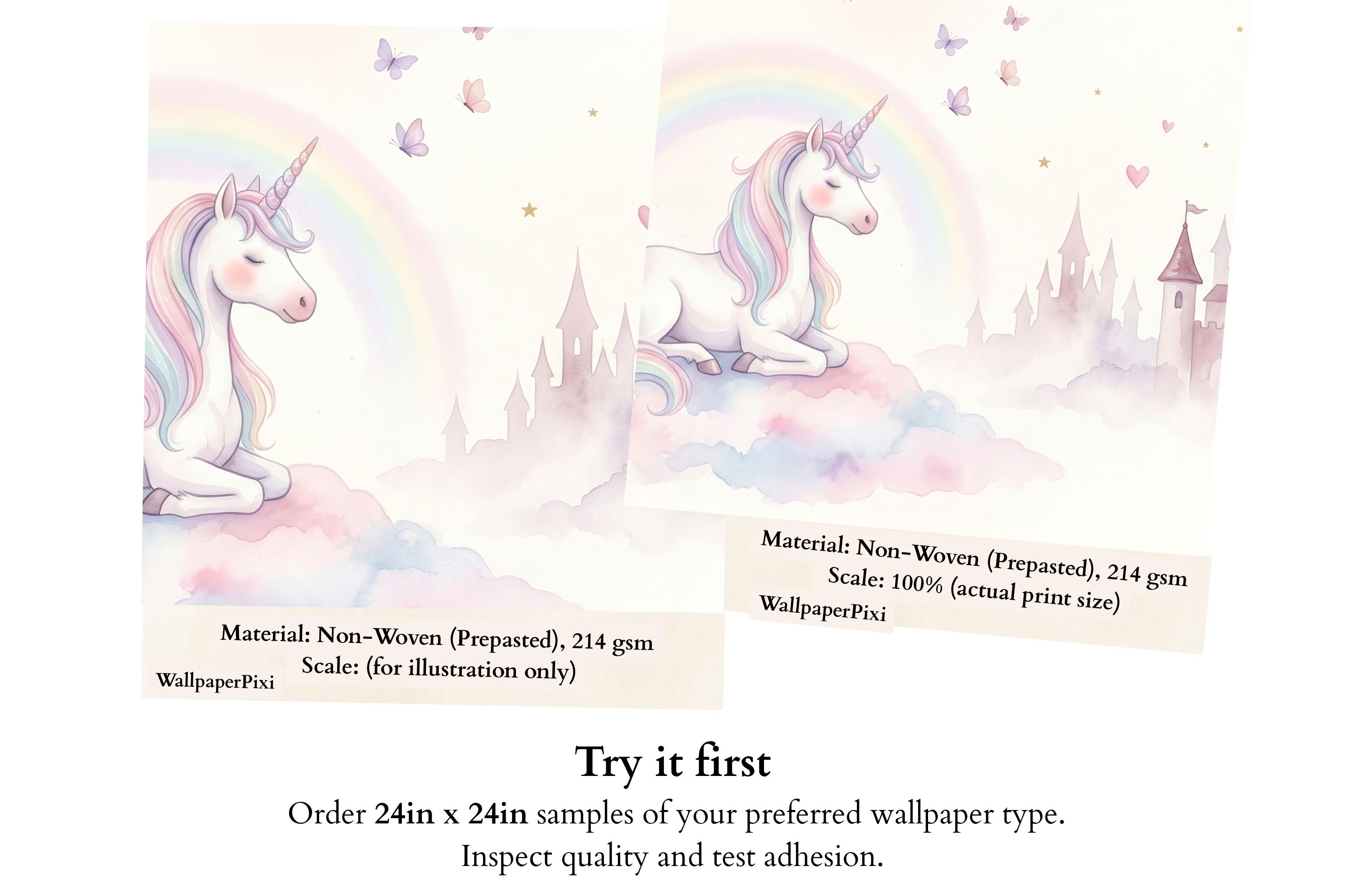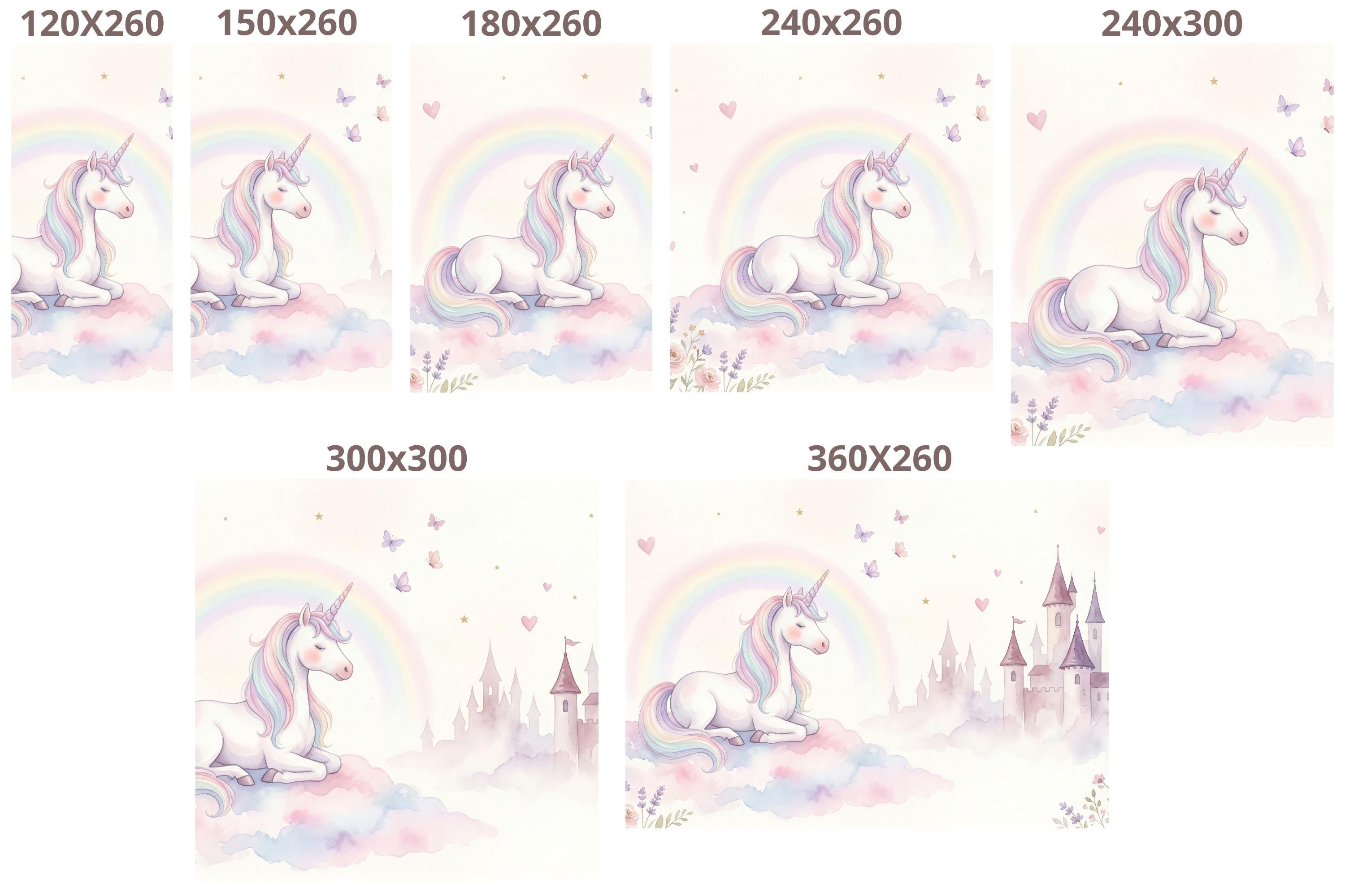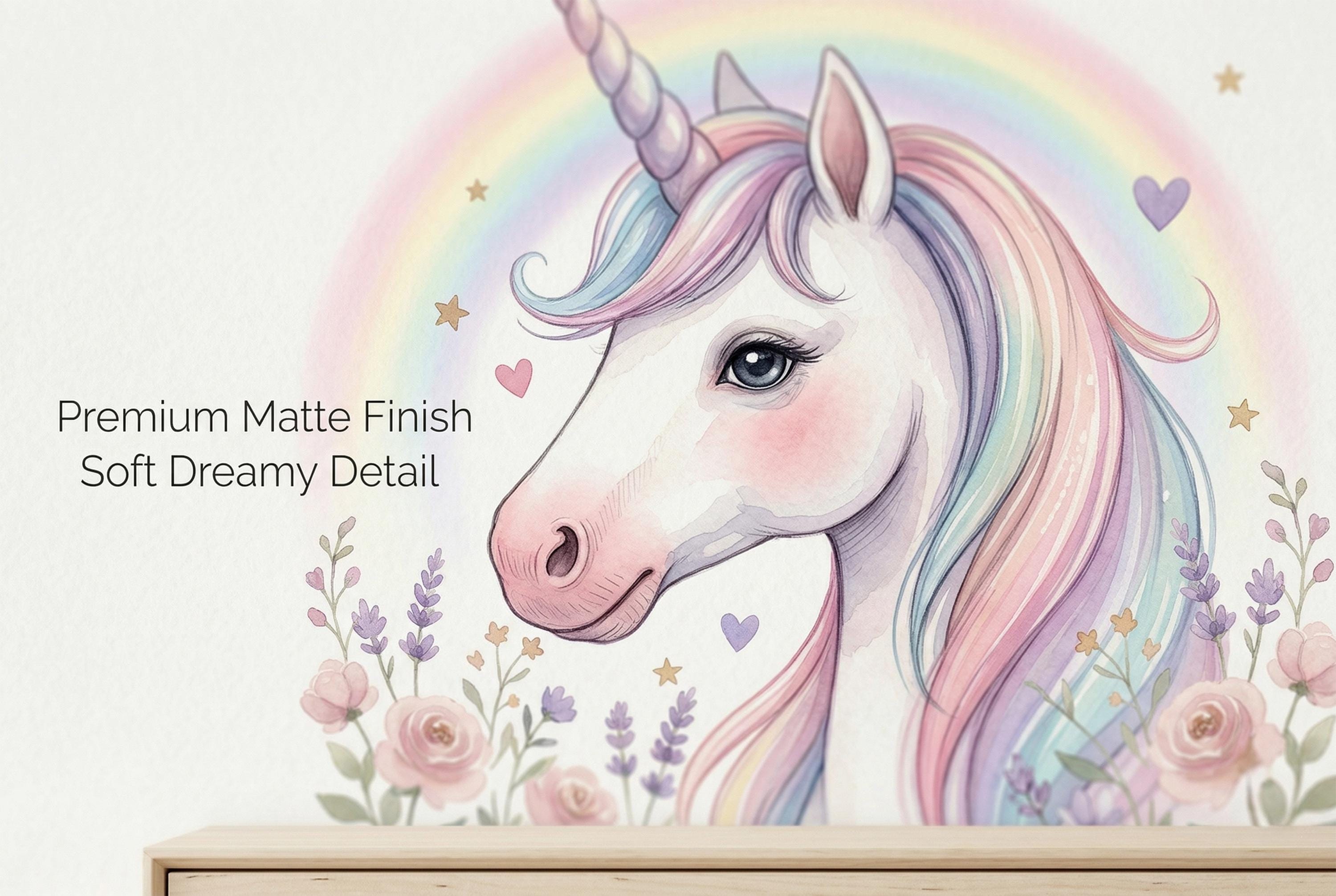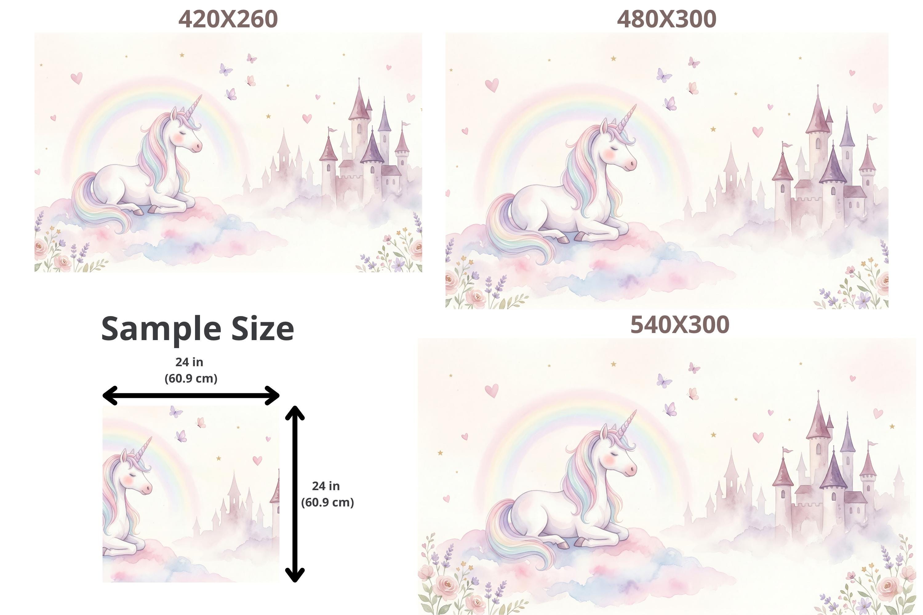 A peaceful unicorn rests on soft clouds beneath a glowing rainbow, while a dreamy castle fades into the distance. This gentle watercolor design creates a calming, magical space where imagination can quietly flourish.