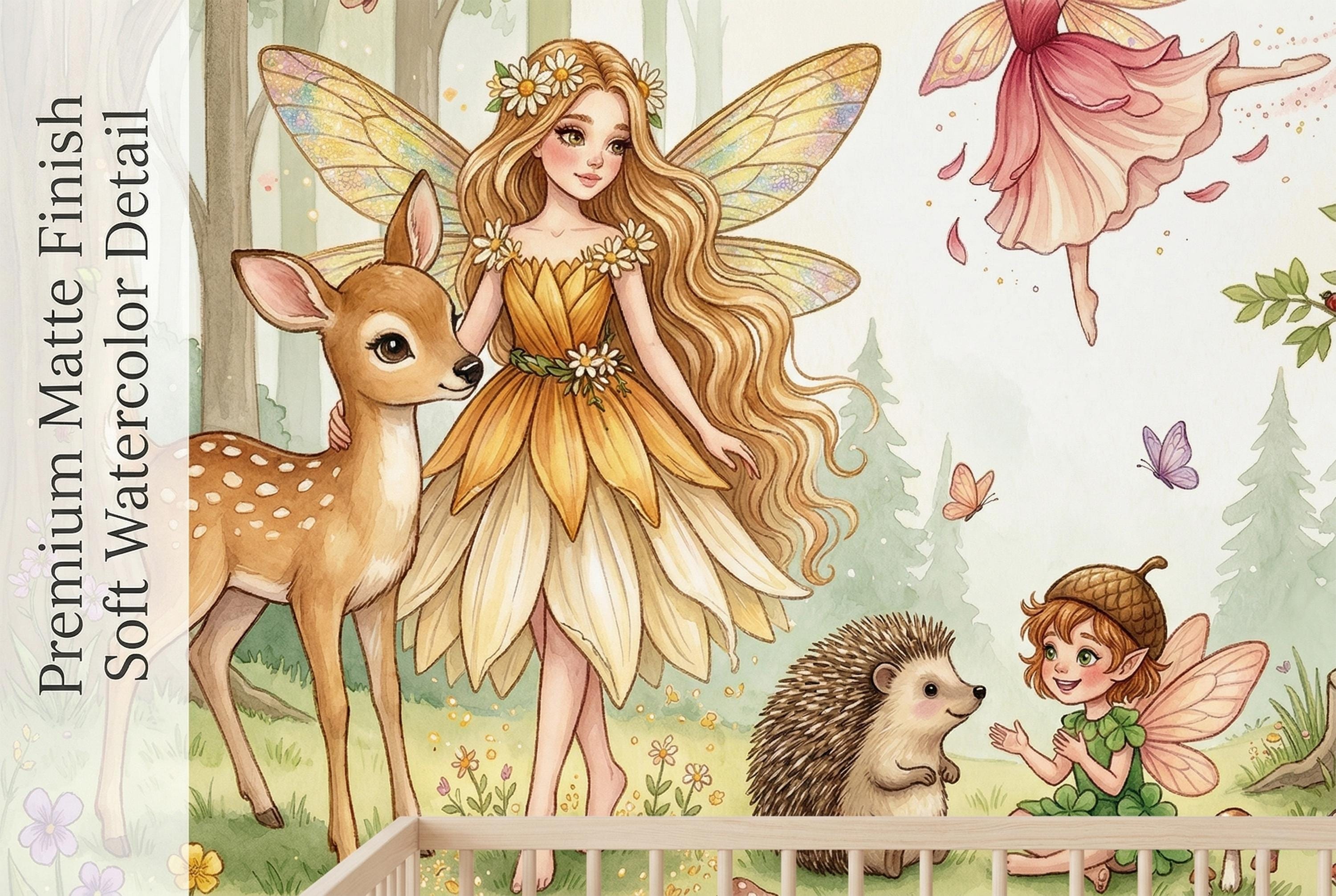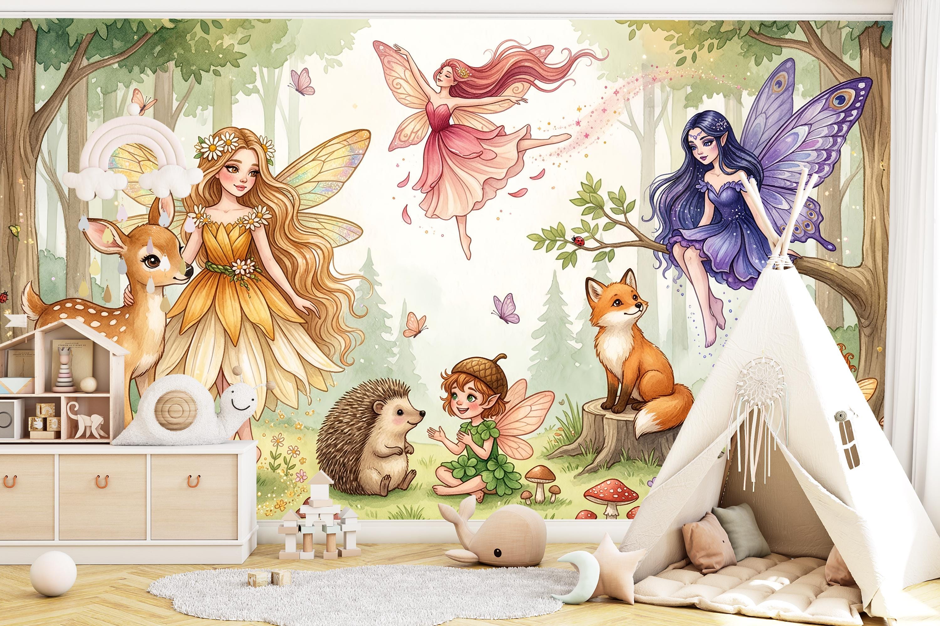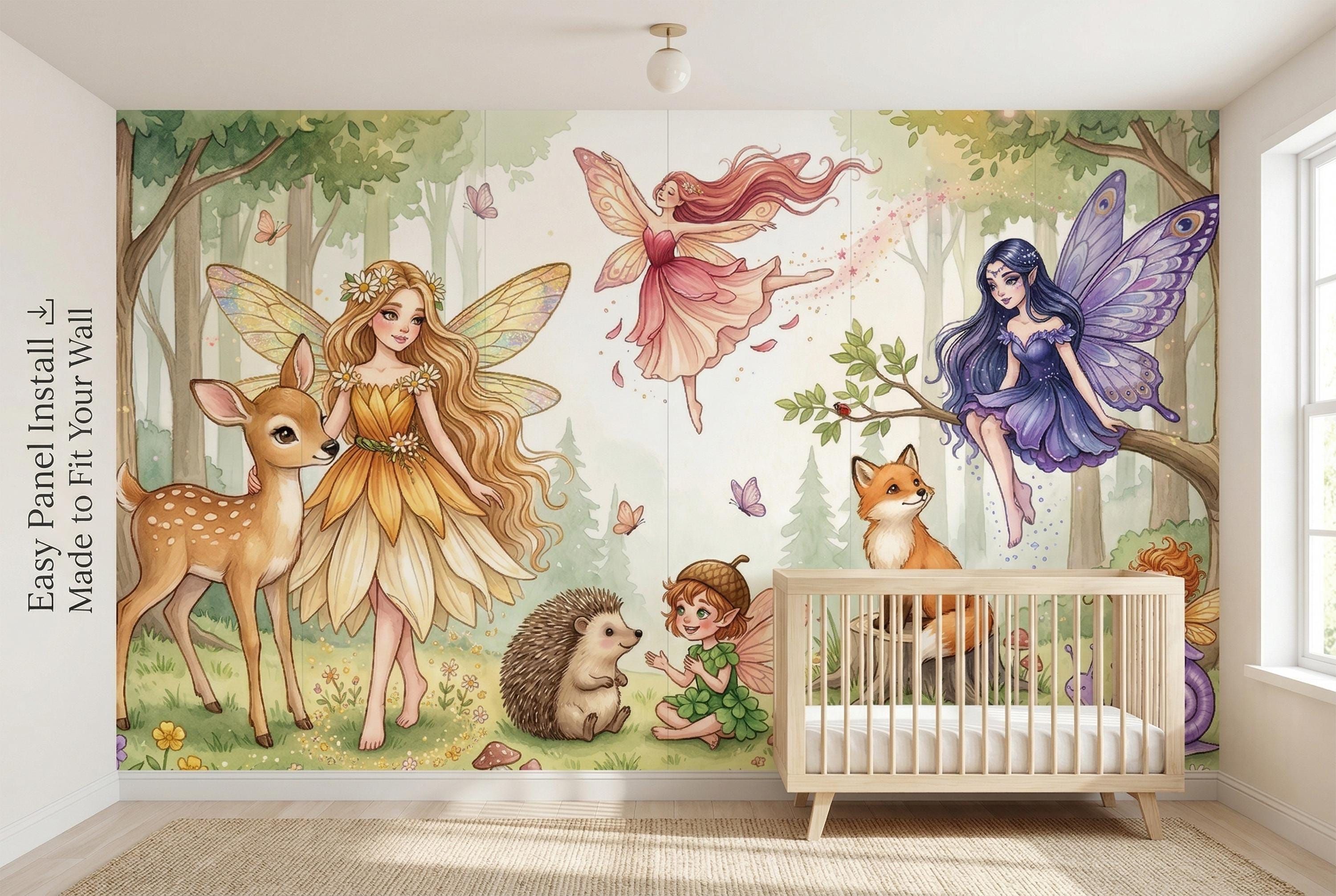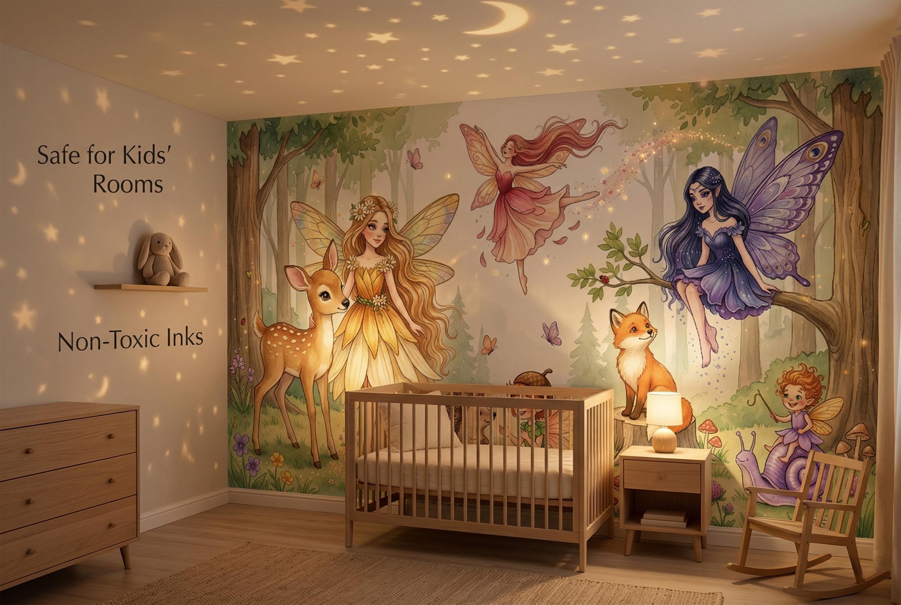 Close your eyes and imagine your little one waking up surrounded by gentle fairies, curious woodland creatures, and the soft glow of an enchanted forest. This wallpaper mural transforms any nursery, bedroom, or playroom into a magical realm where imagination has no limits.