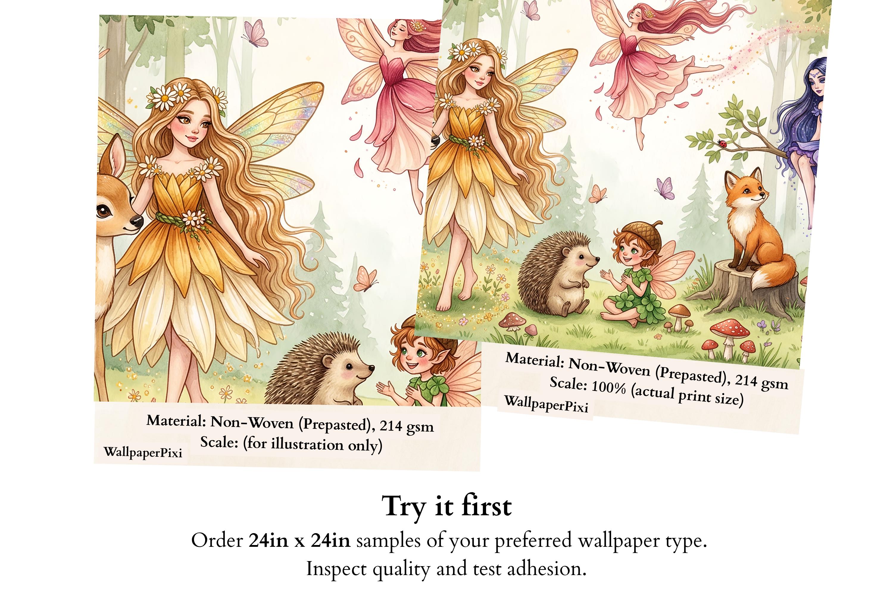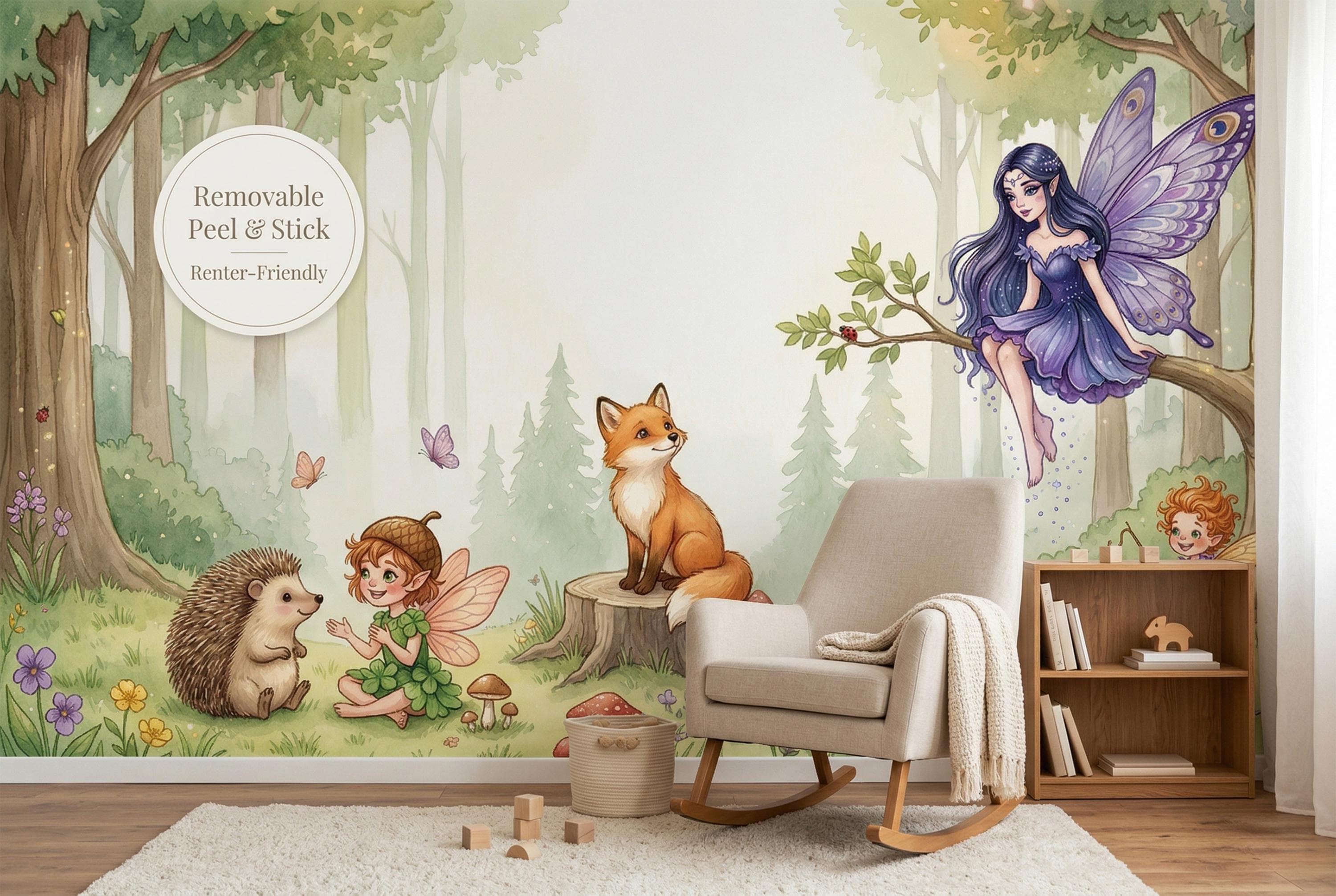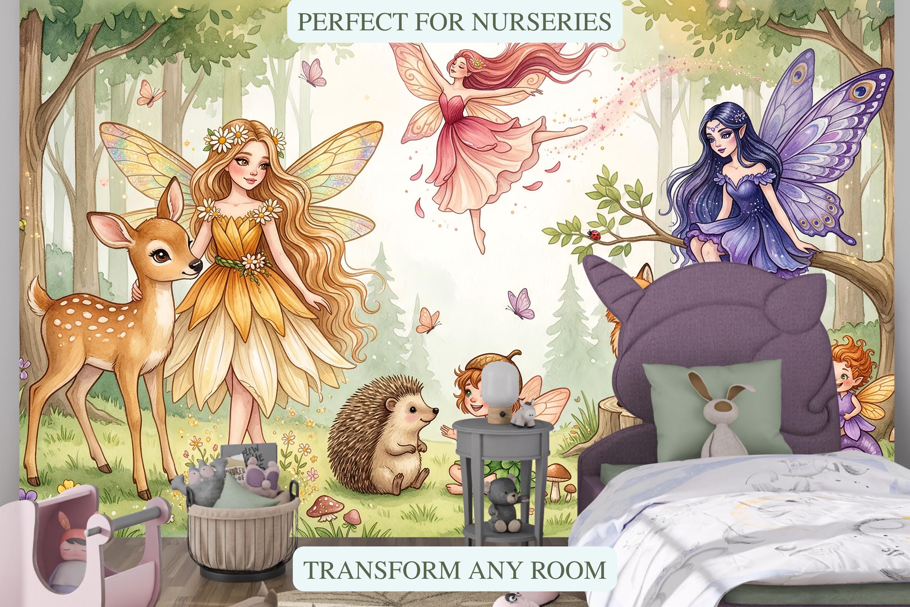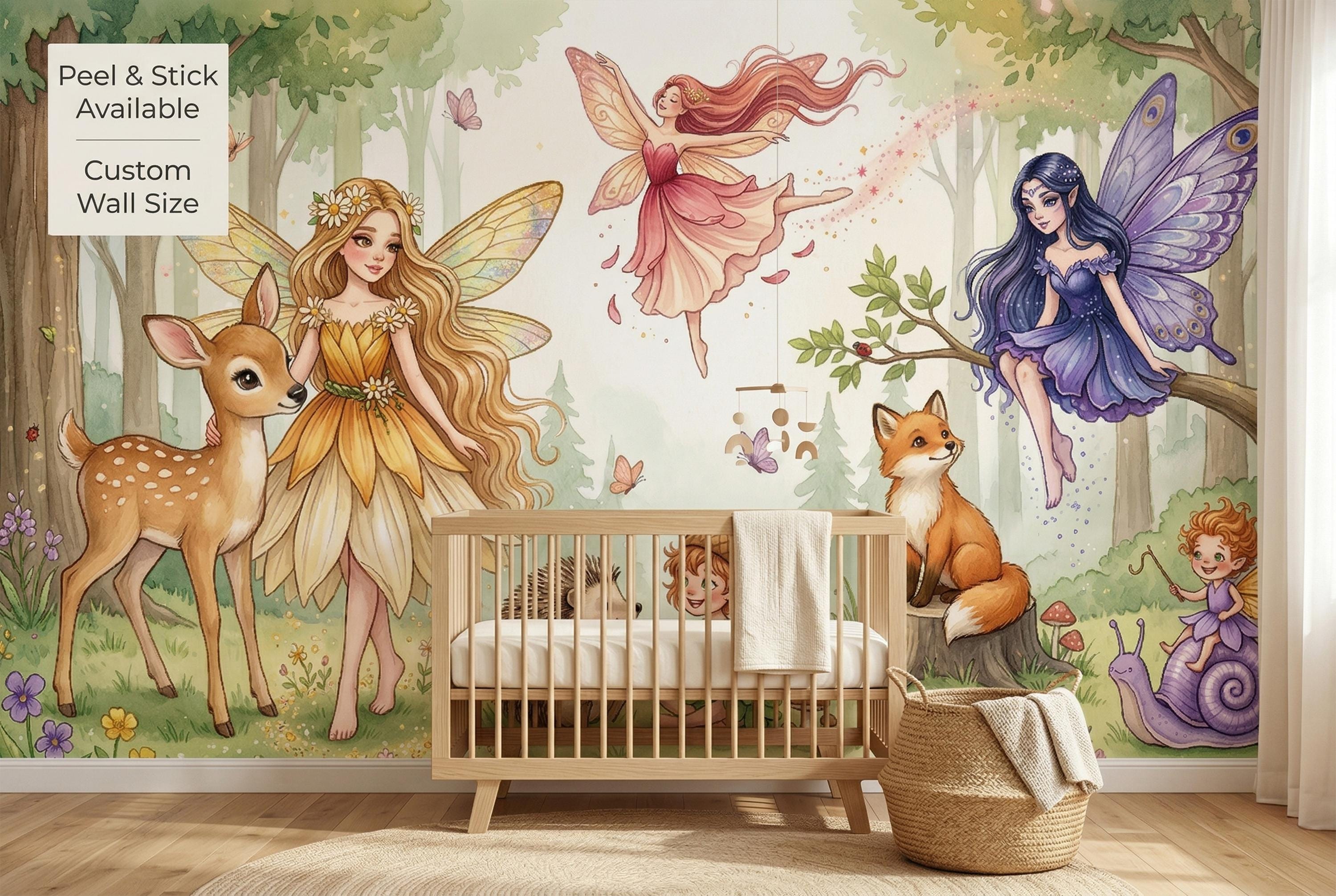 Close your eyes and imagine your little one waking up surrounded by gentle fairies, curious woodland creatures, and the soft glow of an enchanted forest. This wallpaper mural transforms any nursery, bedroom, or playroom into a magical realm where imagination has no limits.