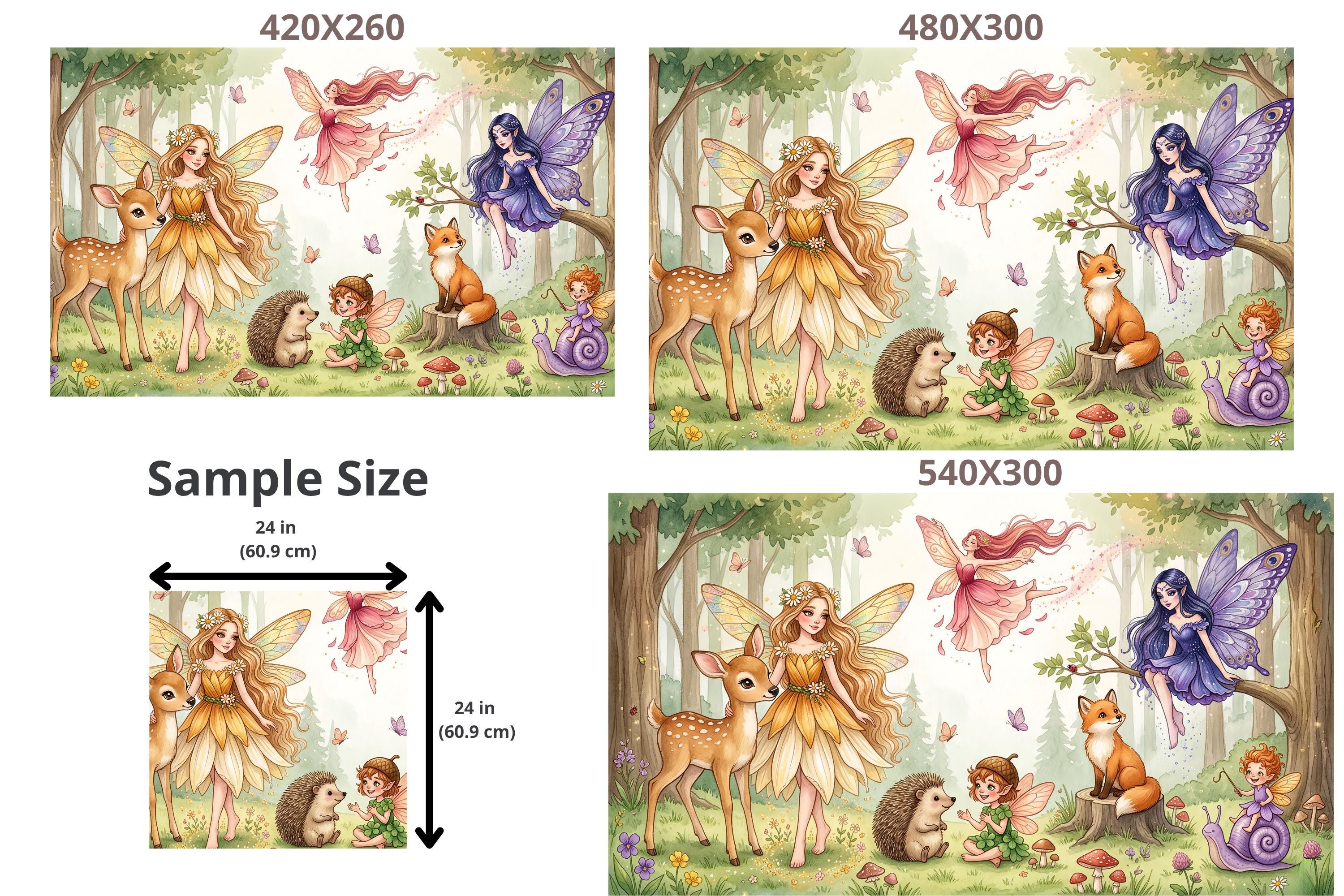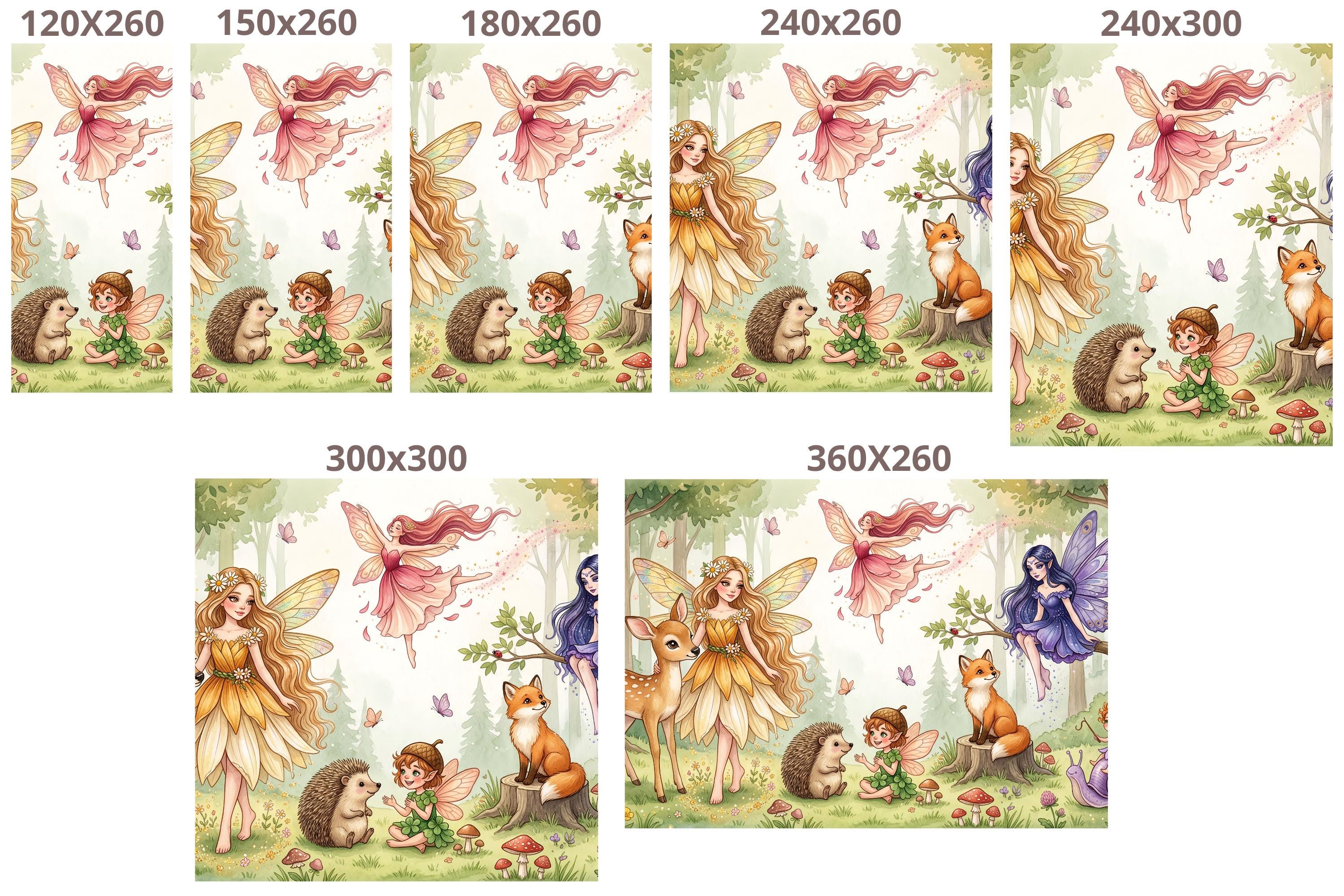 Hand-illustrated in a delicate watercolor style, this design features graceful fairies dancing among the trees, a sweet fawn, a playful fox, a tiny hedgehog, fluttering butterflies, and whimsical mushrooms — all painted in a dreamy palette of soft pinks, lavenders, greens, and warm golds.