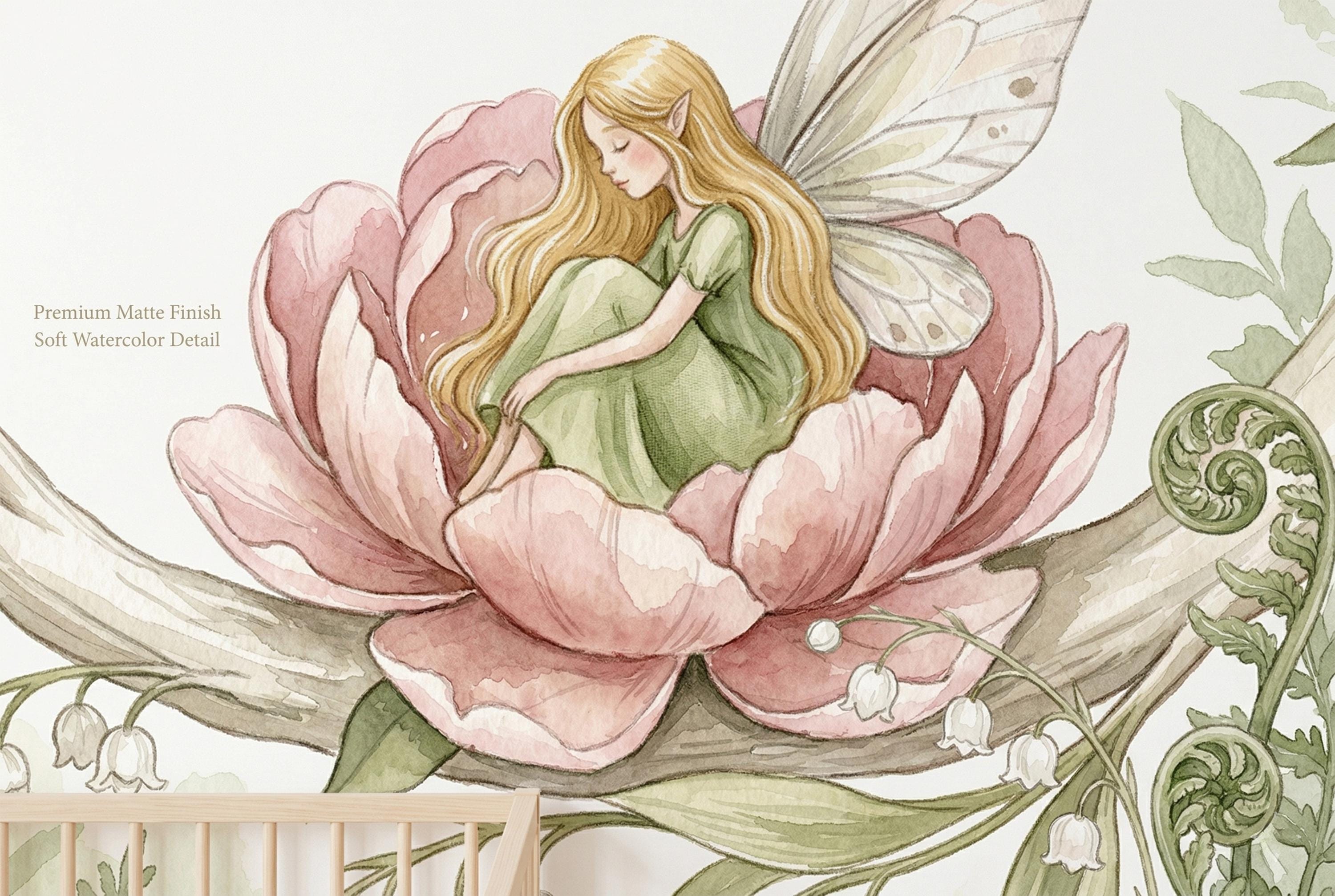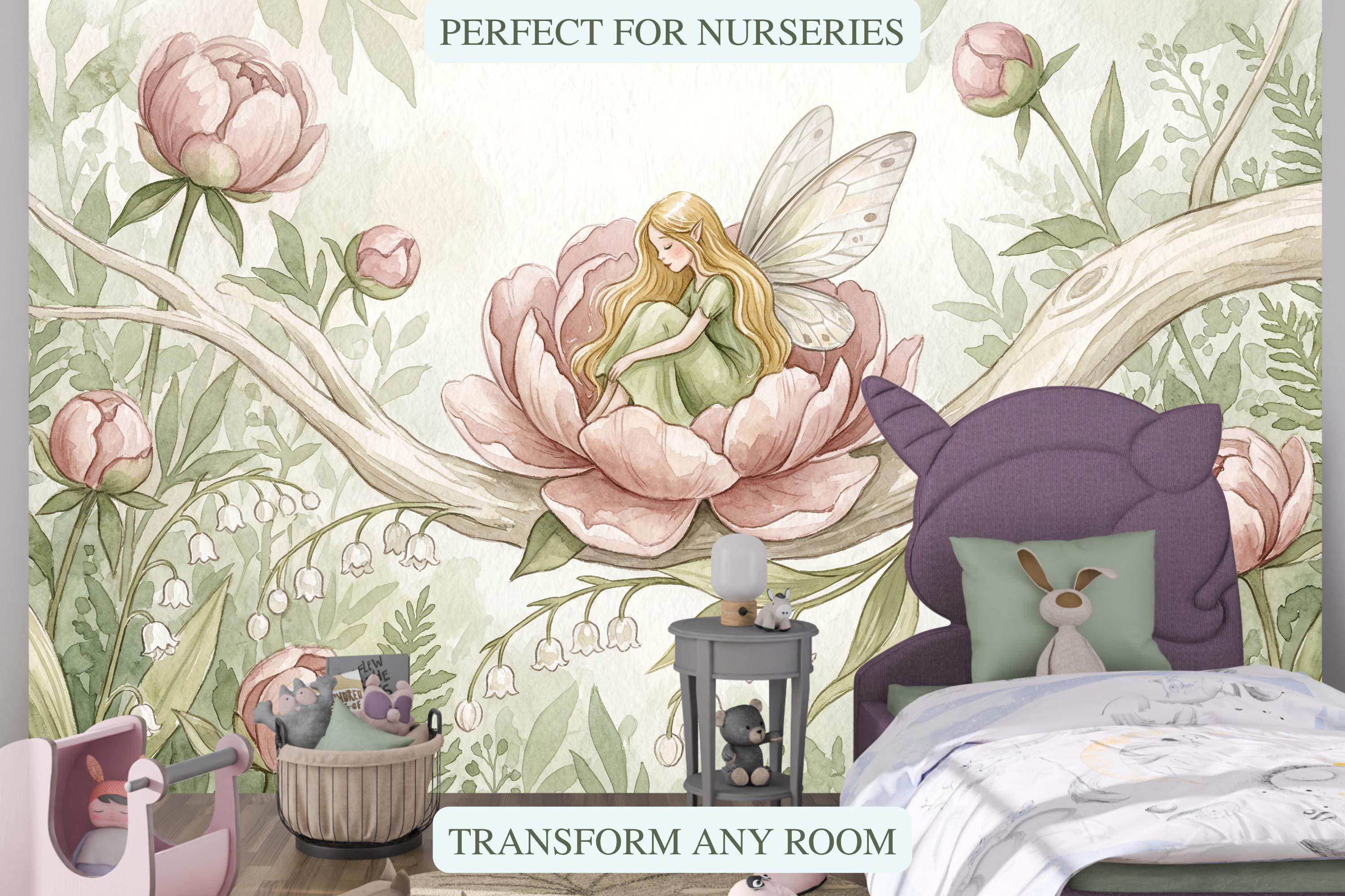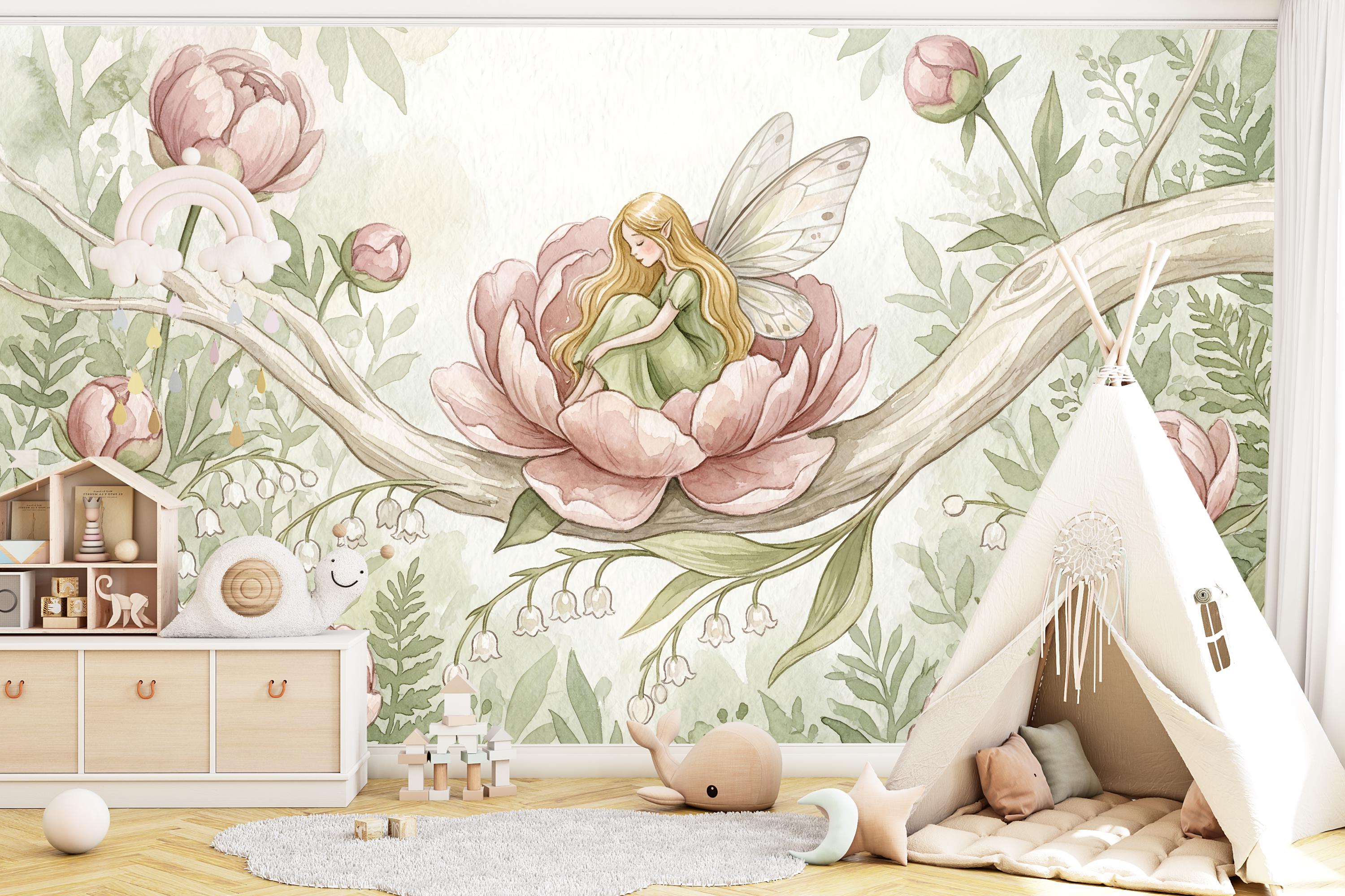This wallpaper mural is a love letter to childhood imagination. Painted in soft watercolor washes of blush pink, sage green, and creamy ivory, it turns any wall into a living storybook illustration — the kind of scene your child will gaze at before sleep and dream about until morning.
