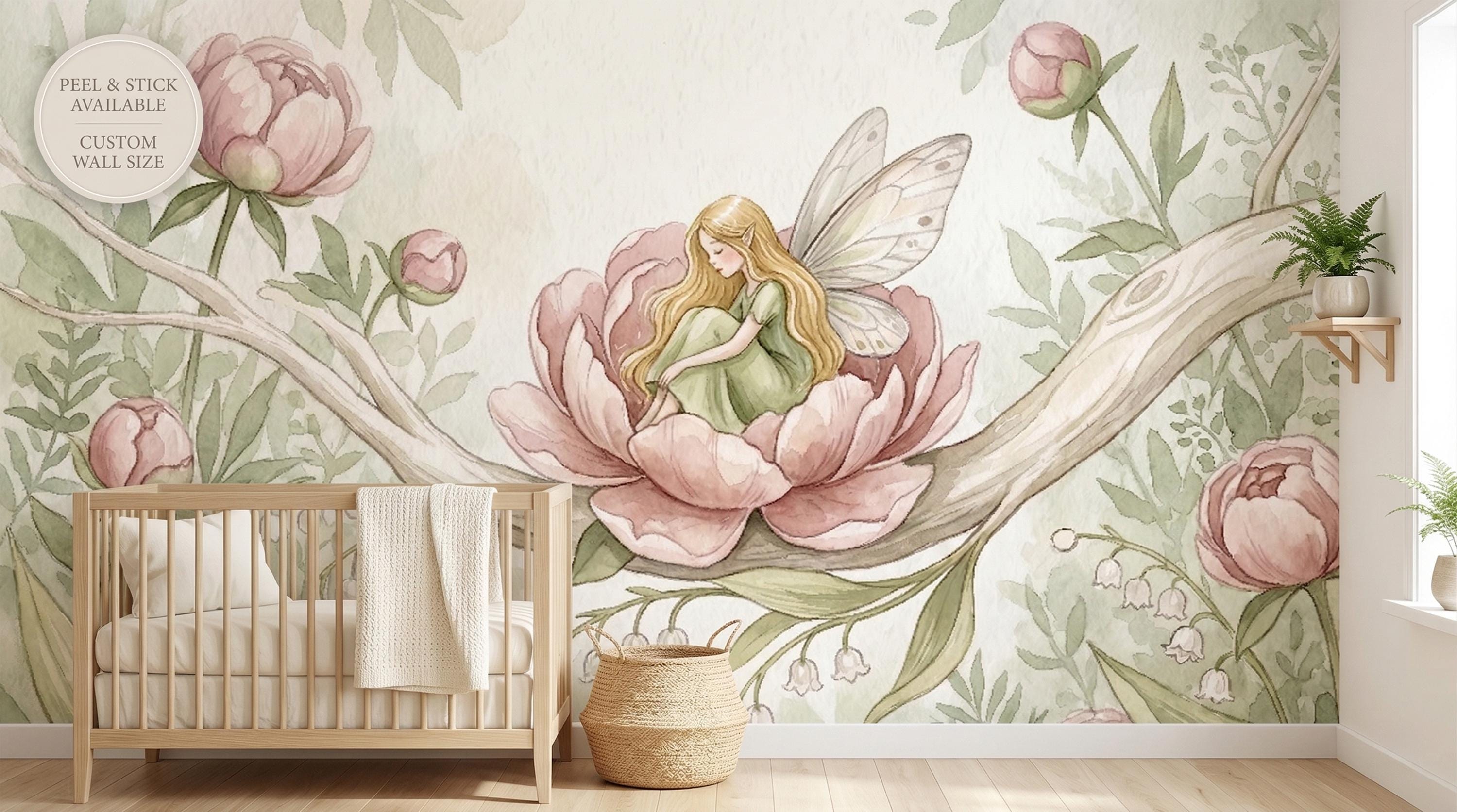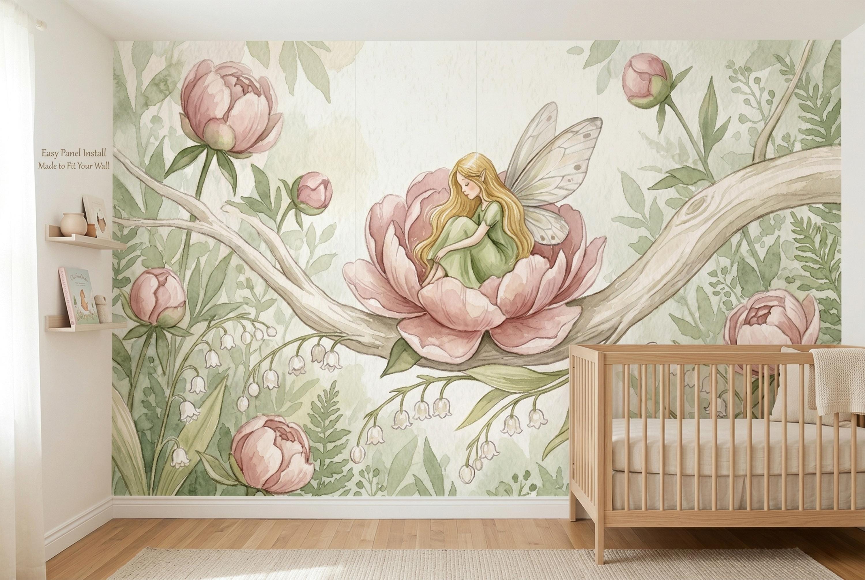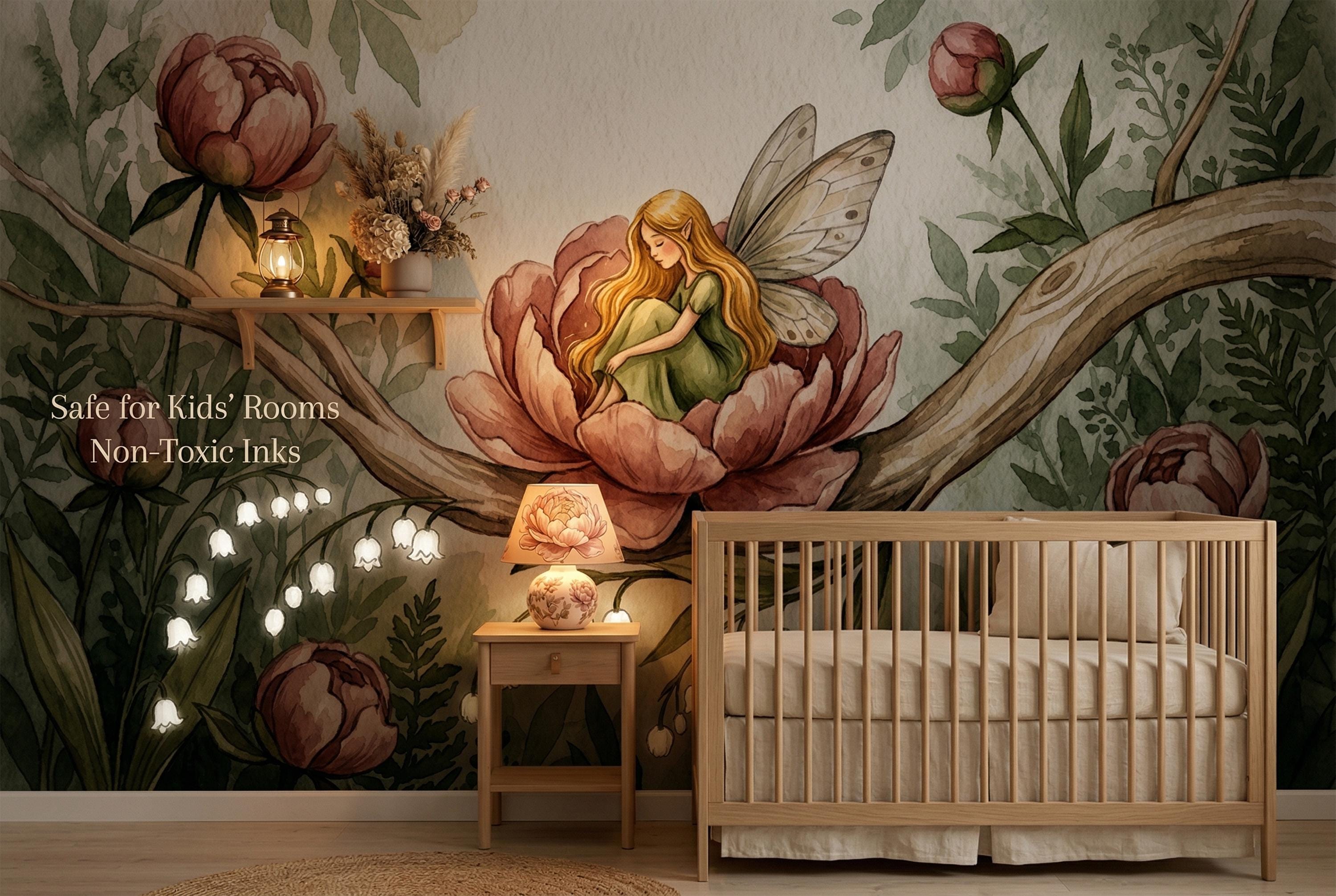 This wallpaper mural is a love letter to childhood imagination. Painted in soft watercolor washes of blush pink, sage green, and creamy ivory, it turns any wall into a living storybook illustration — the kind of scene your child will gaze at before sleep and dream about until morning.