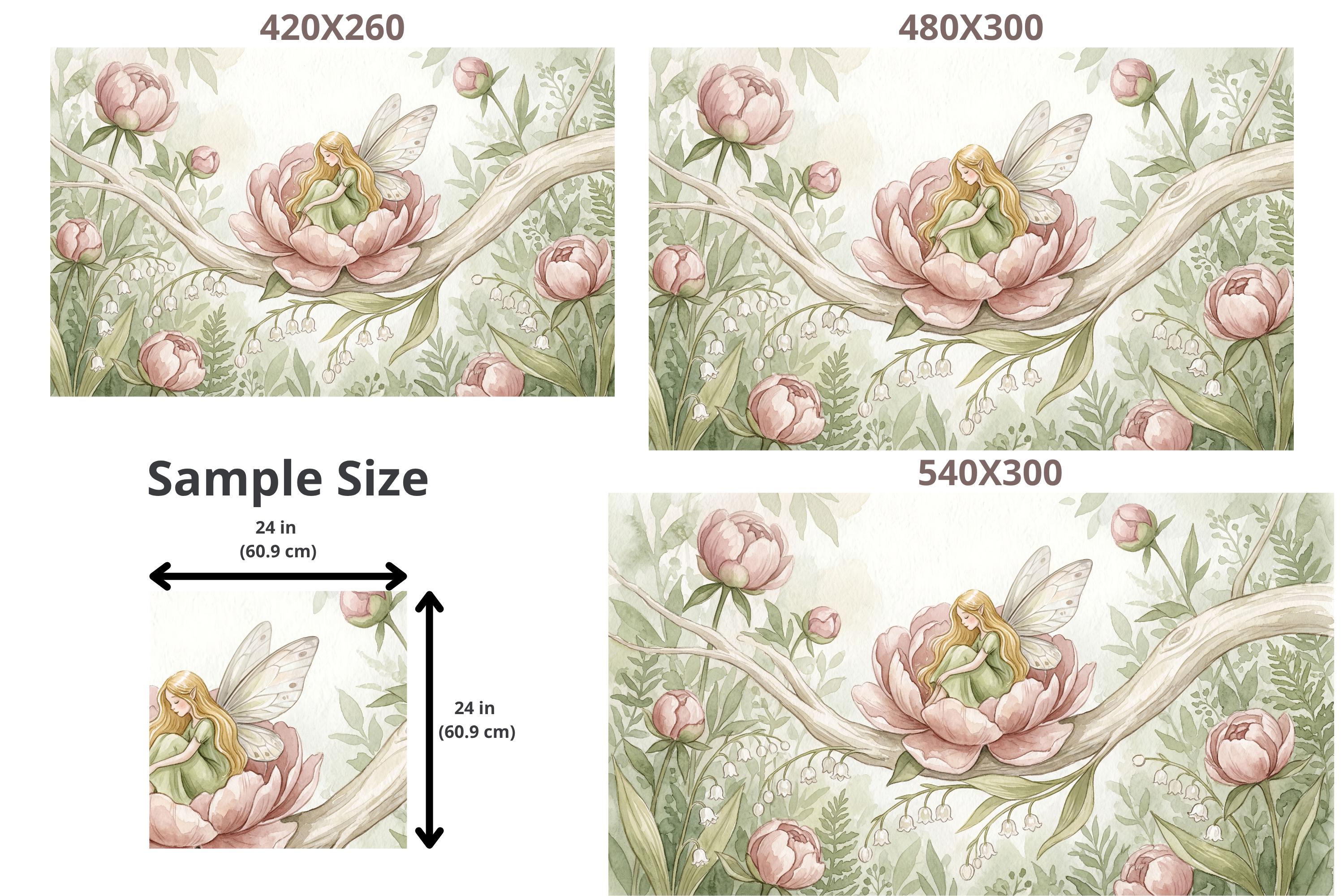 Nestled deep inside the velvet folds of a blooming peony, a tiny fairy with golden hair rests in quiet wonder. Around her, buds wait to open, lily of the valley bells chime silently in the breeze, and fern fronds unfurl like whispered secrets.