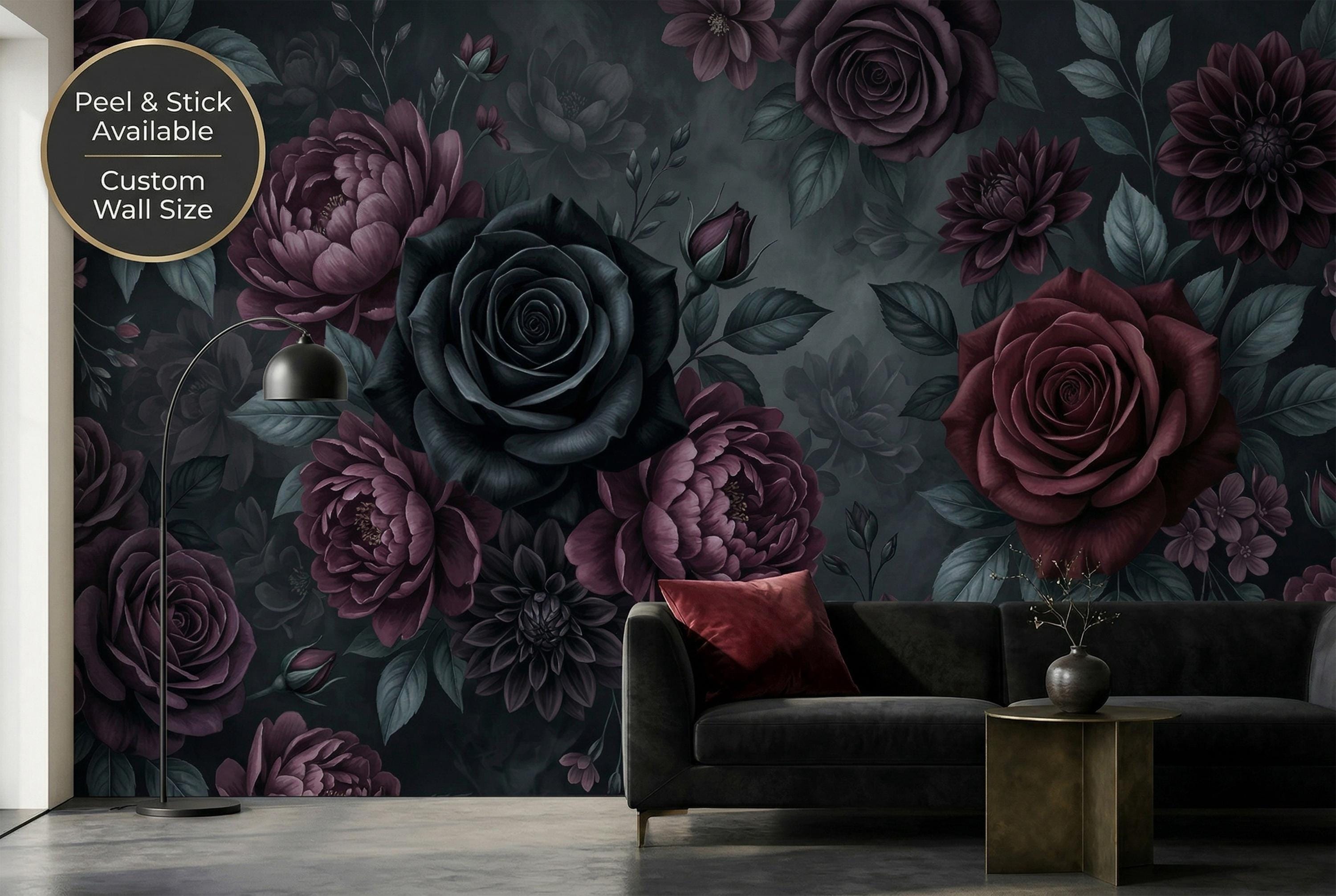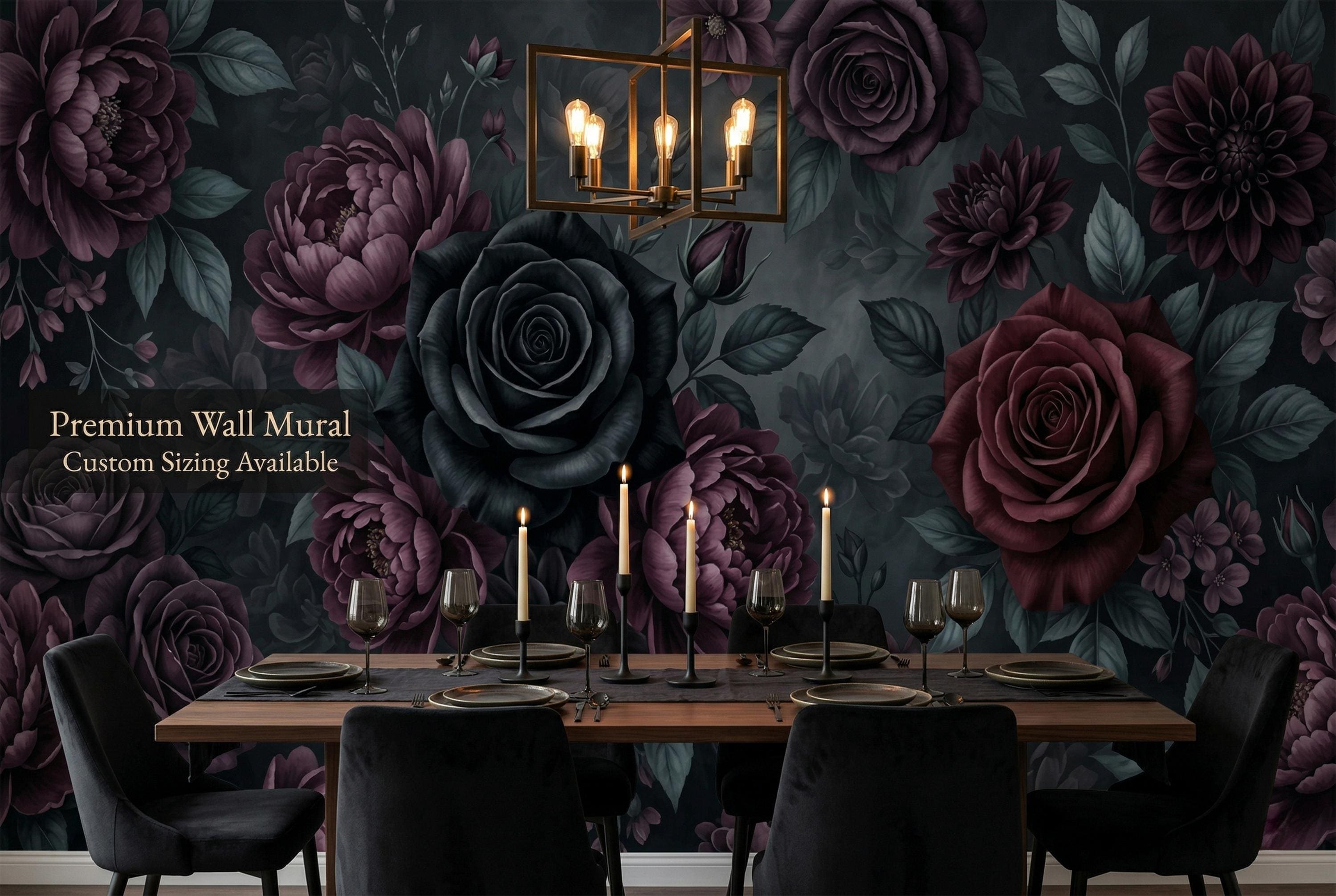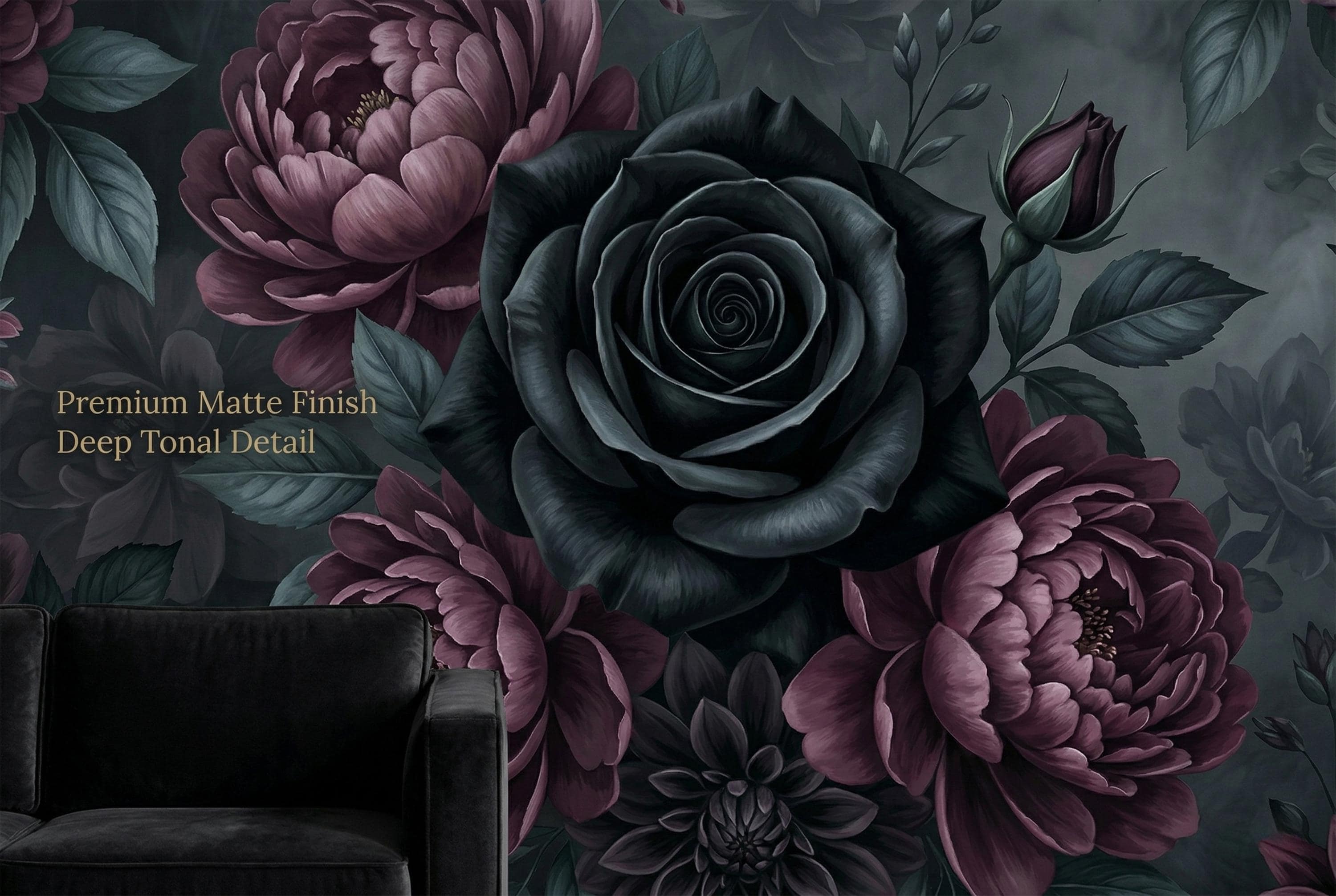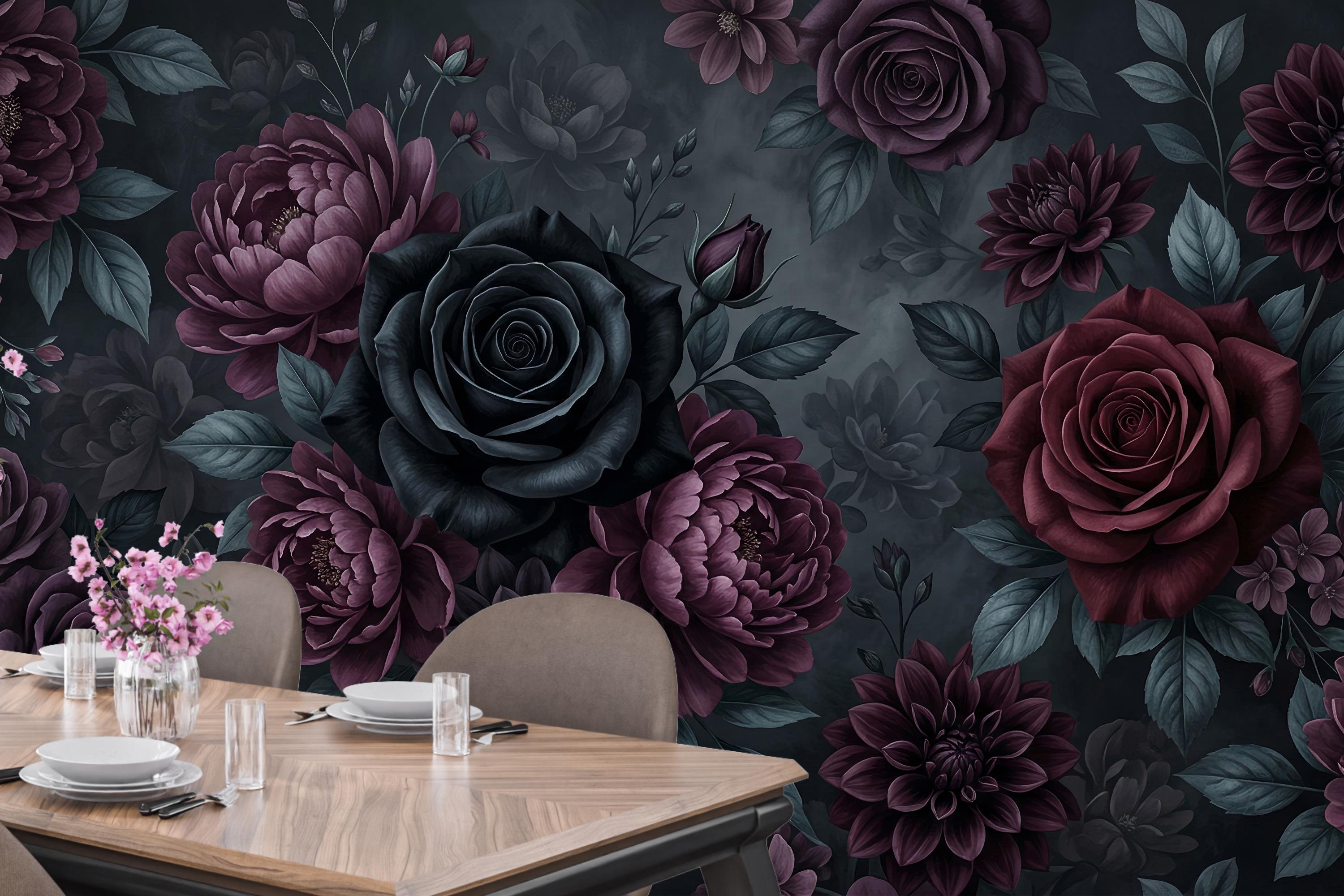 There is a kind of elegance that only darkness can hold. Deep, velvety black roses unfurl beside rich burgundy peonies and dusky purple dahlias, their petals heavy with mystery. Dark teal leaves emerge from smoky, ink-black depths — not a garden, but a mood. A feeling. A statement.
