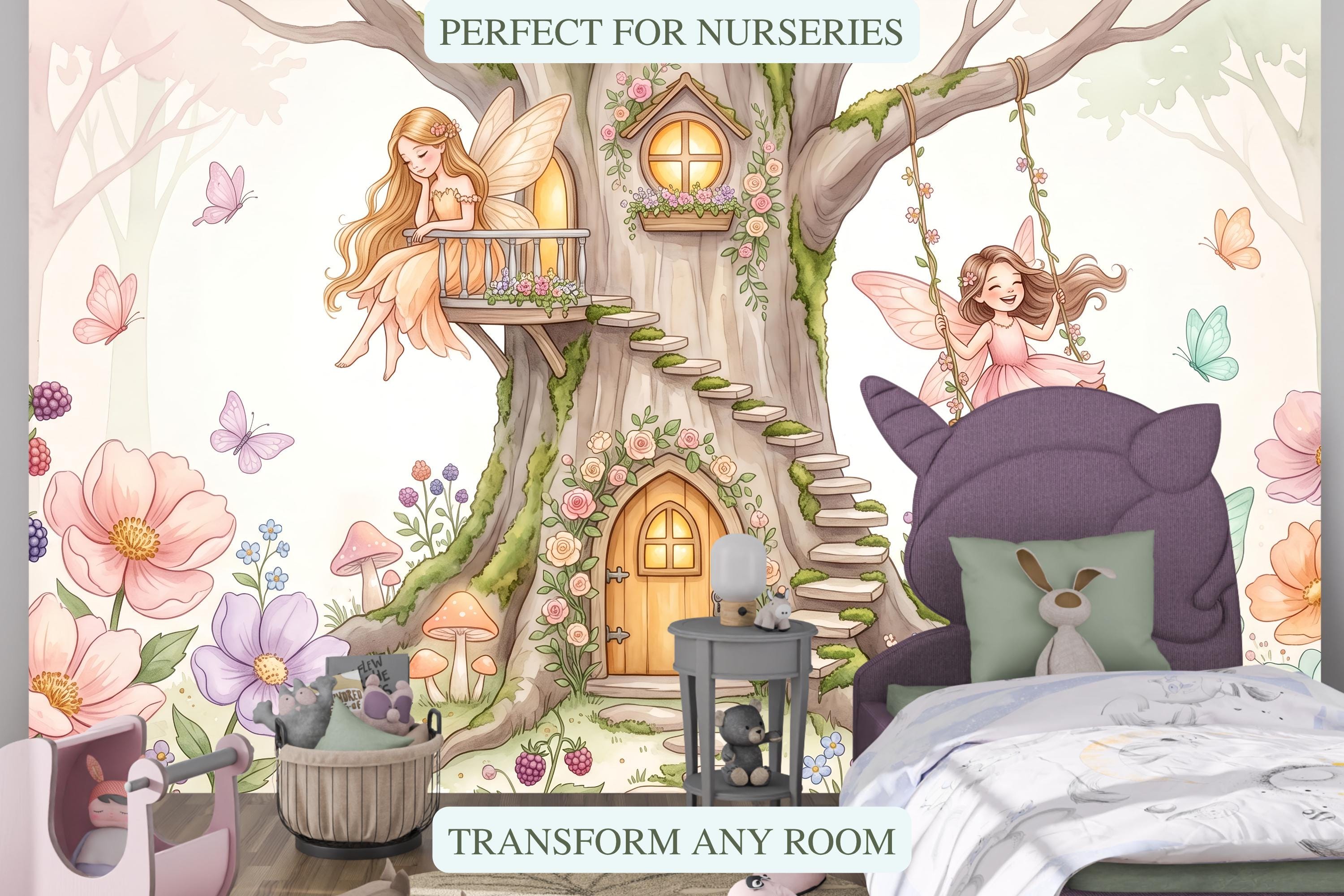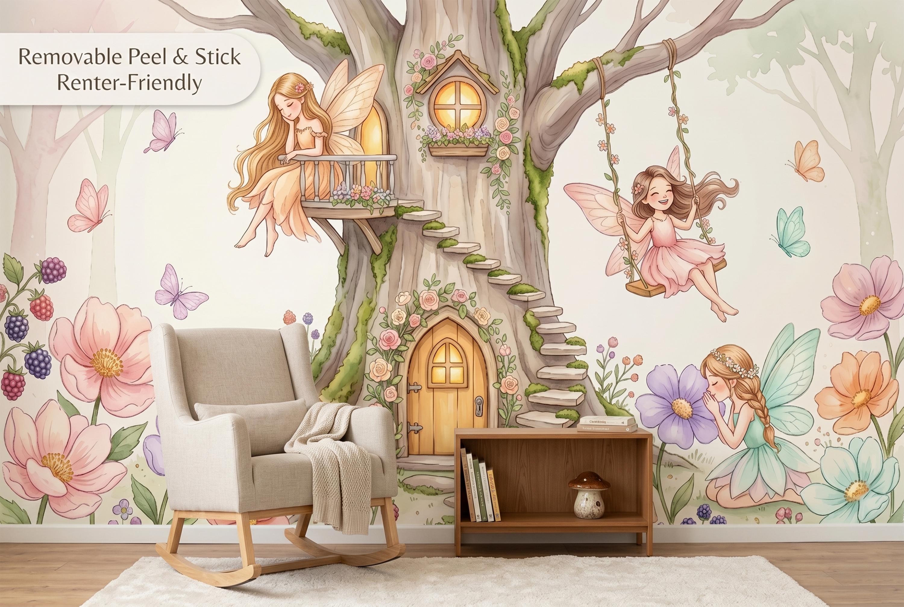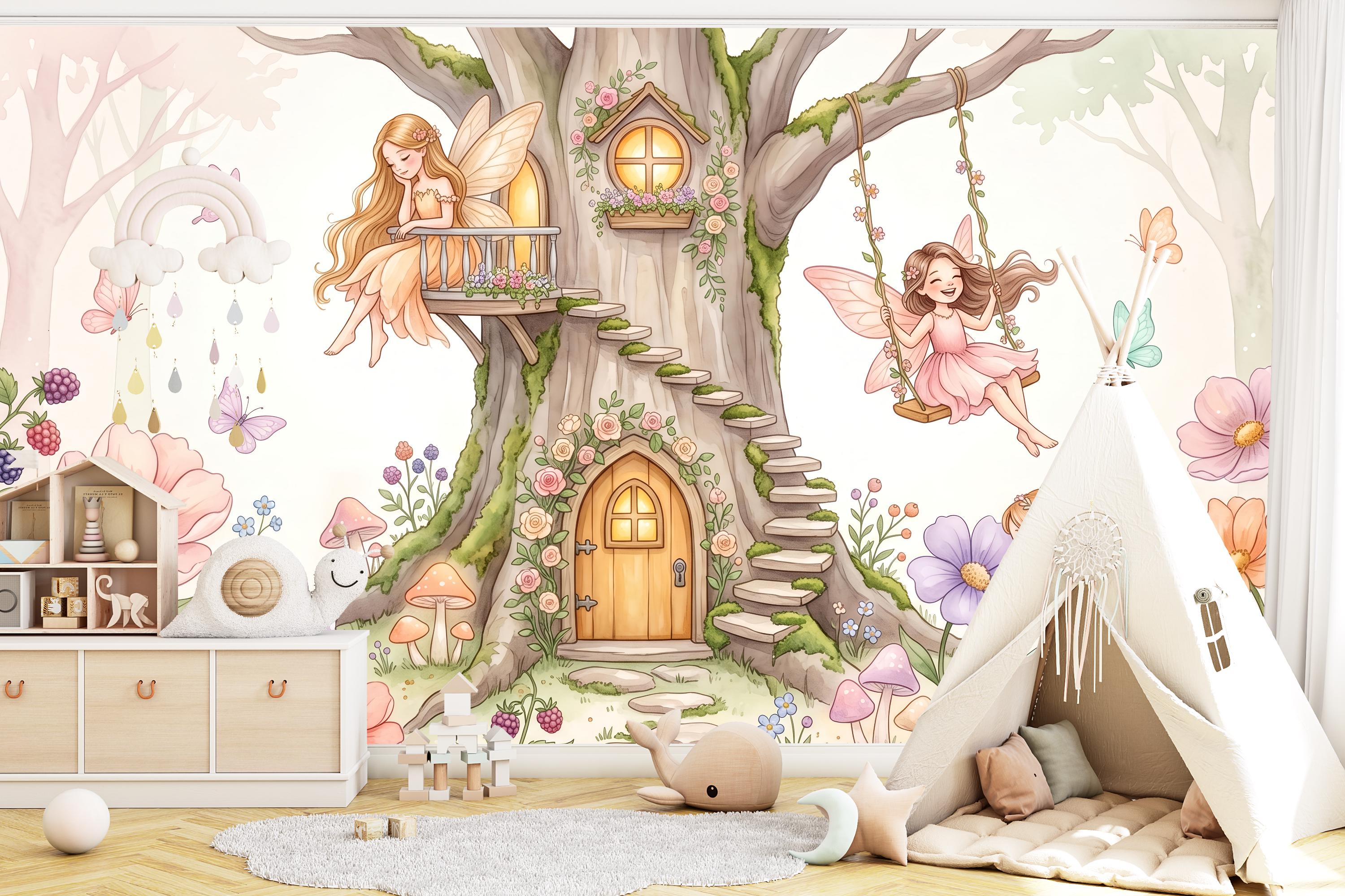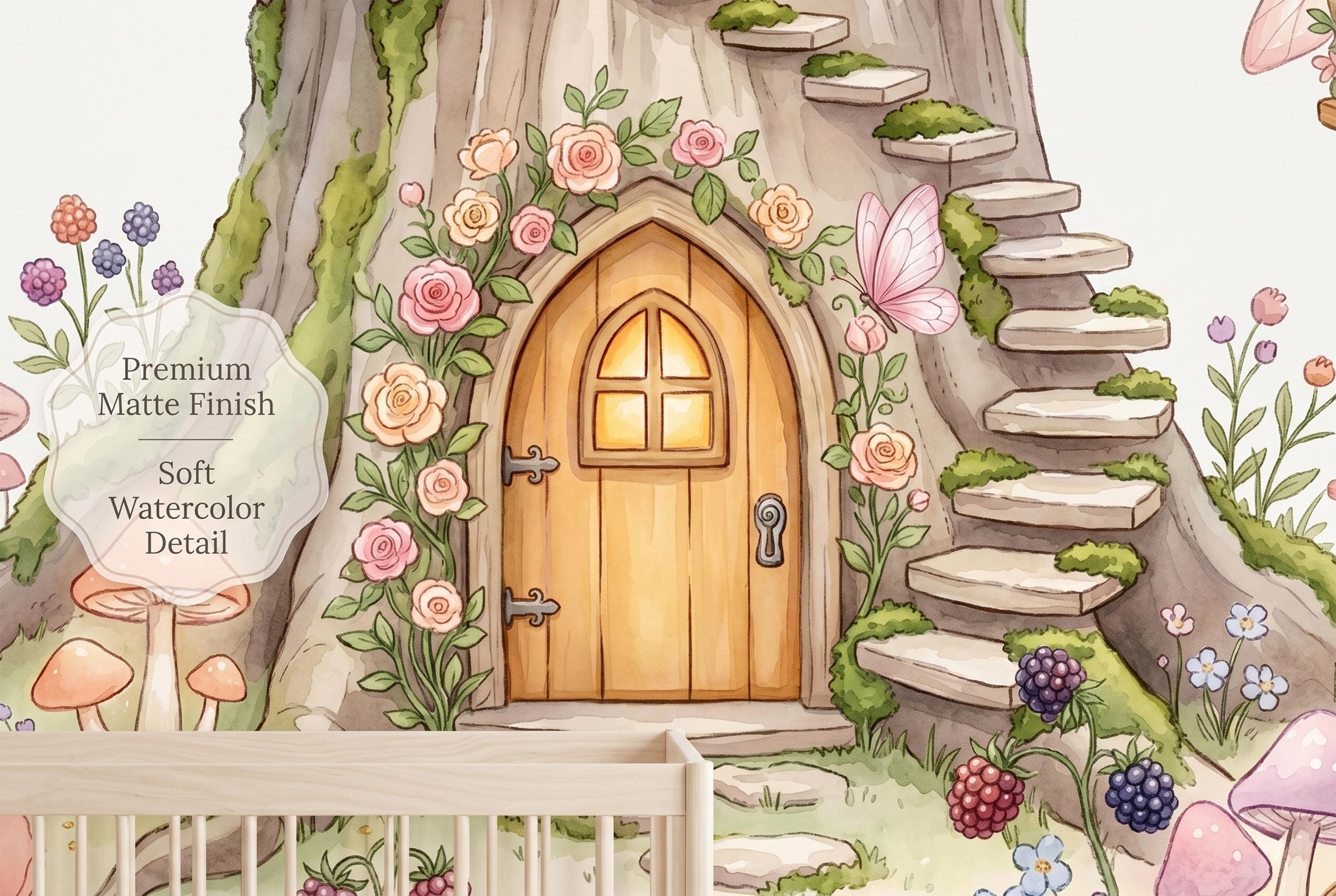 This wallpaper mural is pure childhood joy. Every inch holds a secret to discover — a hidden mushroom, a resting butterfly, a tiny glowing window. It turns an ordinary wall into a world children never tire of exploring.