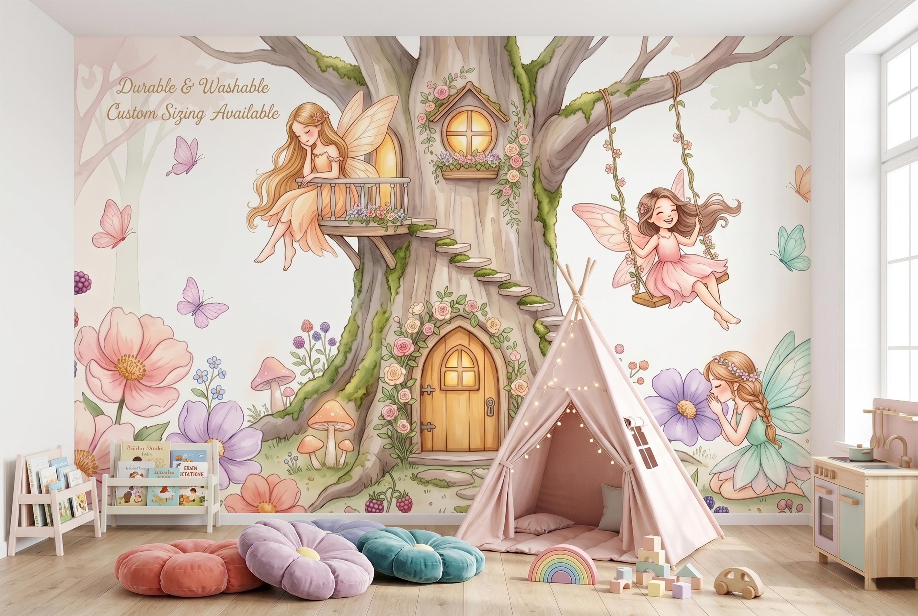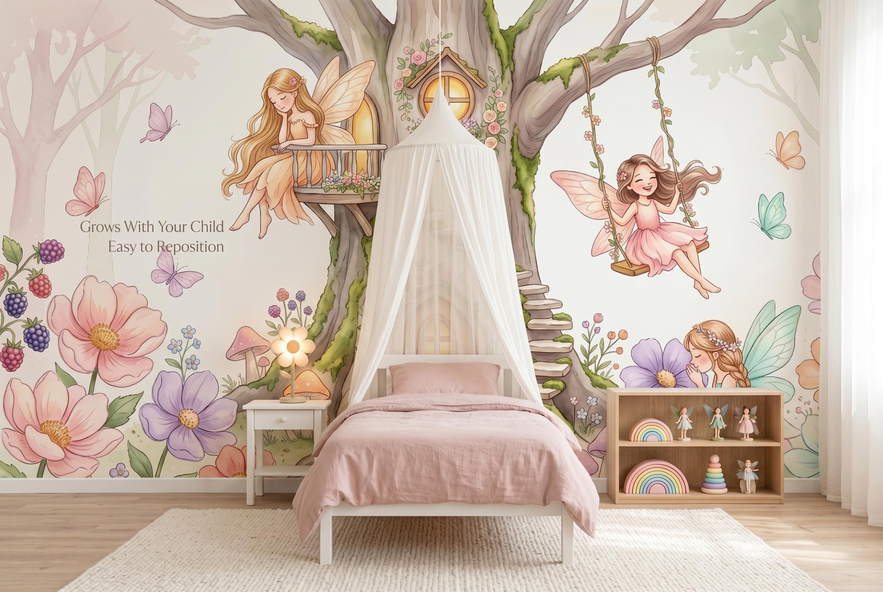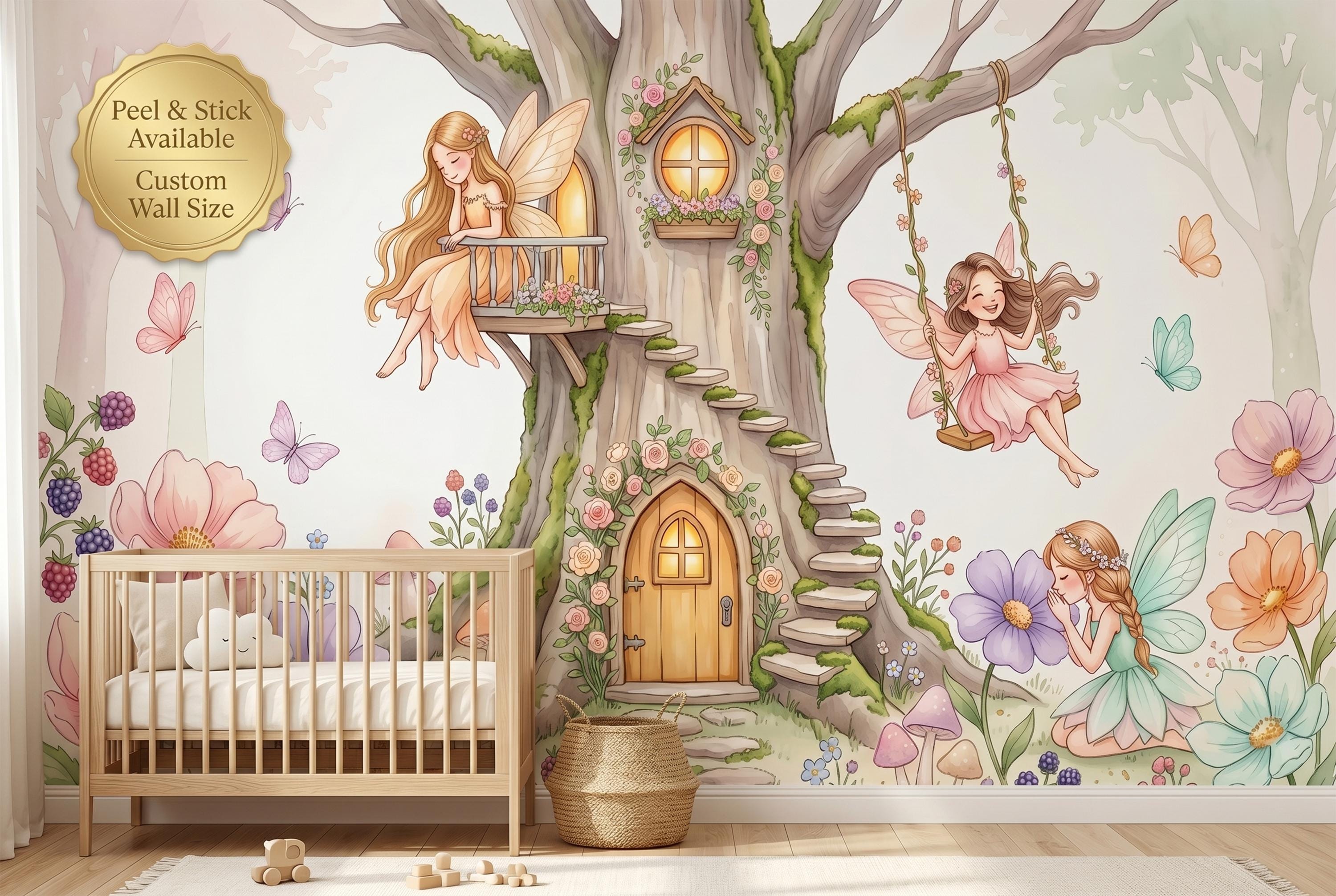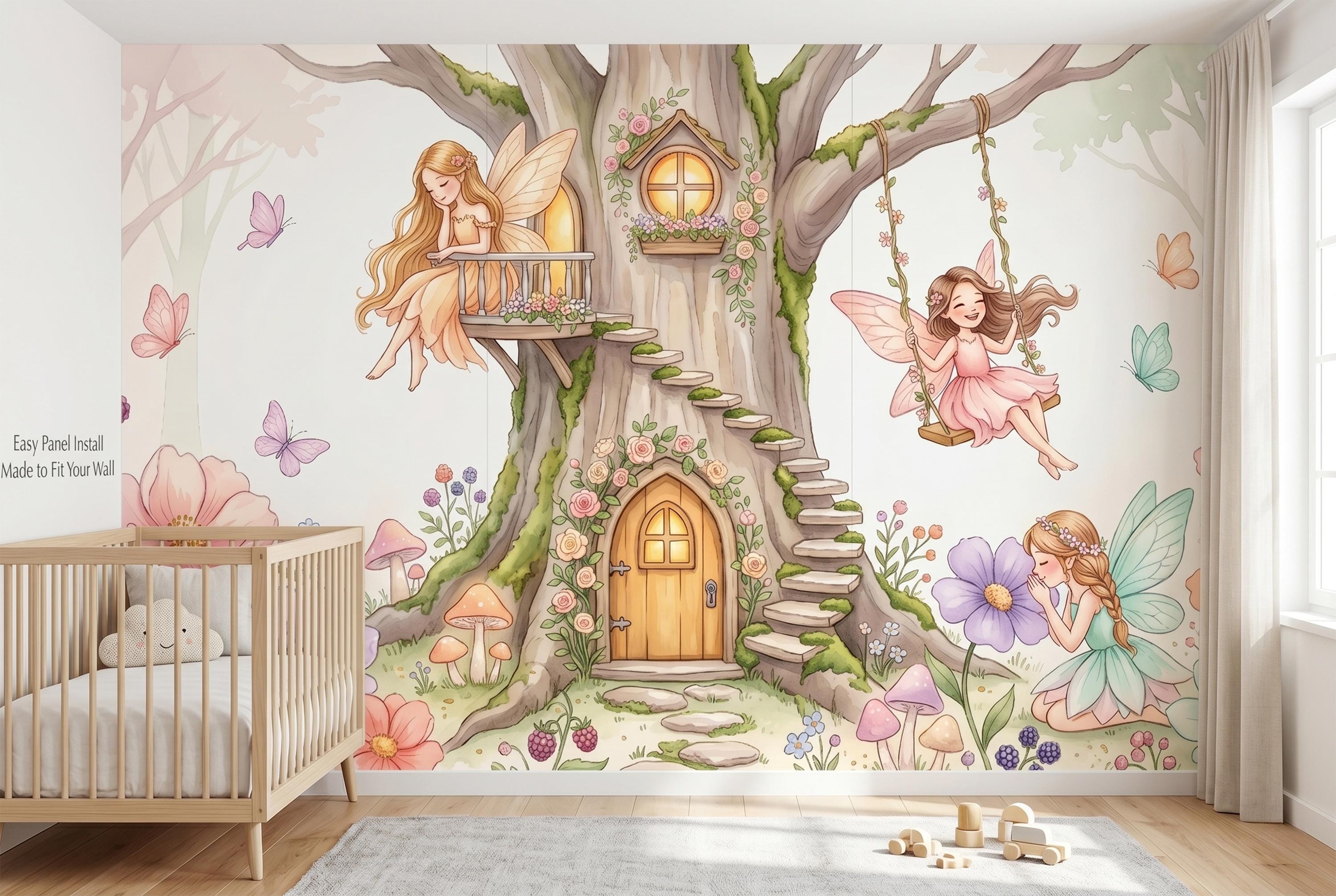 This wallpaper mural is pure childhood joy. Every inch holds a secret to discover — a hidden mushroom, a resting butterfly, a tiny glowing window. It turns an ordinary wall into a world children never tire of exploring.