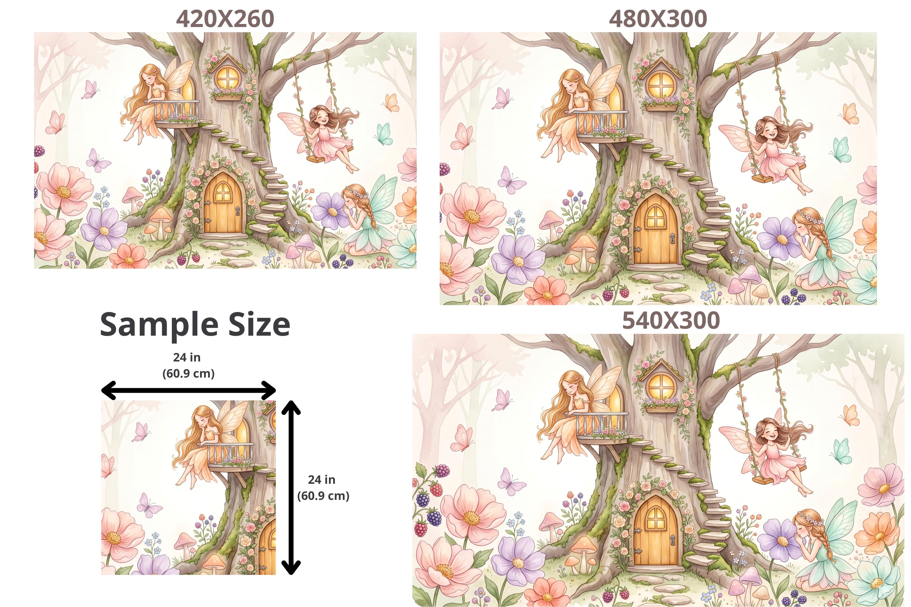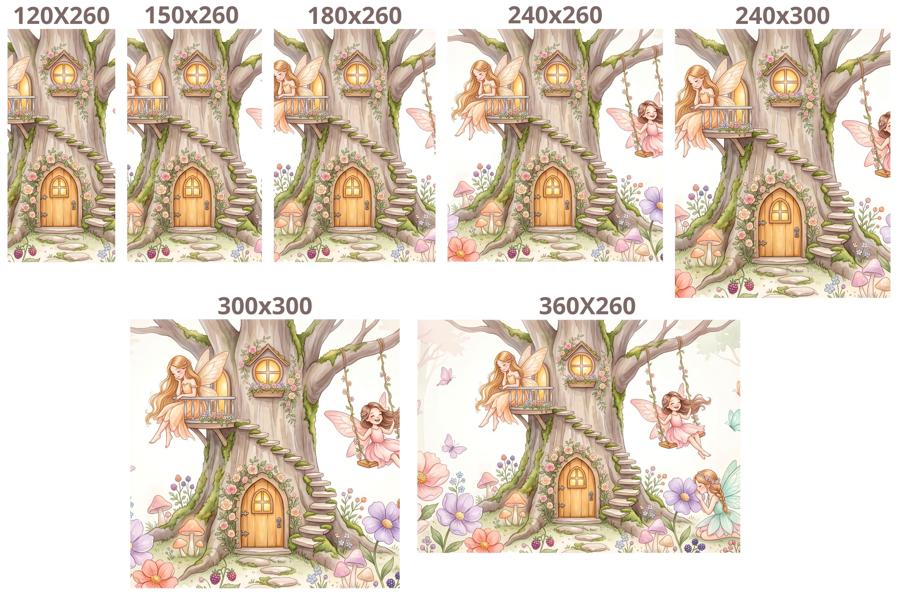 At the base of an ancient tree, a golden door glows warmly. Mossy stone steps wind upward past flower boxes and climbing roses to a little balcony, where a fairy with long golden hair gazes peacefully at the garden below. On the other side, a laughing fairy swings from a vine, her pink dress catching the breeze. Near the roots, a third fairy leans close to smell a giant purple blossom.