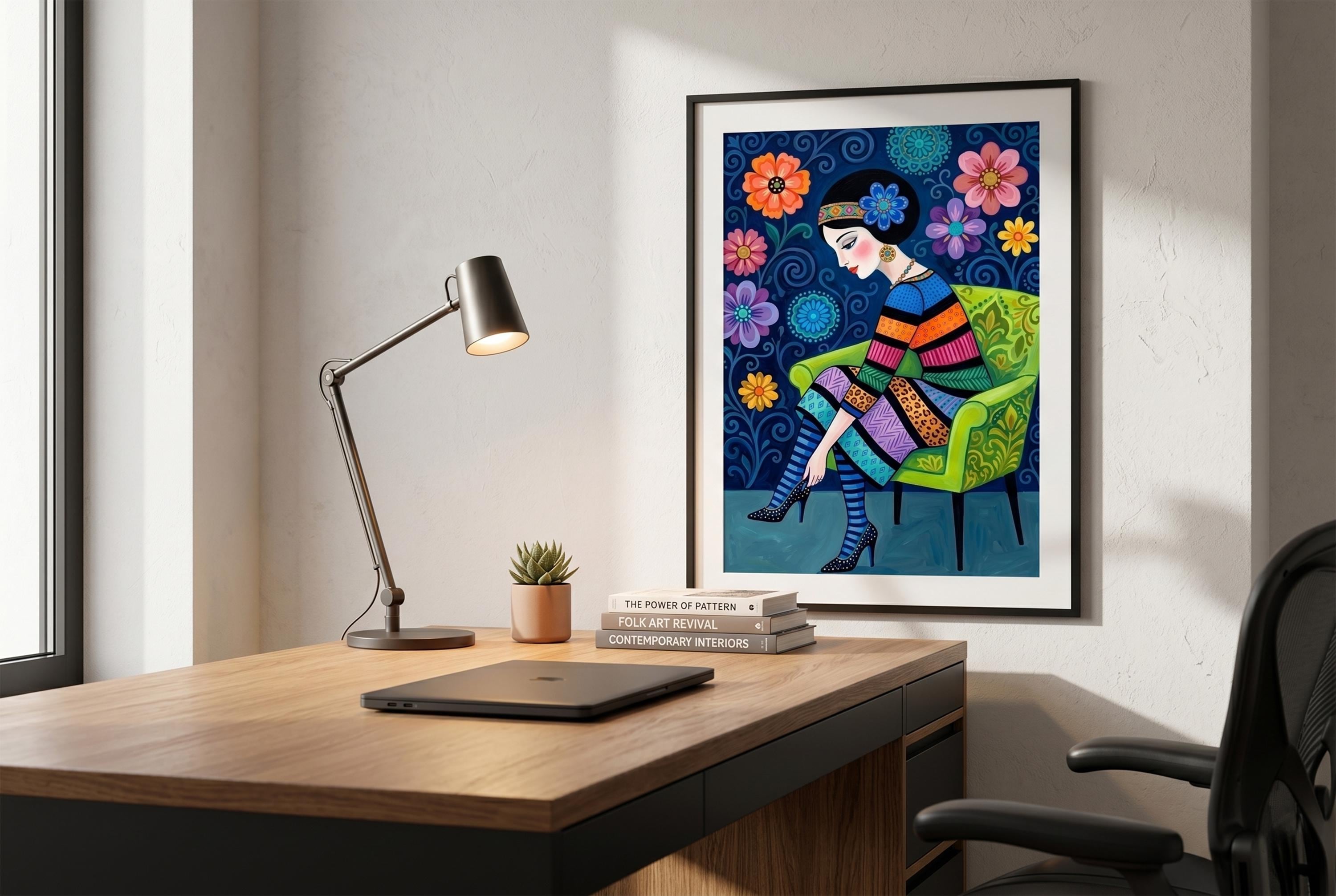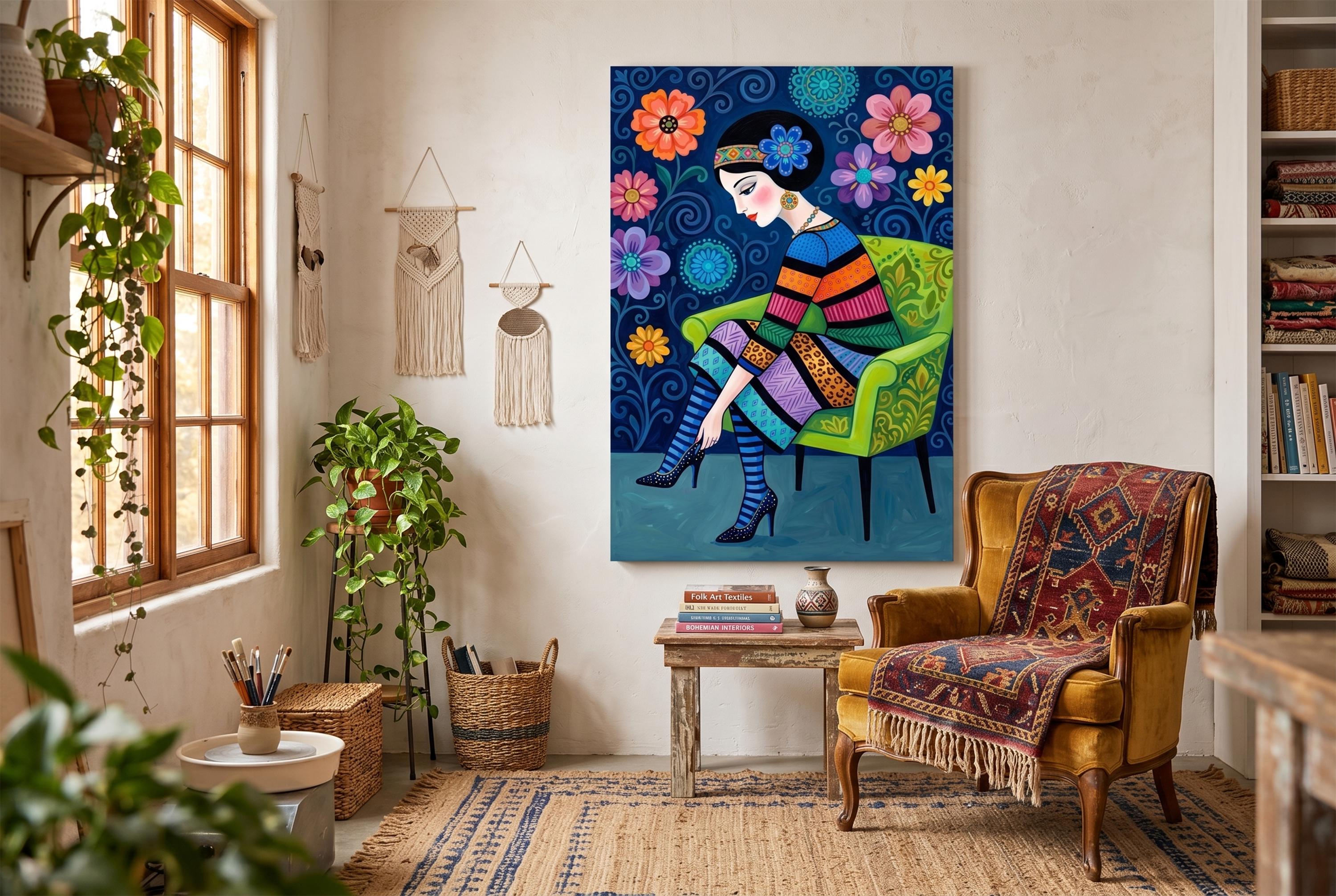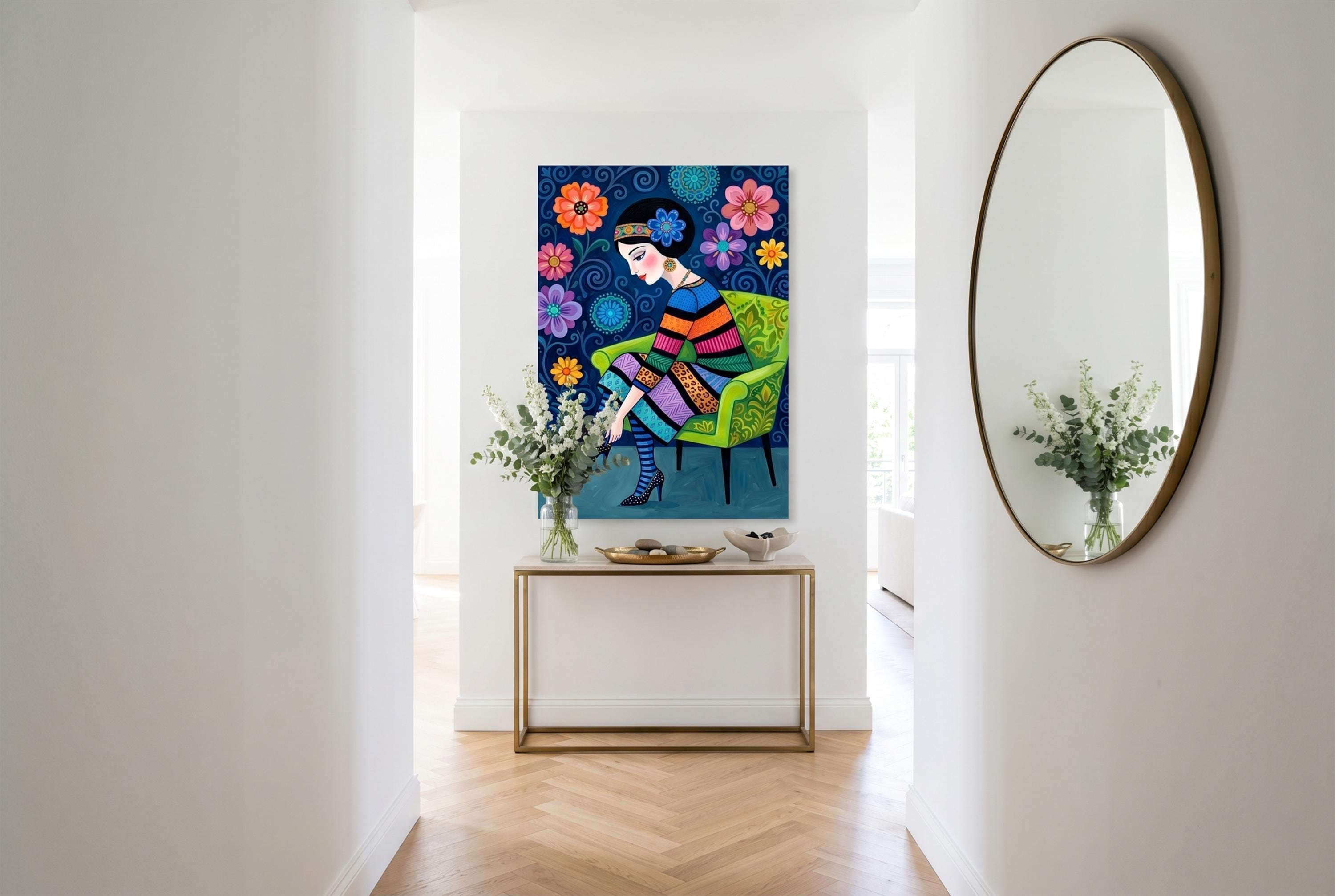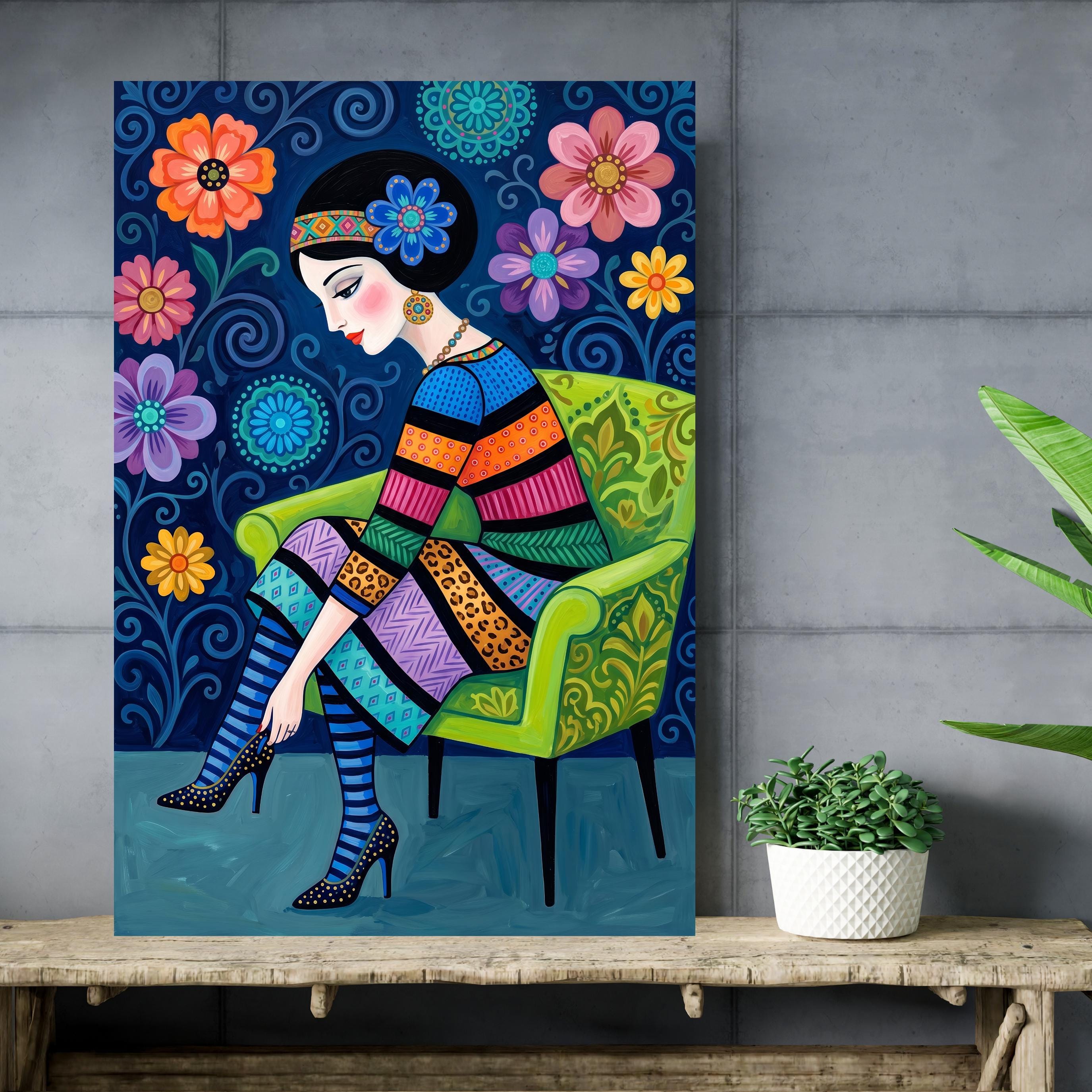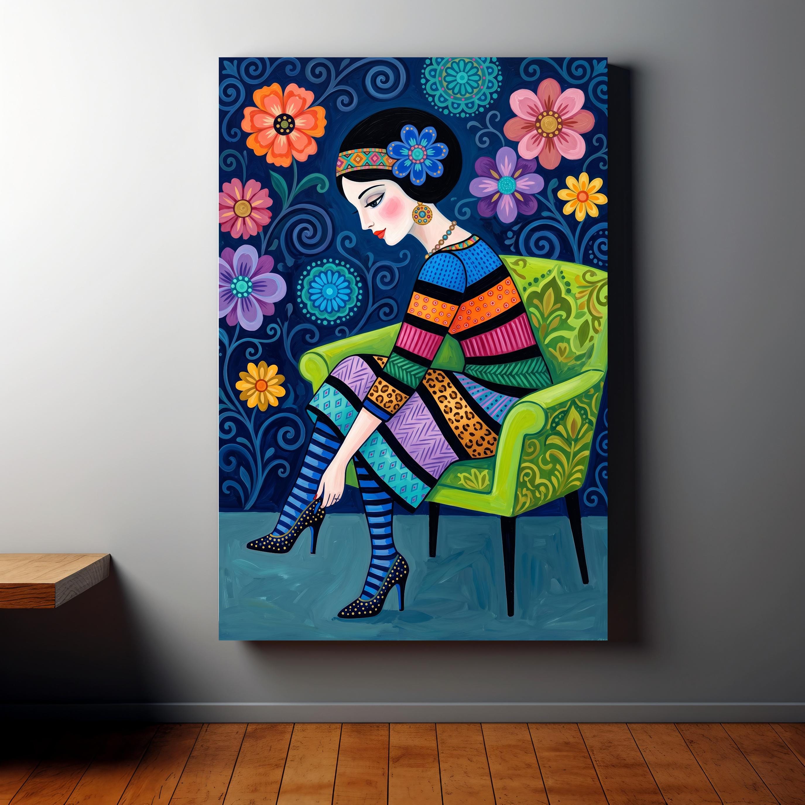 Perched on a lime-green damask armchair, she adjusts her studded heel with quiet confidence. Her dress is a patchwork of patterns — leopard print, chevron, stripes, polka dots — bold, unapologetic, and entirely her own. Around her, oversized folk flowers bloom against a deep navy sky, while mandalas and spirals swirl like music made visible.