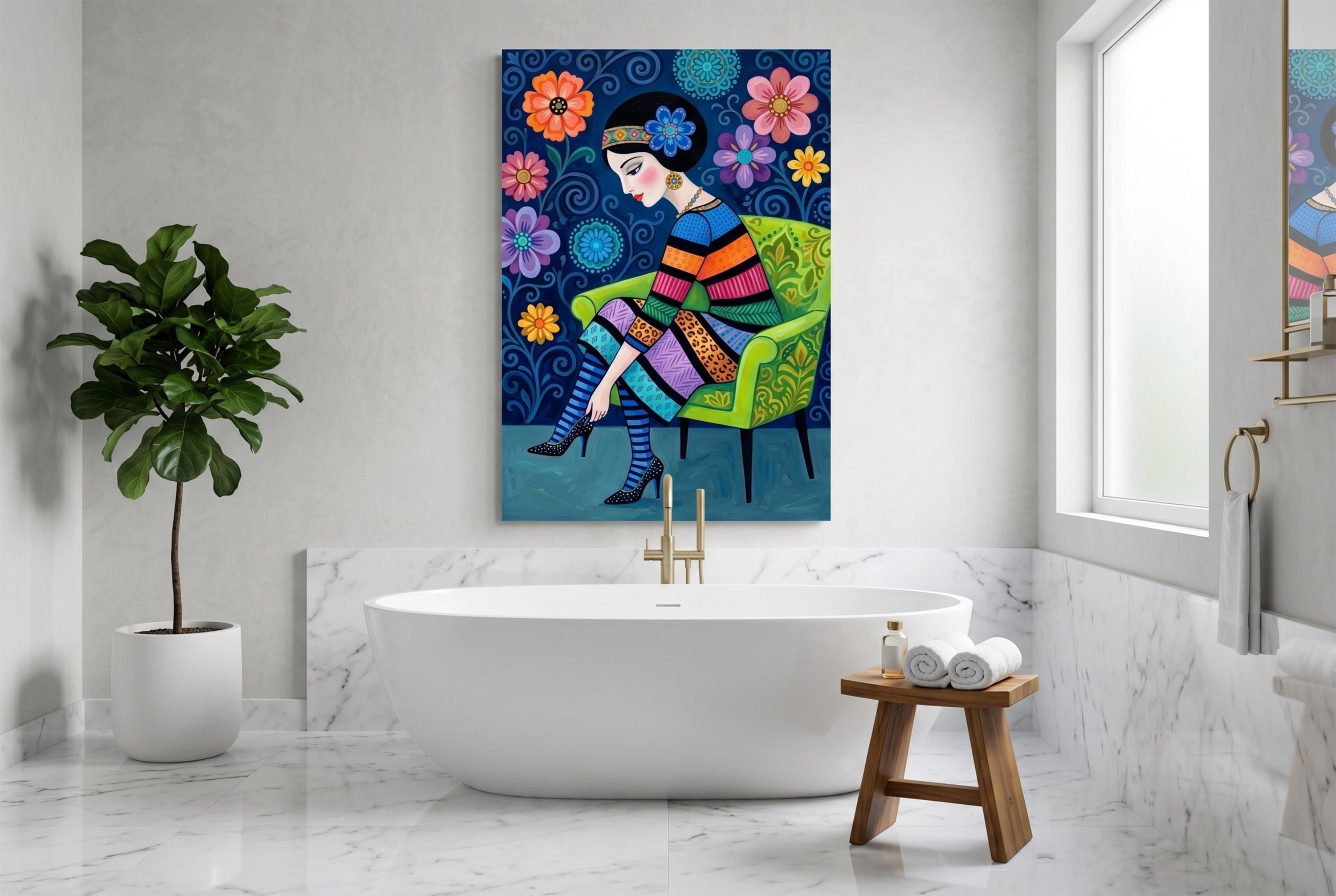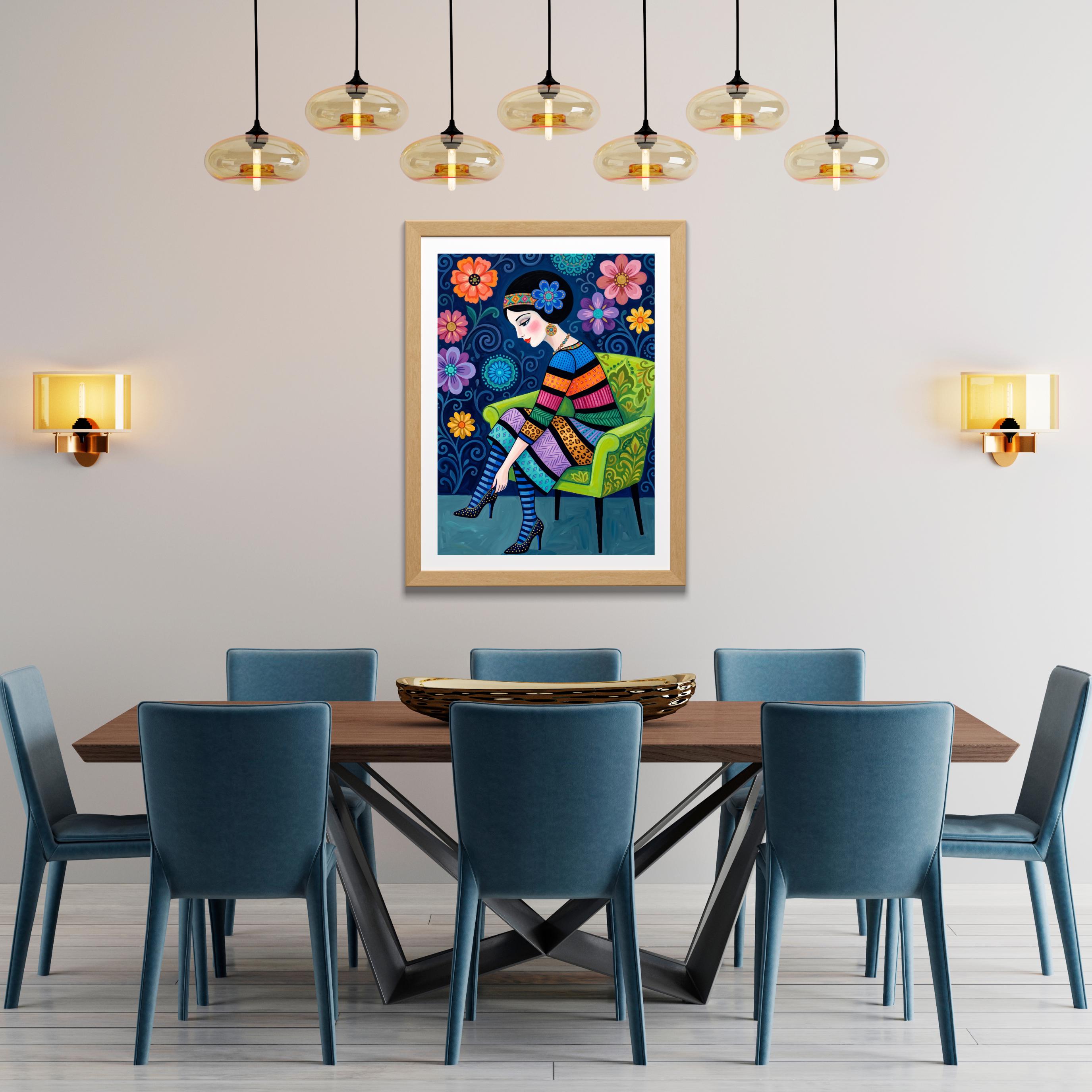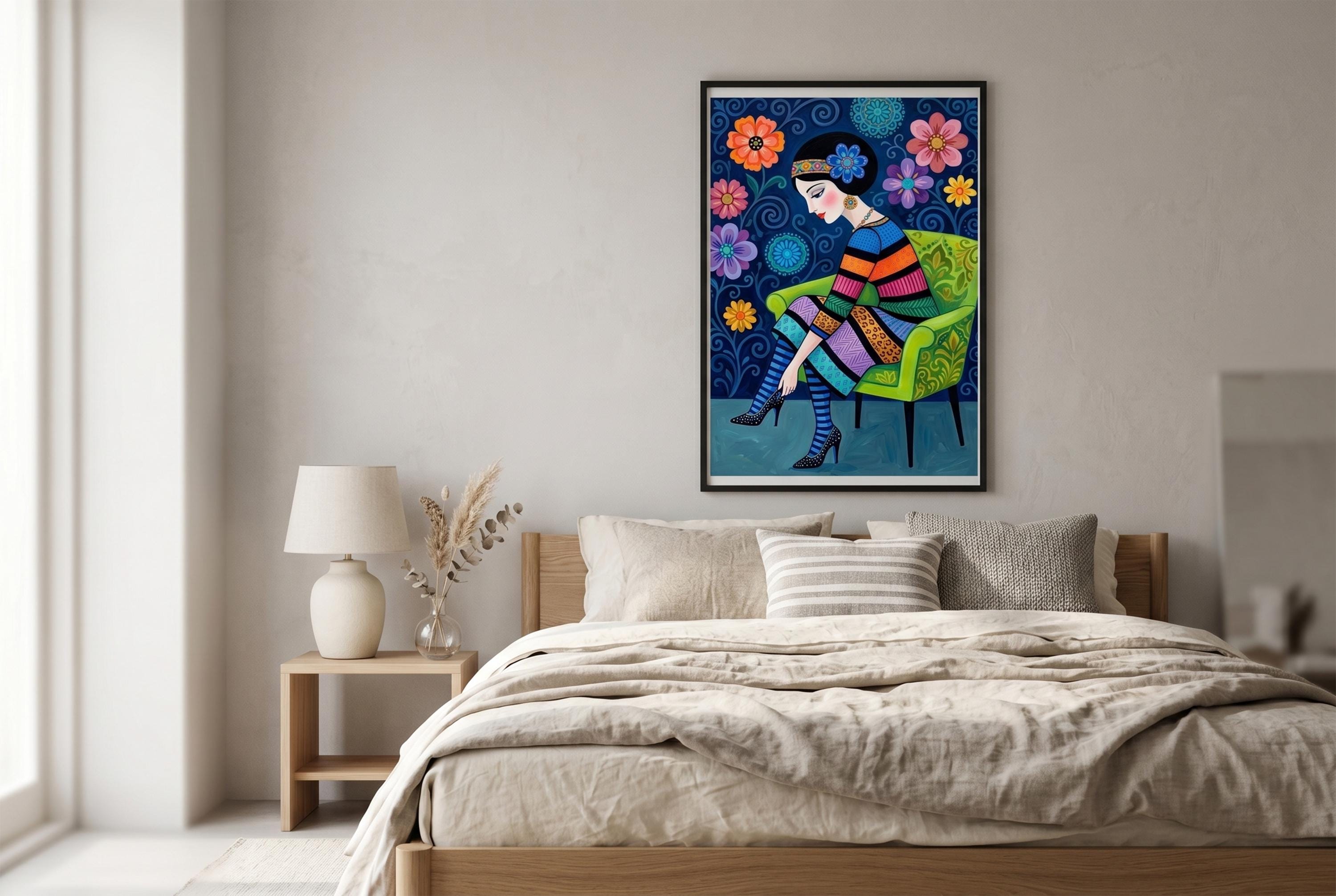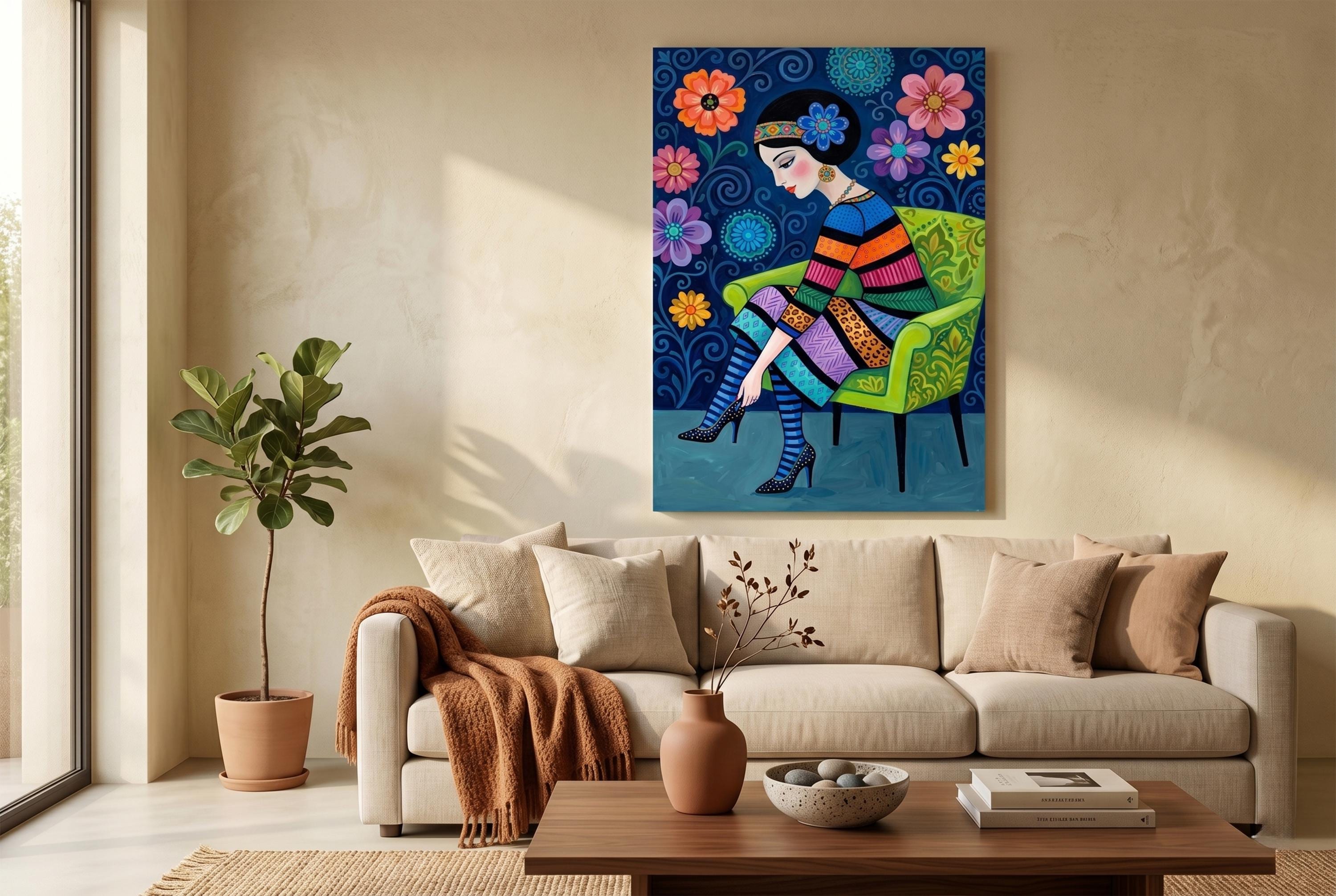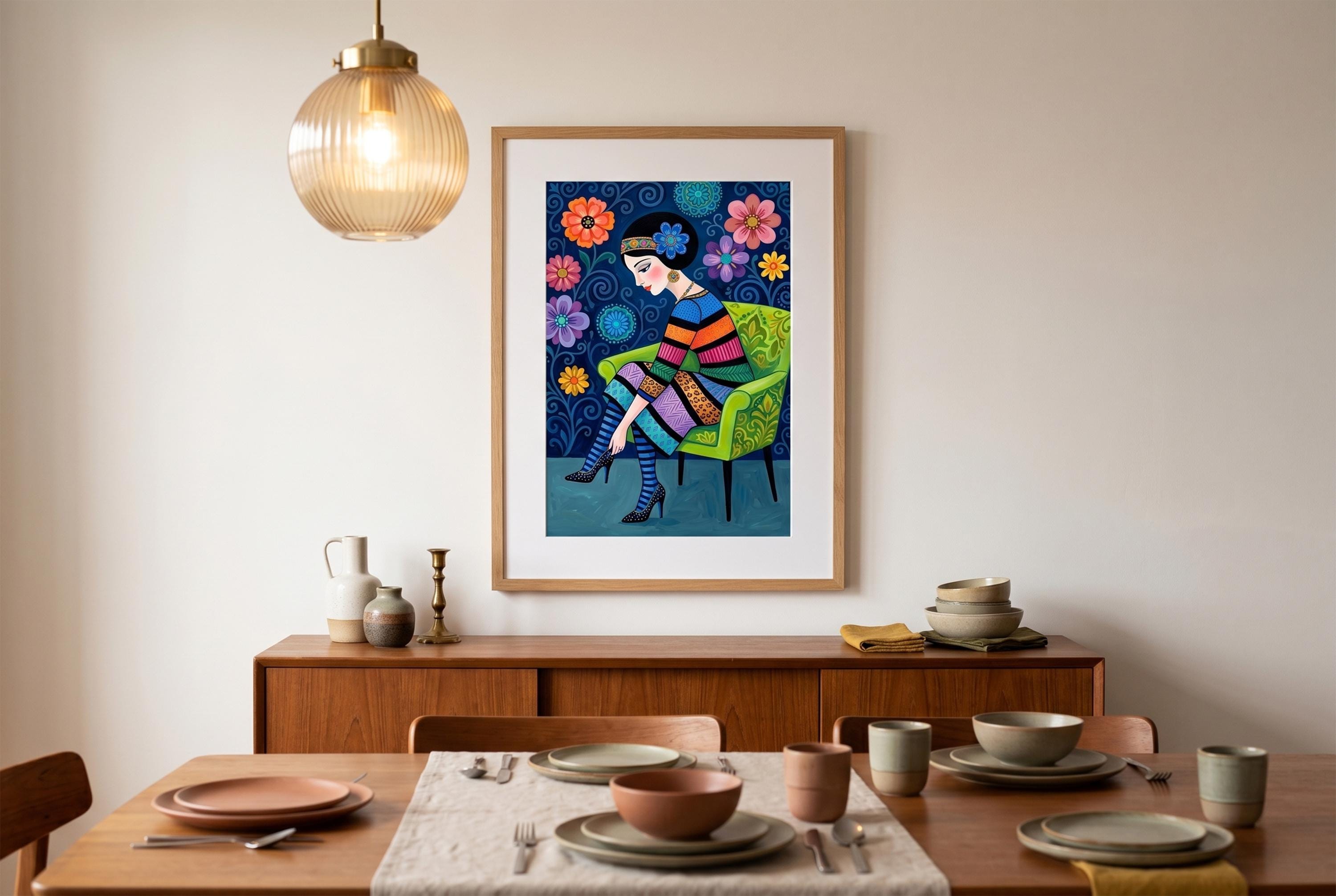 Perched on a lime-green damask armchair, she adjusts her studded heel with quiet confidence. Her dress is a patchwork of patterns — leopard print, chevron, stripes, polka dots — bold, unapologetic, and entirely her own. Around her, oversized folk flowers bloom against a deep navy sky, while mandalas and spirals swirl like music made visible.