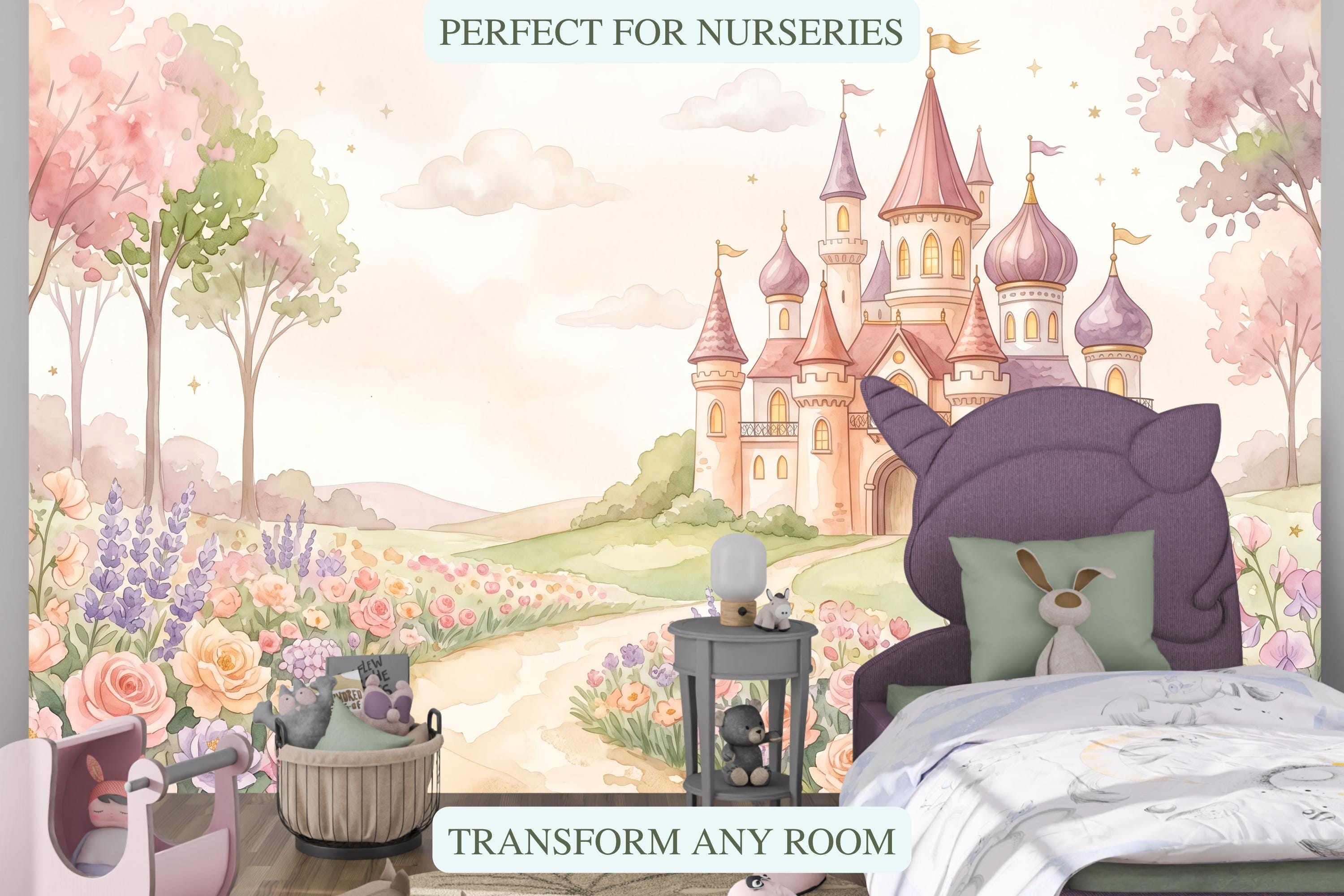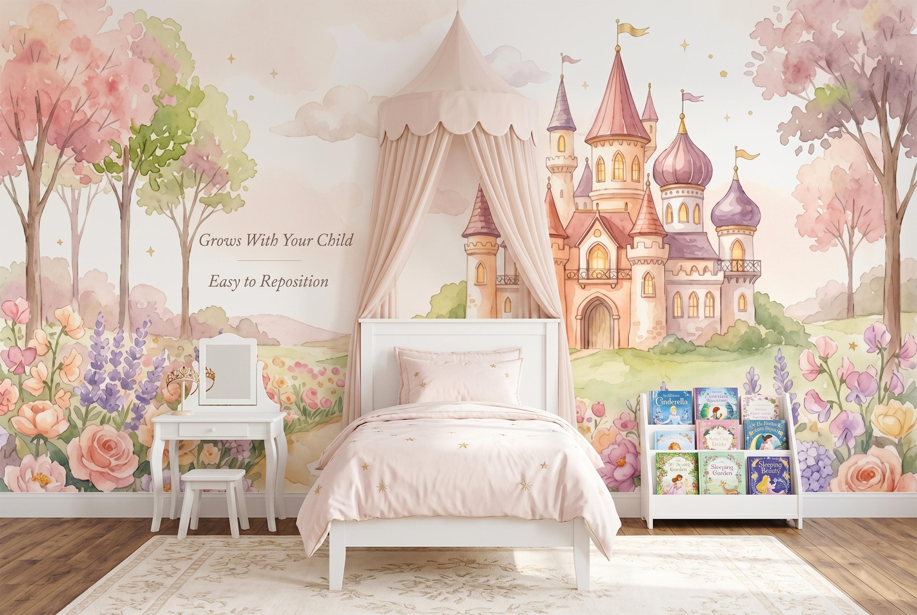 This wallpaper mural is the room your daughter has been dreaming of. It turns an ordinary wall into a kingdom — the kind where every morning begins with a royal adventure and every bedtime ends with a whispered "once upon a time."