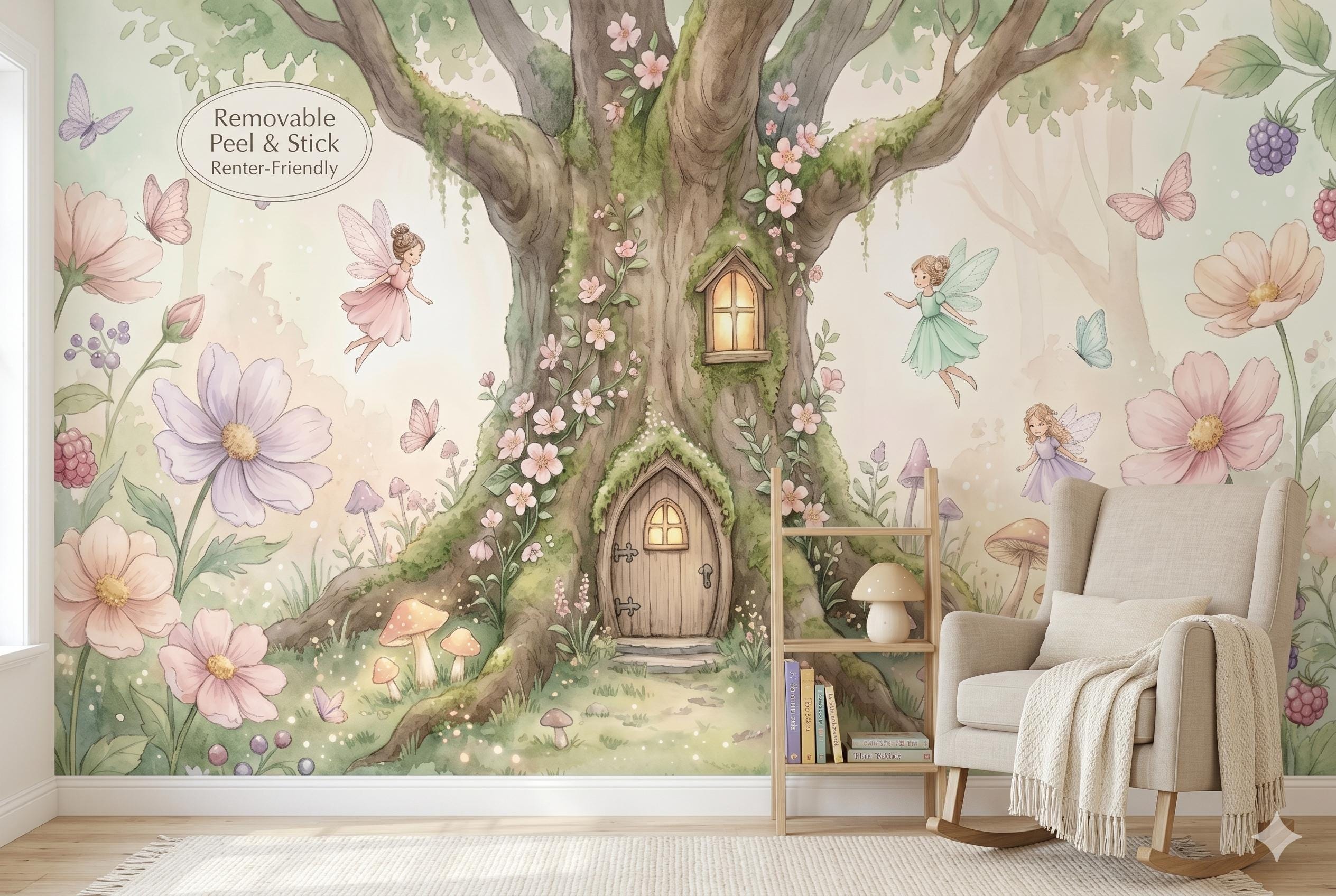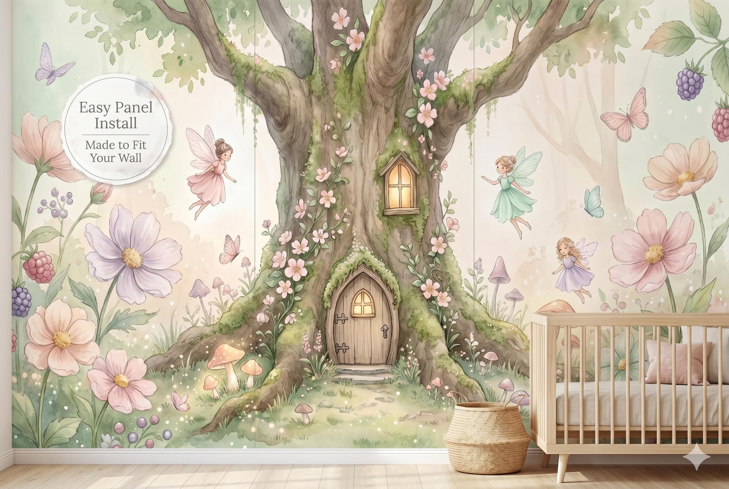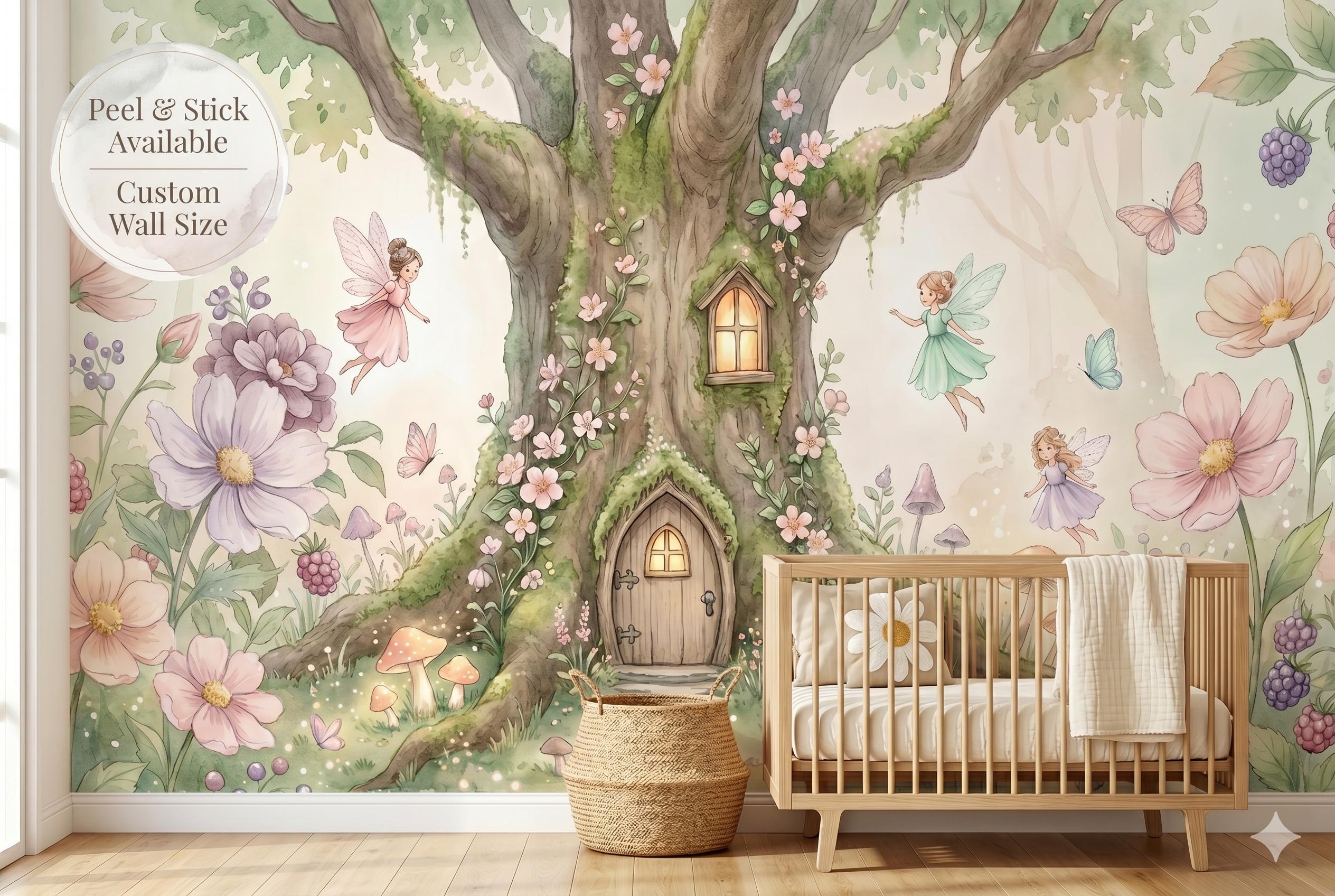 Bring a touch of pure enchantment to any little one's space with this soft watercolor fairy tree house wall mural. A glowing, moss-covered tree with a tiny arched wooden door and window sits at the heart of the design, surrounded by three delicate flying fairies in pastel dresses, oversized pink and lavender blooms, woodland mushrooms, butterflies, and clusters of wild berries — all rendered in a gentle, dreamy watercolor style on a warm ivory background.