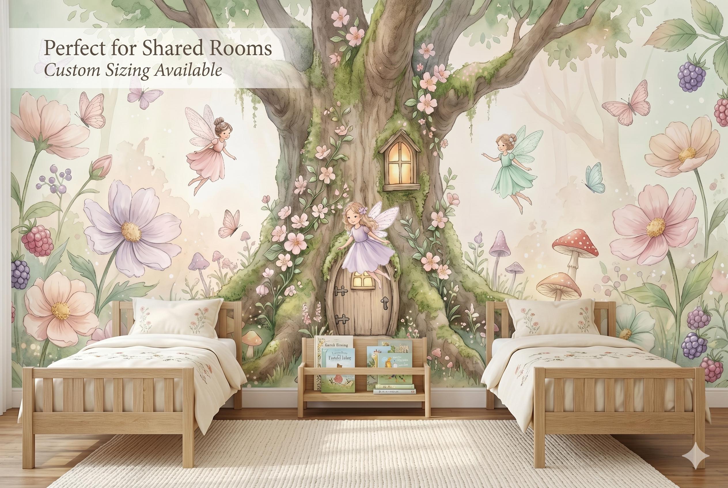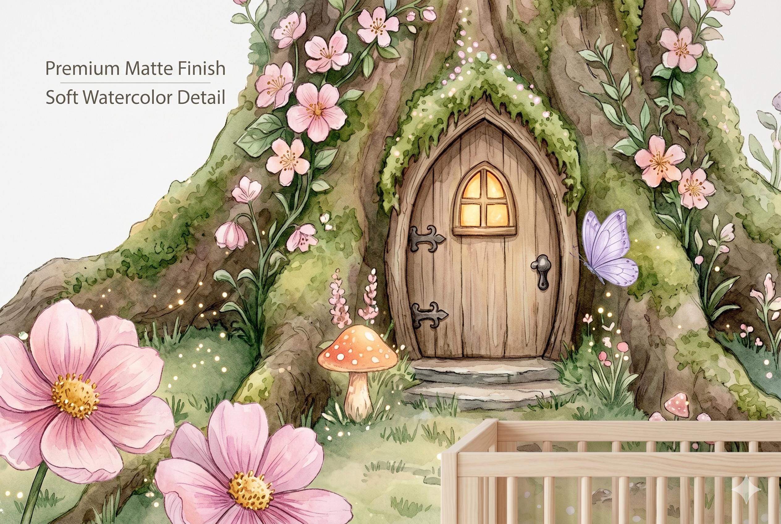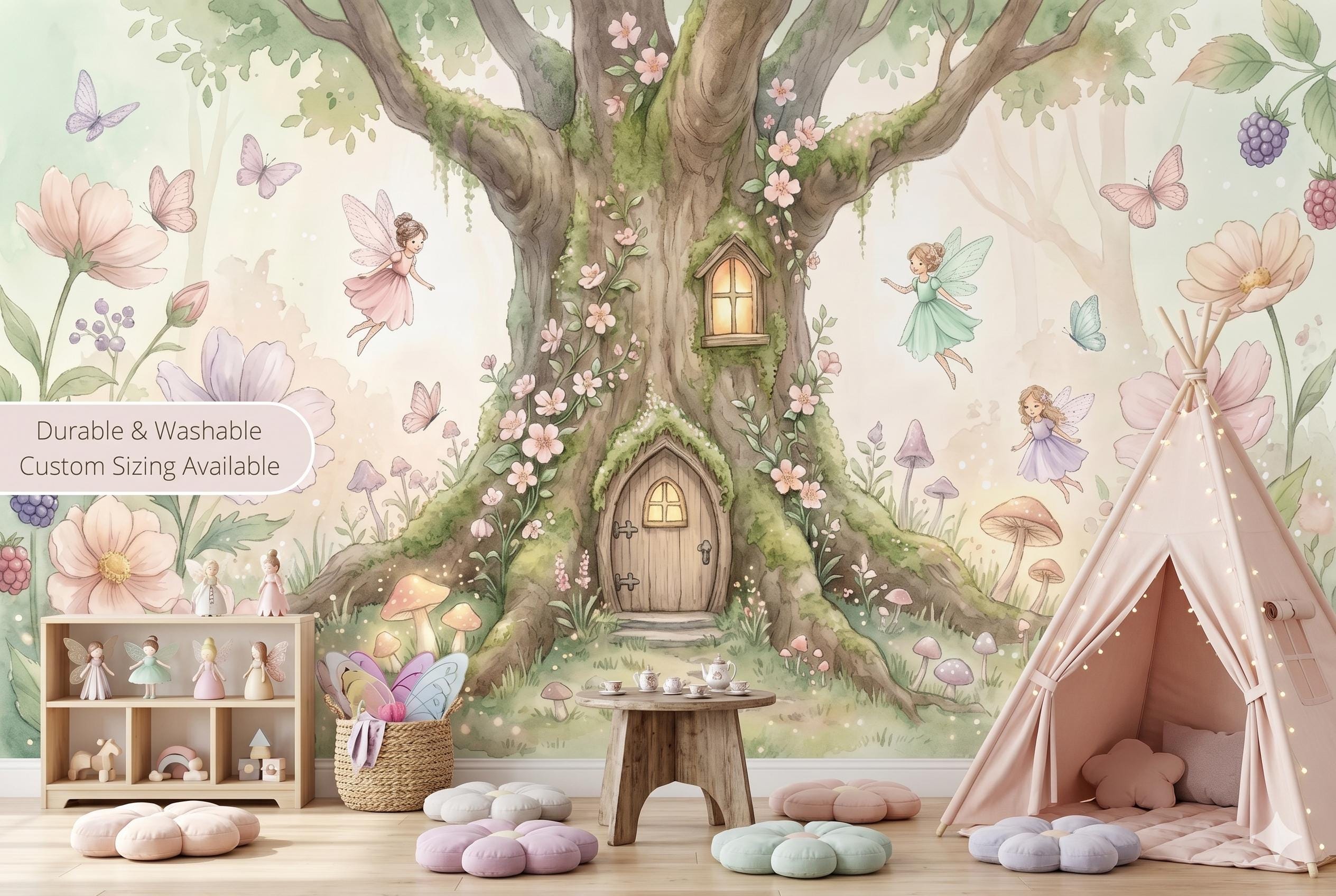Bring a touch of pure enchantment to any little one's space with this soft watercolor fairy tree house wall mural. A glowing, moss-covered tree with a tiny arched wooden door and window sits at the heart of the design, surrounded by three delicate flying fairies in pastel dresses, oversized pink and lavender blooms, woodland mushrooms, butterflies, and clusters of wild berries — all rendered in a gentle, dreamy watercolor style on a warm ivory background.