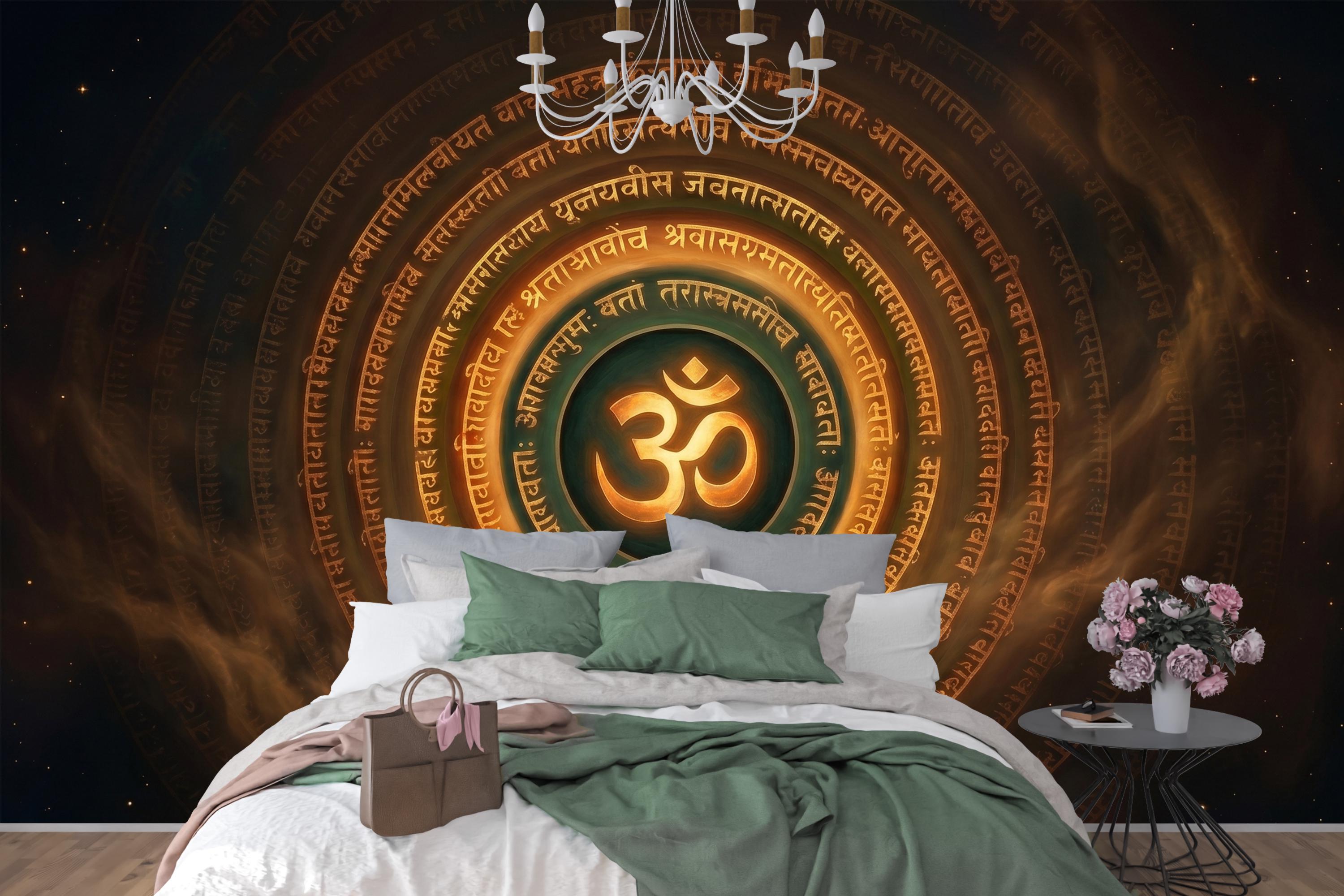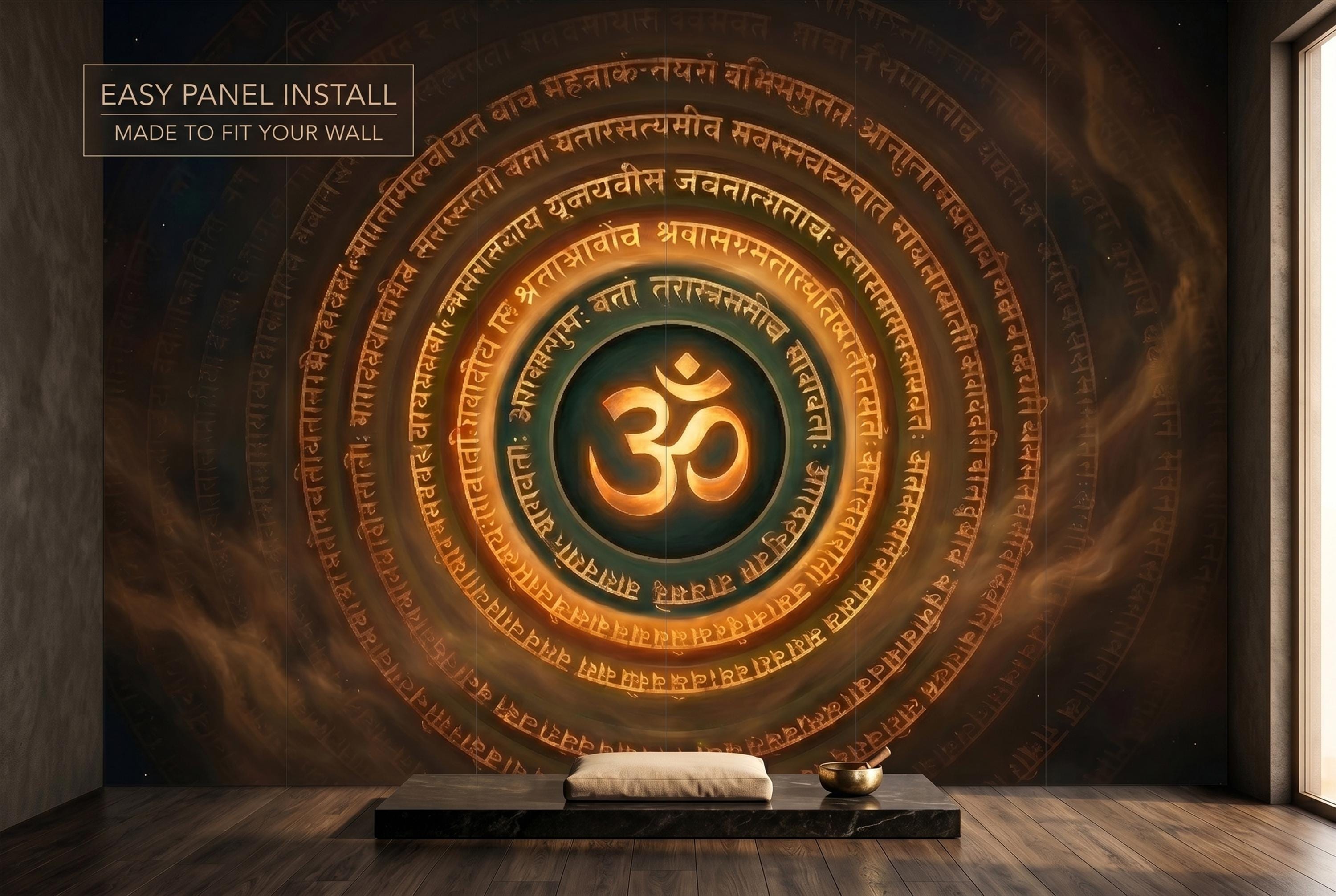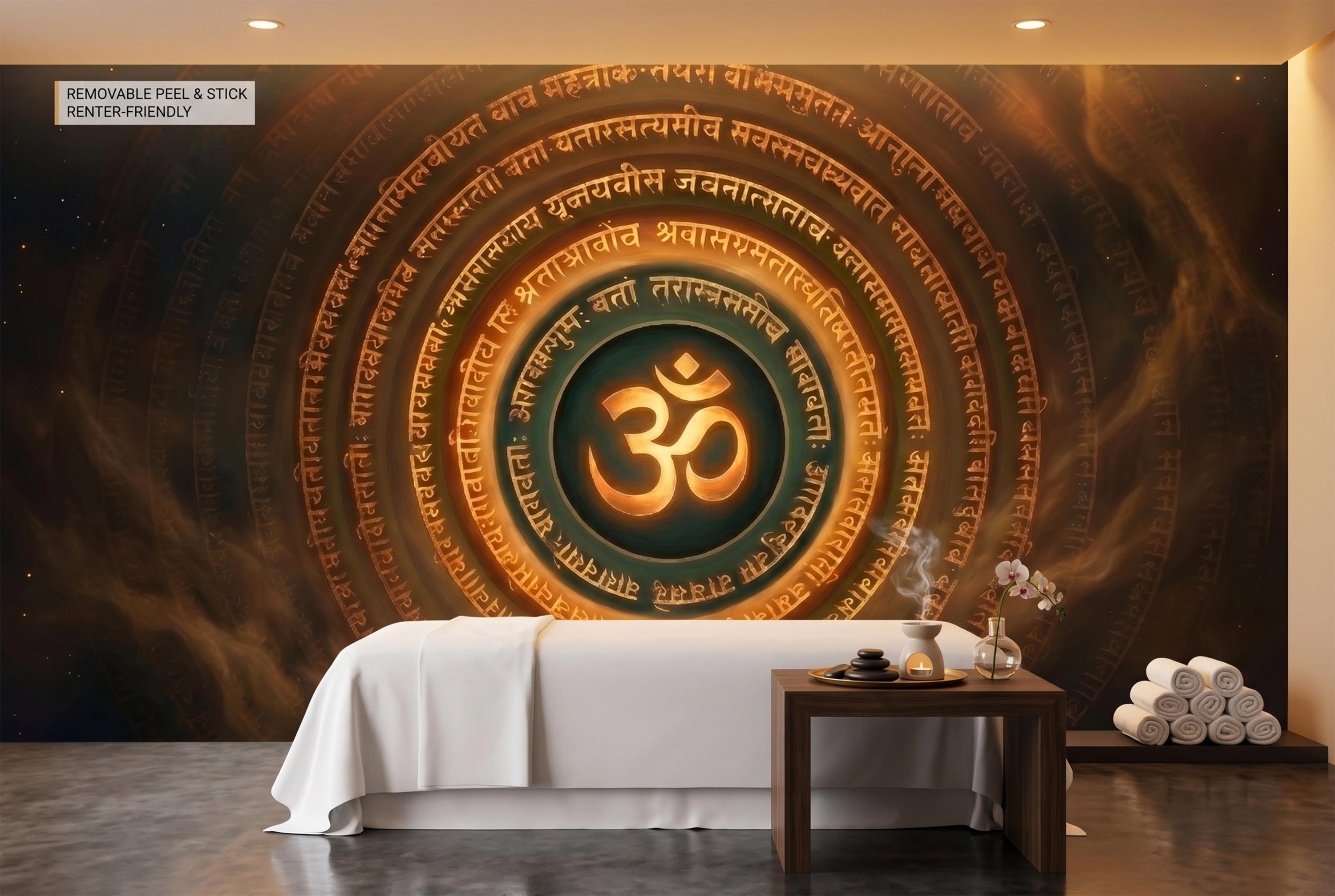 Command the energy of any space with this dramatic Om symbol mandala wall mural — a glowing golden OM at the center, encircled by concentric rings of ancient Sanskrit script on a deep, smoky cosmic background of dark amber, teal, and star-flecked black. The warm gold tones radiate outward like sacred fire, creating an atmosphere of depth, spirituality, and focused intention.