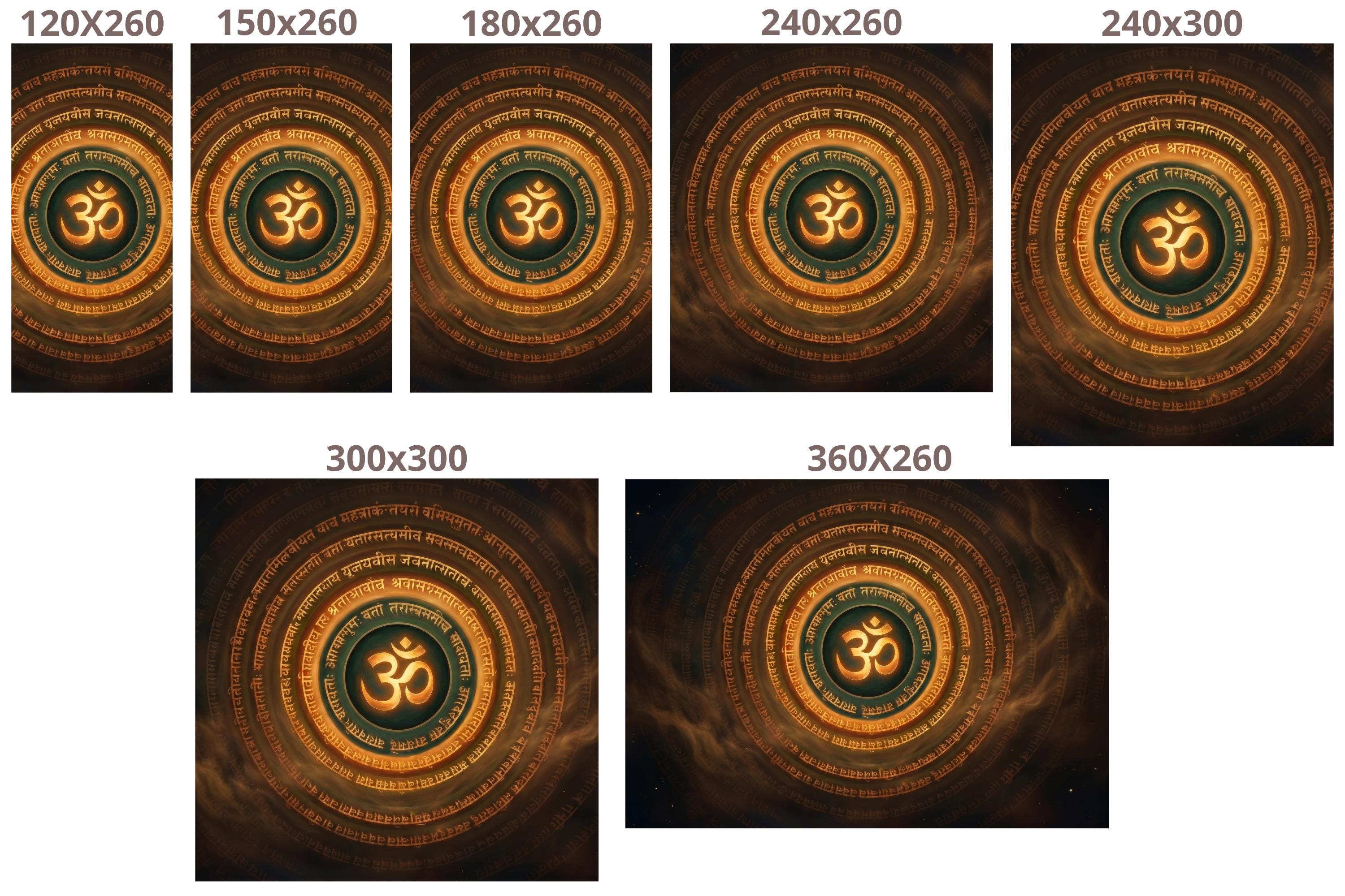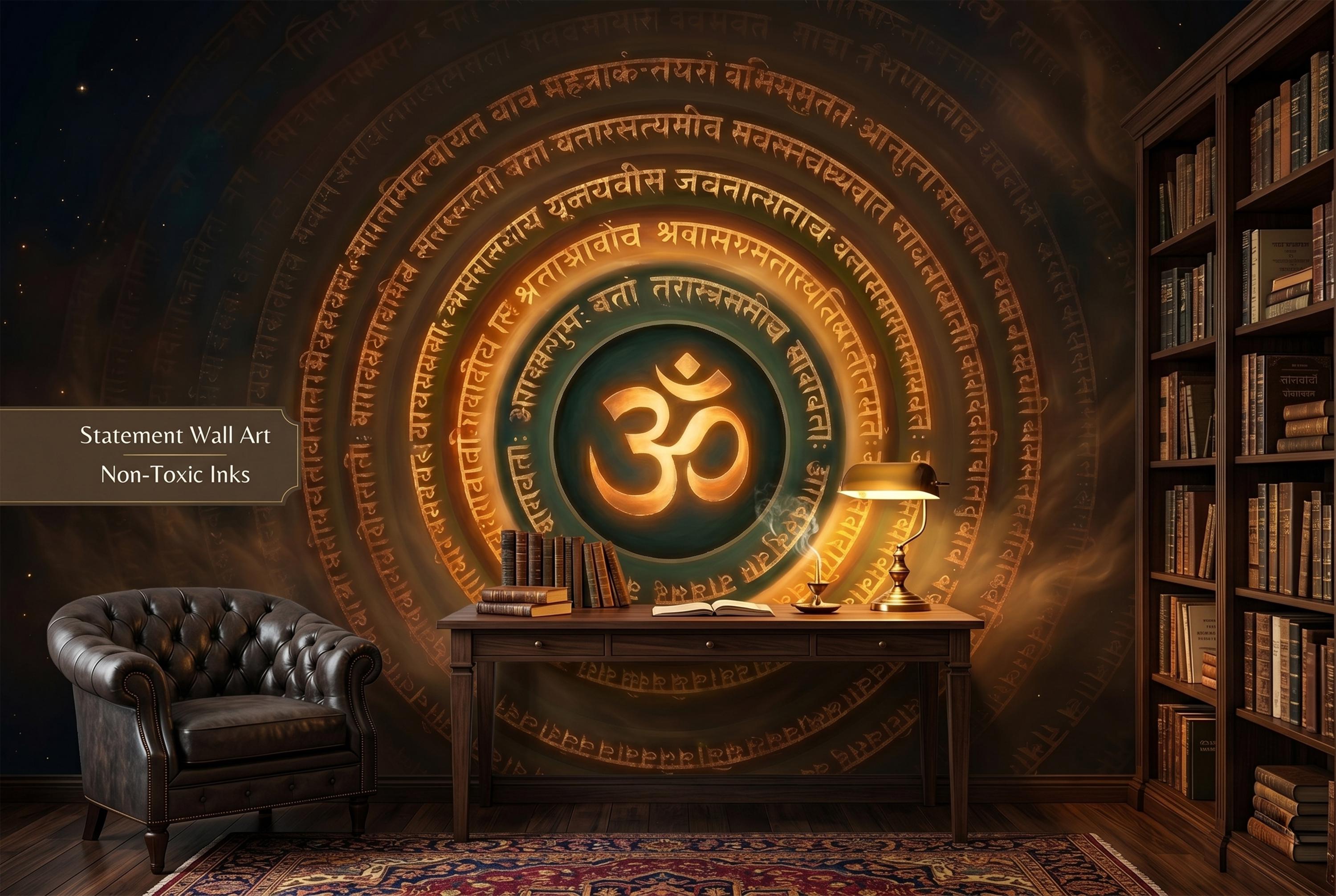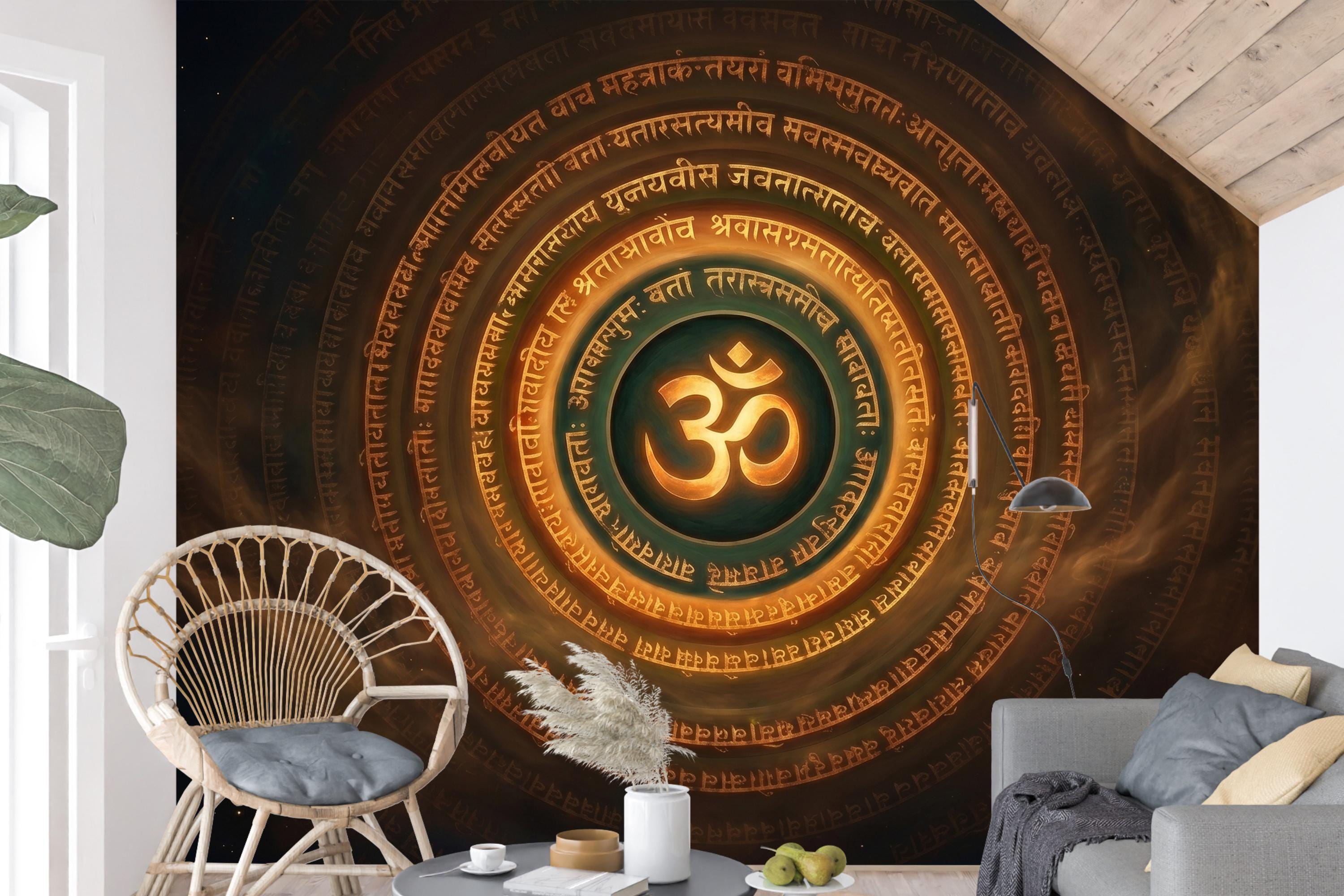 Command the energy of any space with this dramatic Om symbol mandala wall mural — a glowing golden OM at the center, encircled by concentric rings of ancient Sanskrit script on a deep, smoky cosmic background of dark amber, teal, and star-flecked black. The warm gold tones radiate outward like sacred fire, creating an atmosphere of depth, spirituality, and focused intention.