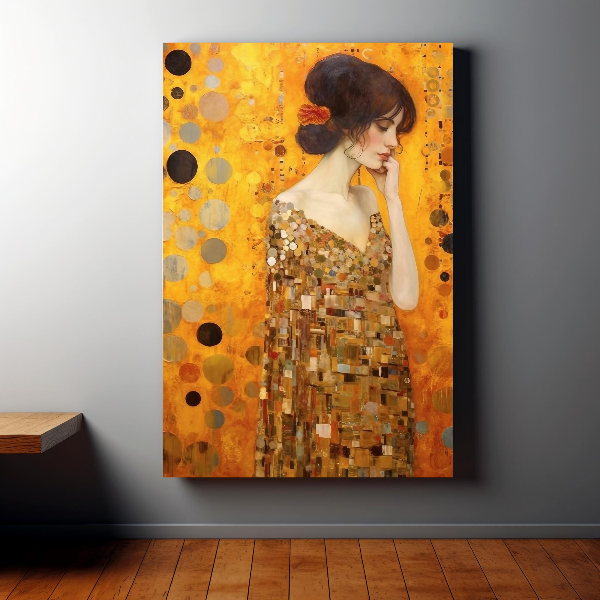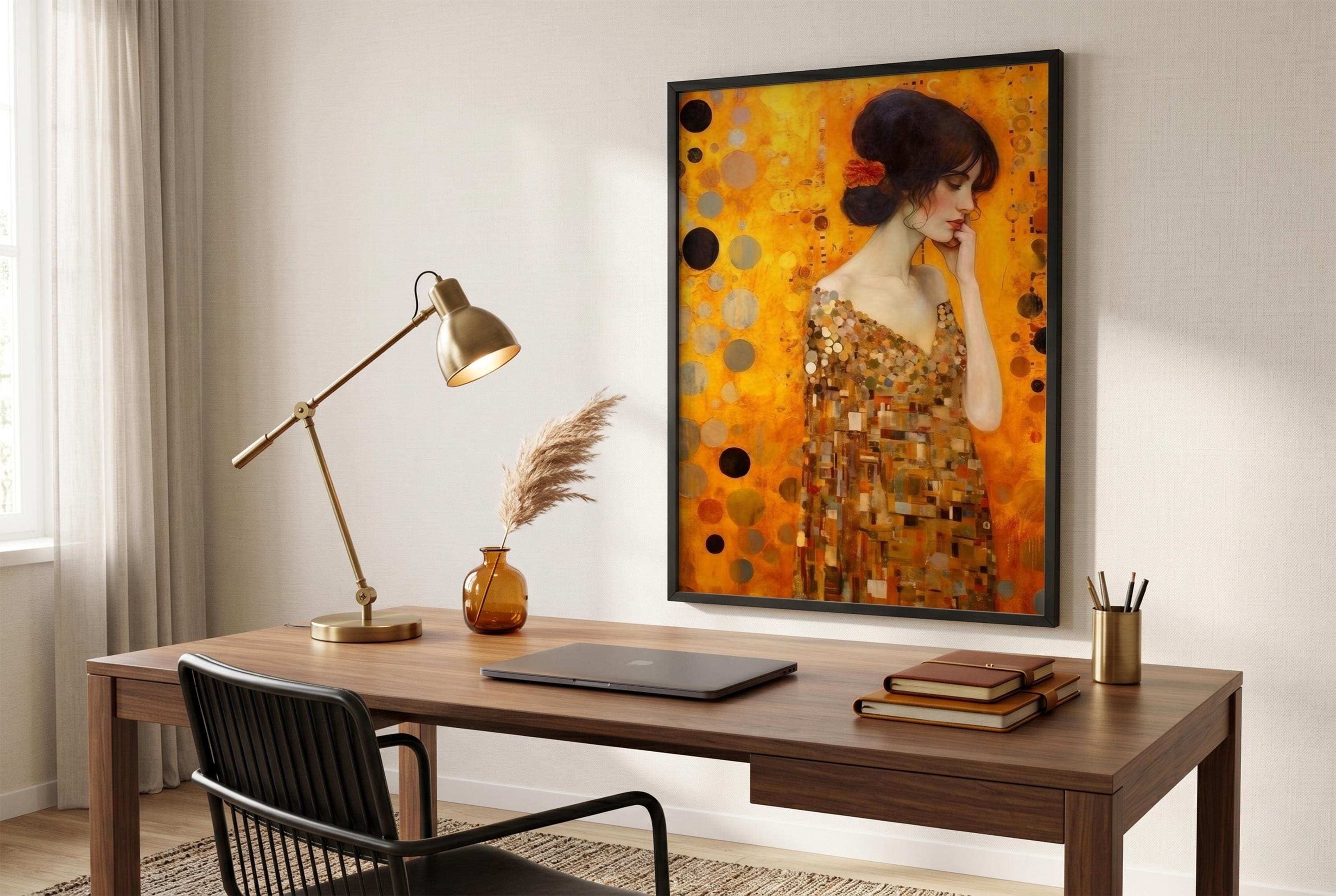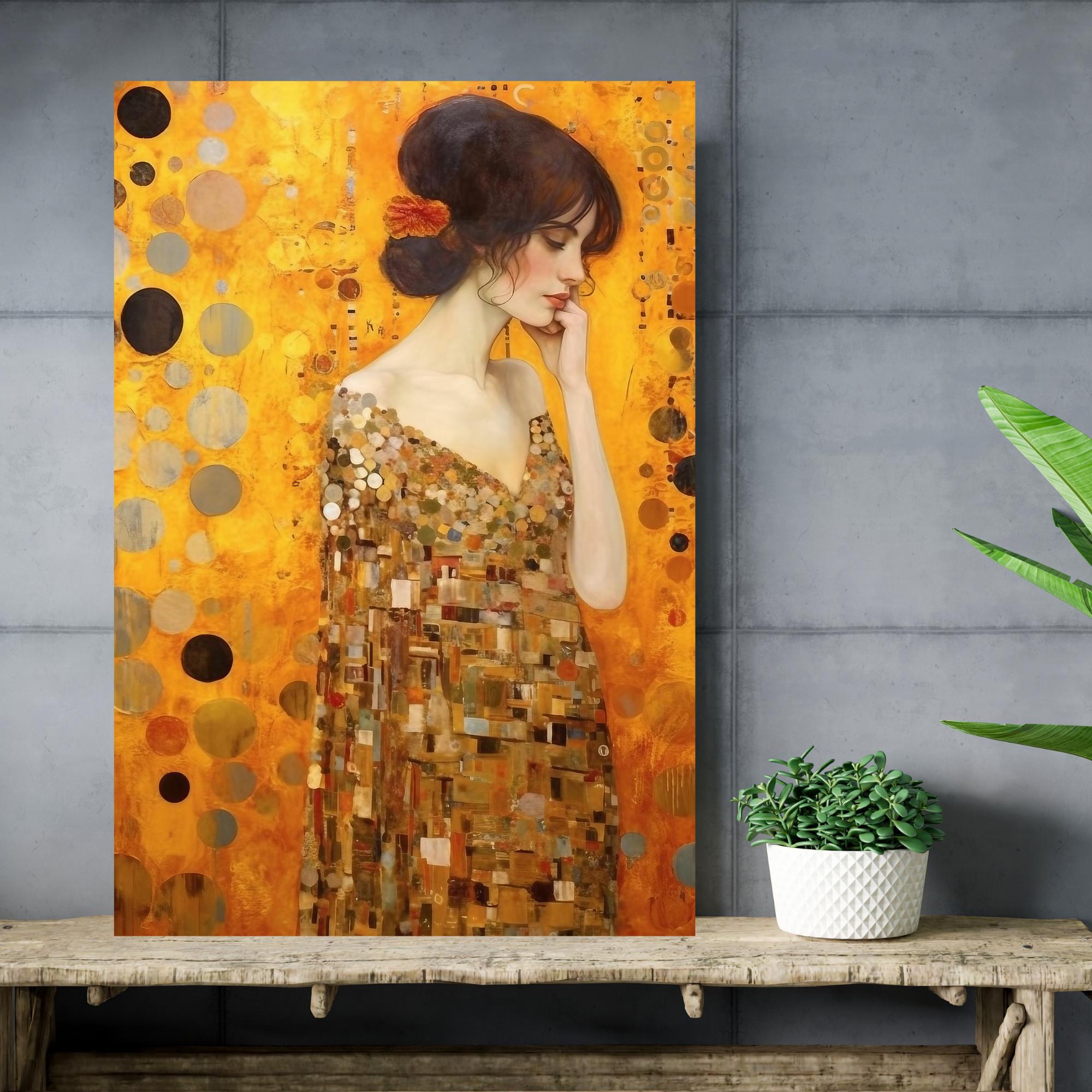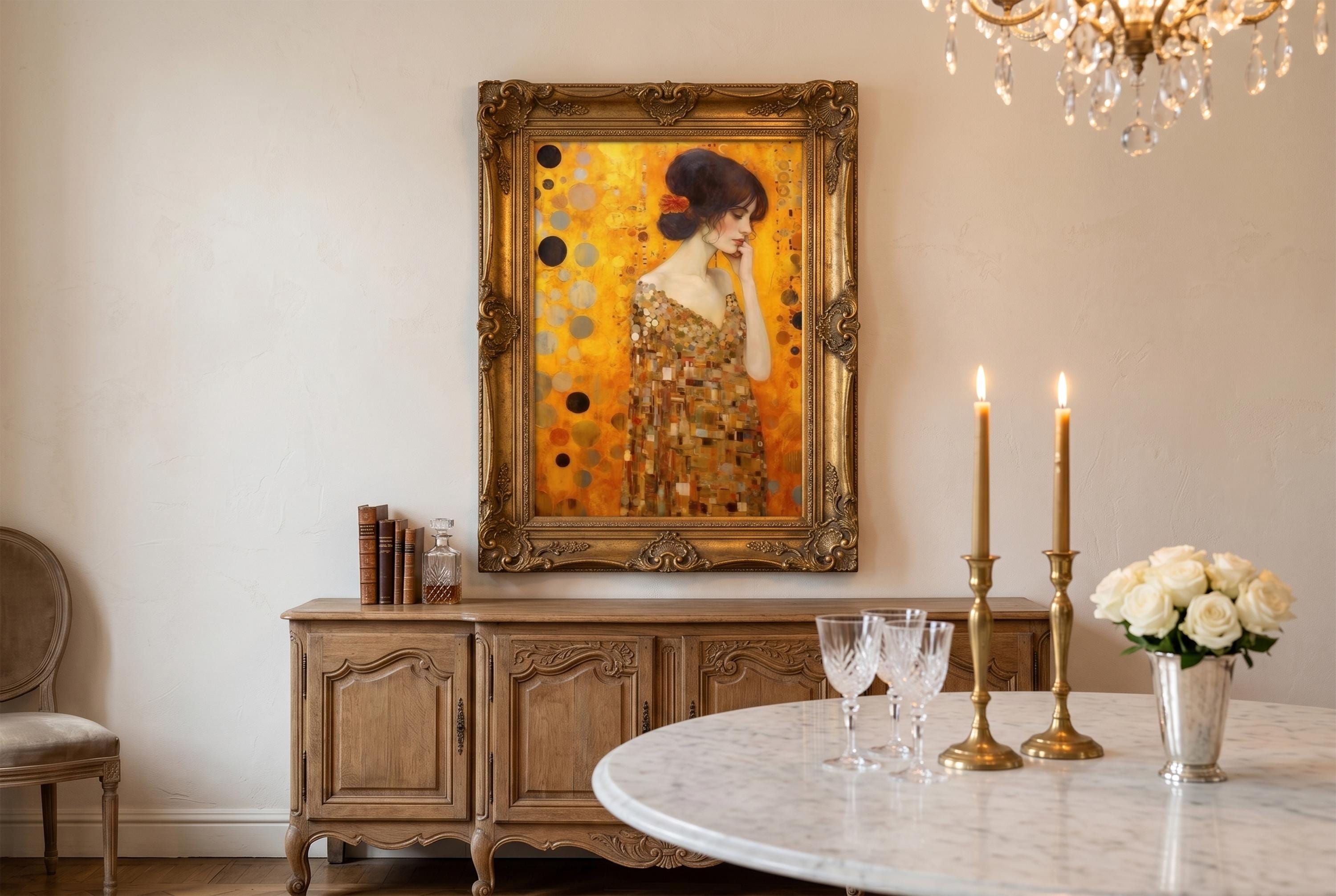 Add a touch of timeless elegance to your walls with this captivating Art Nouveau-inspired golden woman portrait. A contemplative female figure with dark hair swept into a soft updo, adorned with a single red-orange flower, rests her chin gently on her hand.