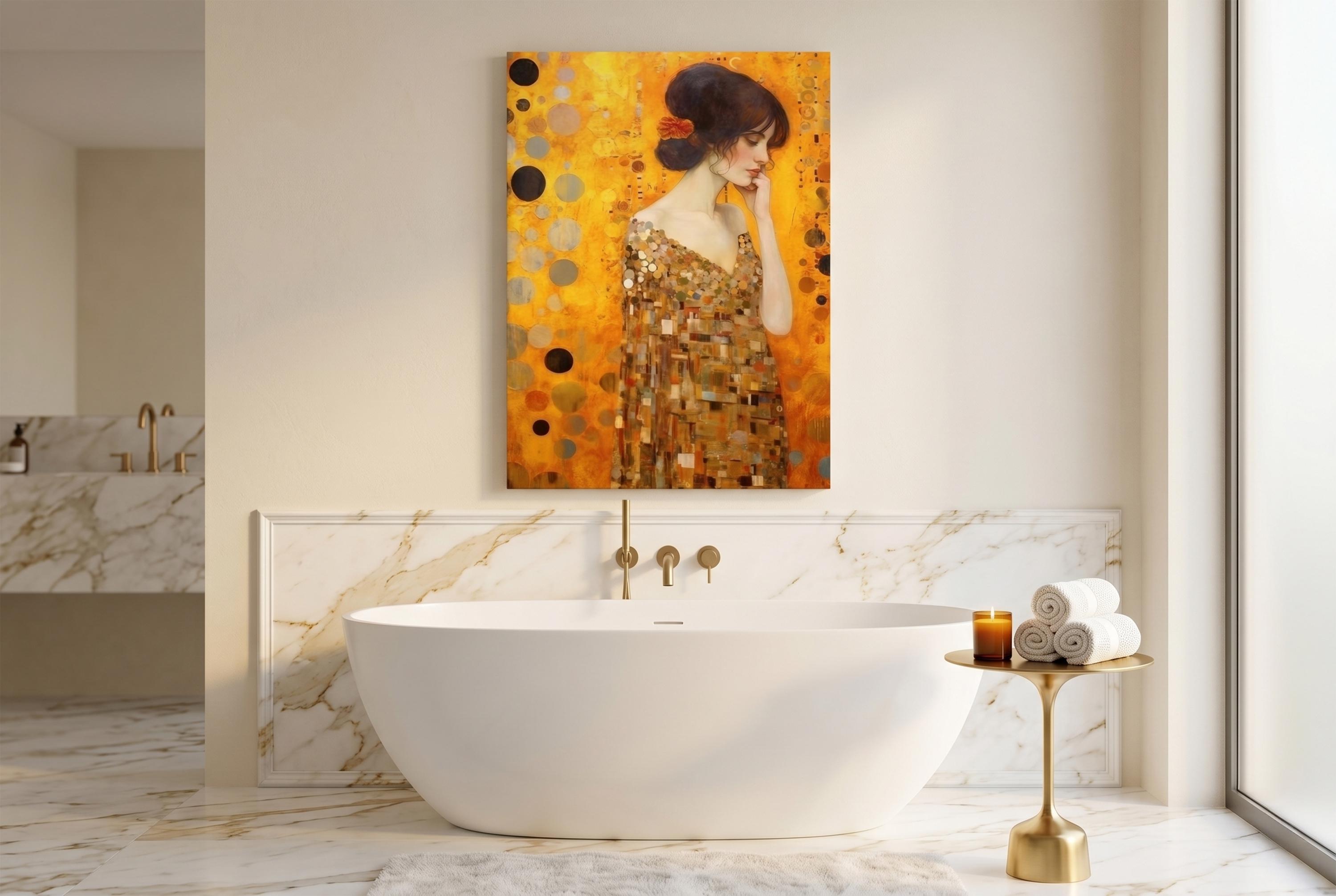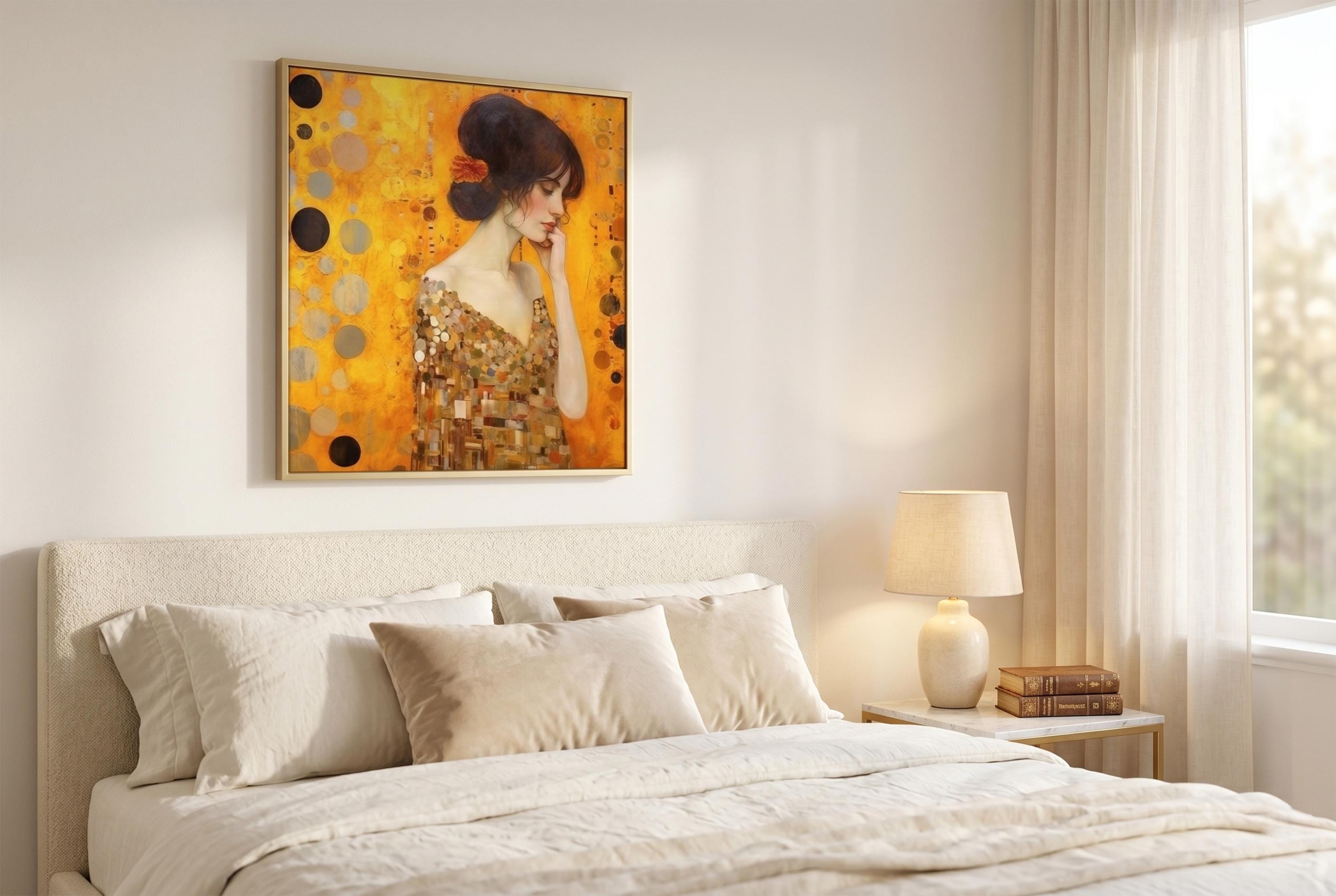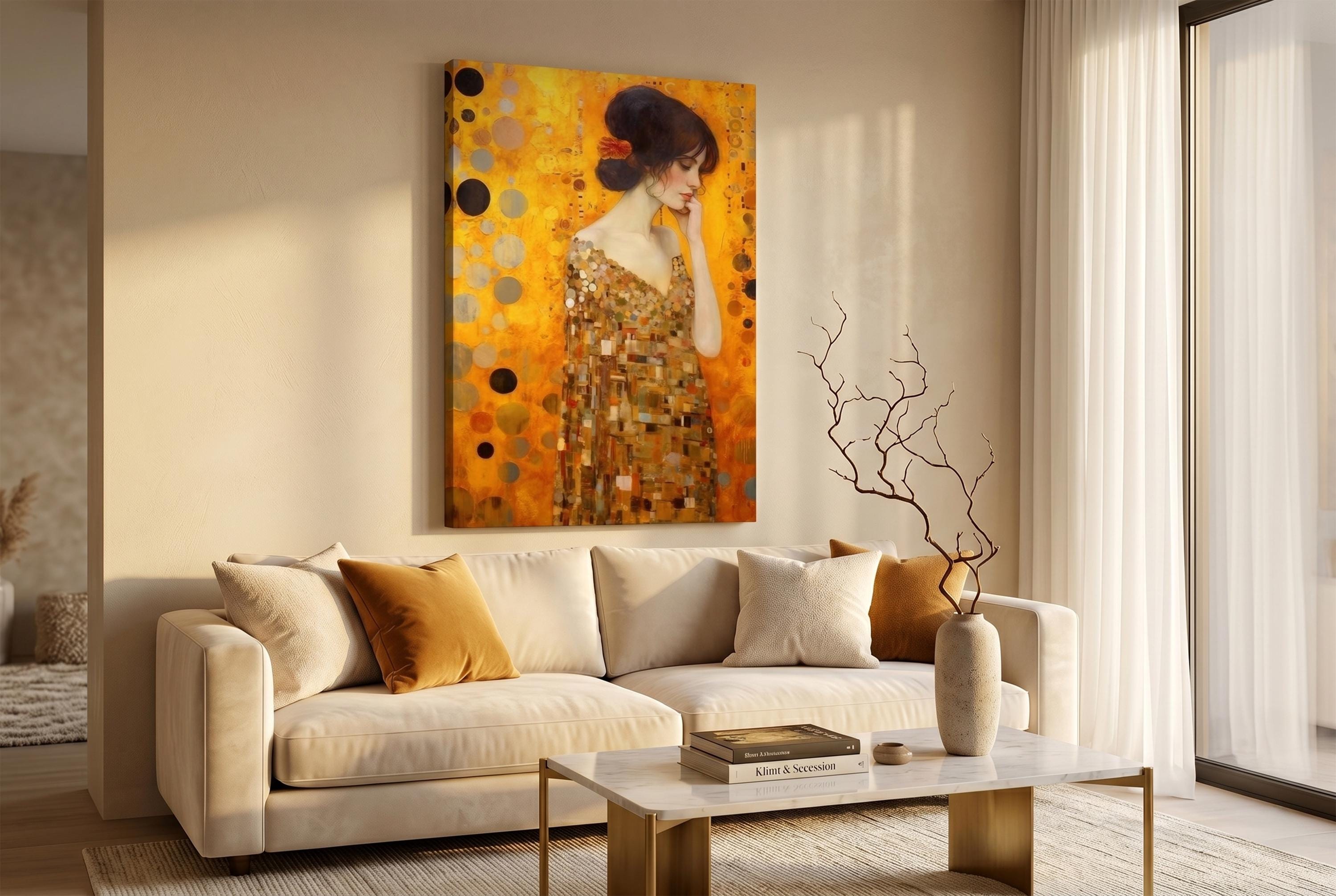 Add a touch of timeless elegance to your walls with this captivating Art Nouveau-inspired golden woman portrait. A contemplative female figure with dark hair swept into a soft updo, adorned with a single red-orange flower, rests her chin gently on her hand.