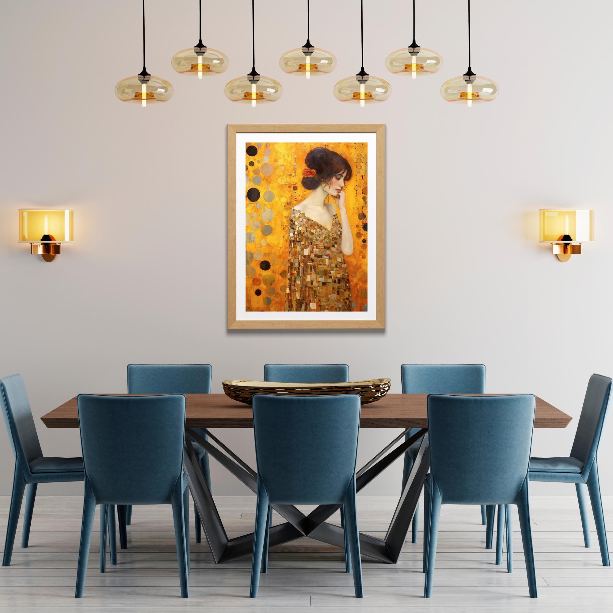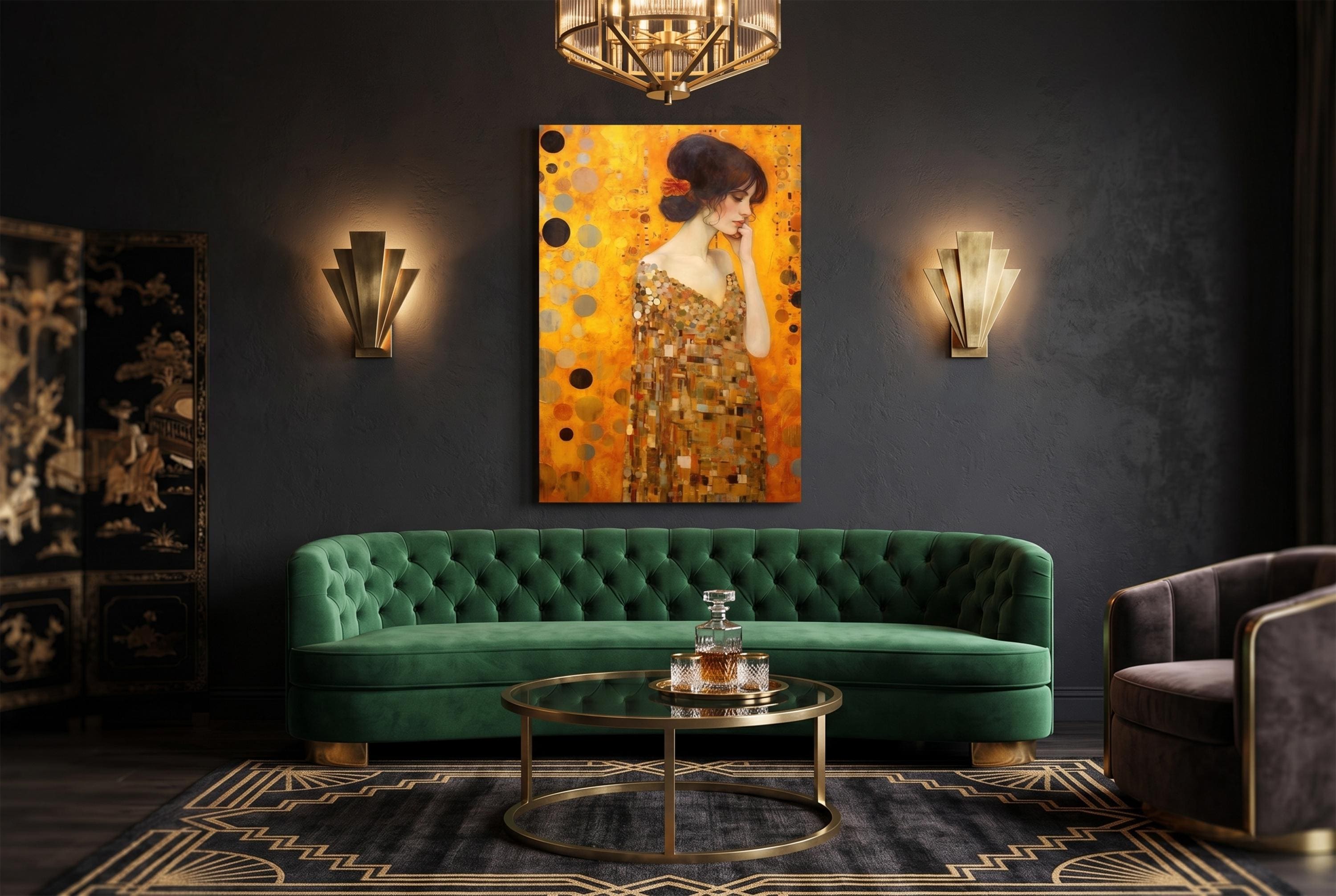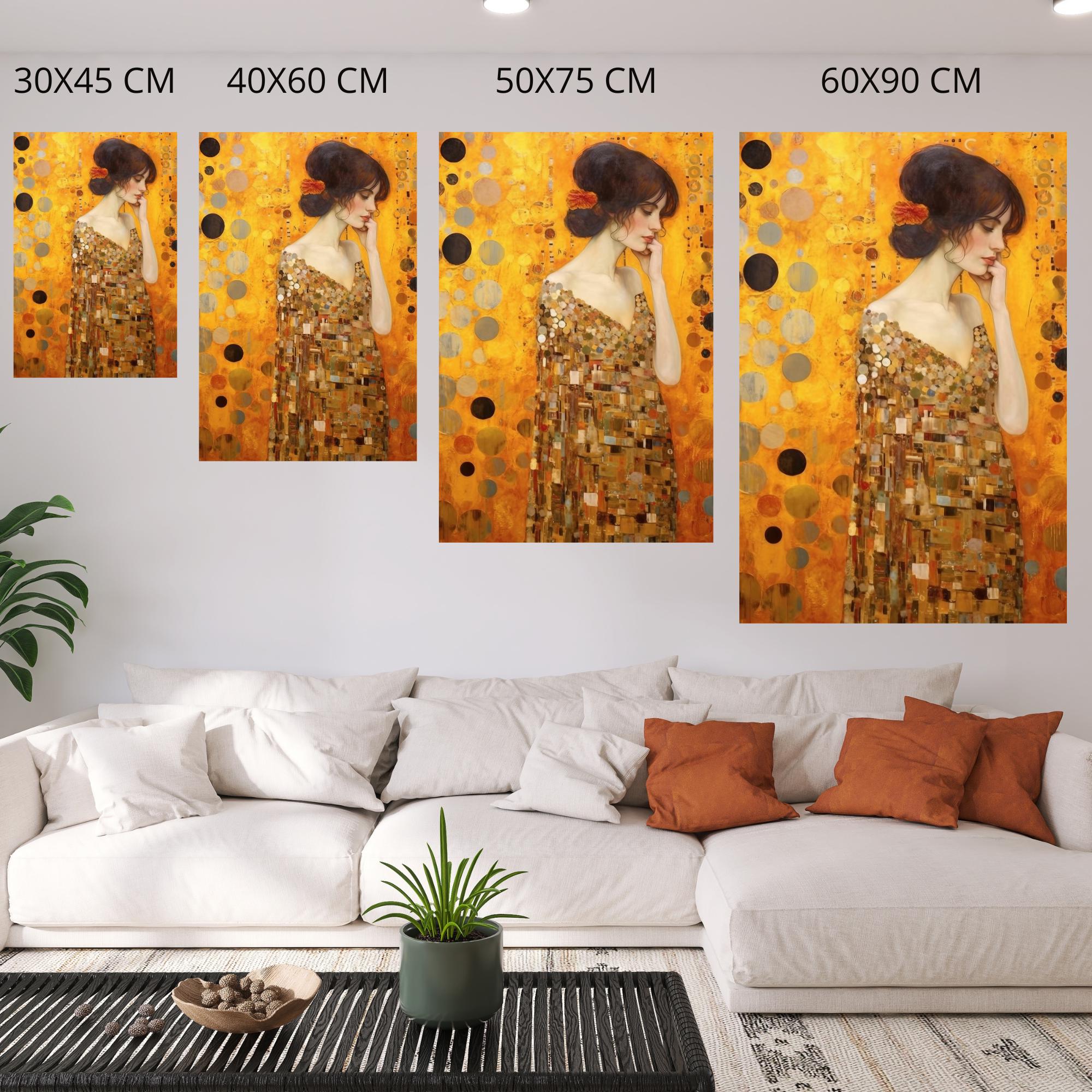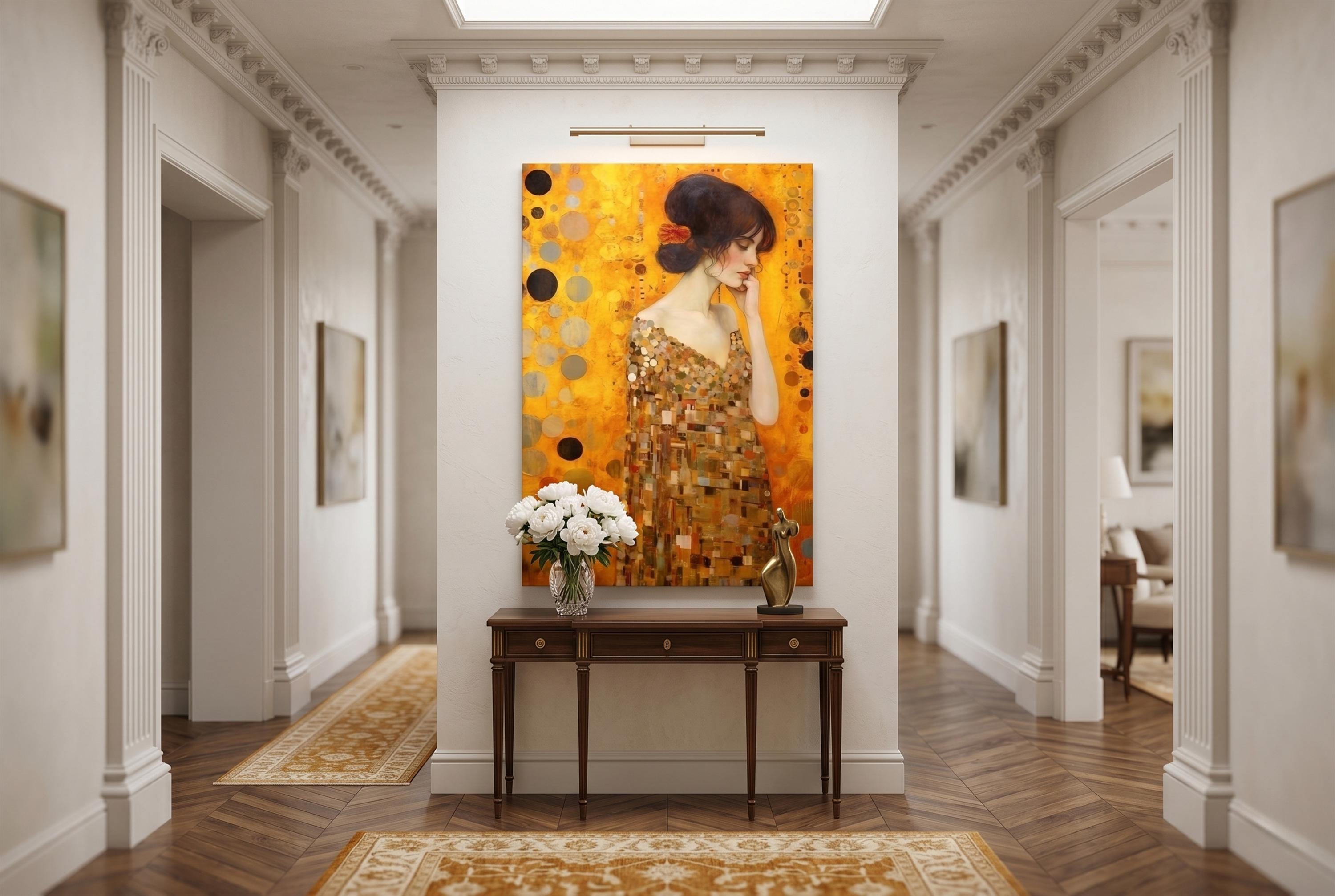 Add a touch of timeless elegance to your walls with this captivating Art Nouveau-inspired golden woman portrait. A contemplative female figure with dark hair swept into a soft updo, adorned with a single red-orange flower, rests her chin gently on her hand.
