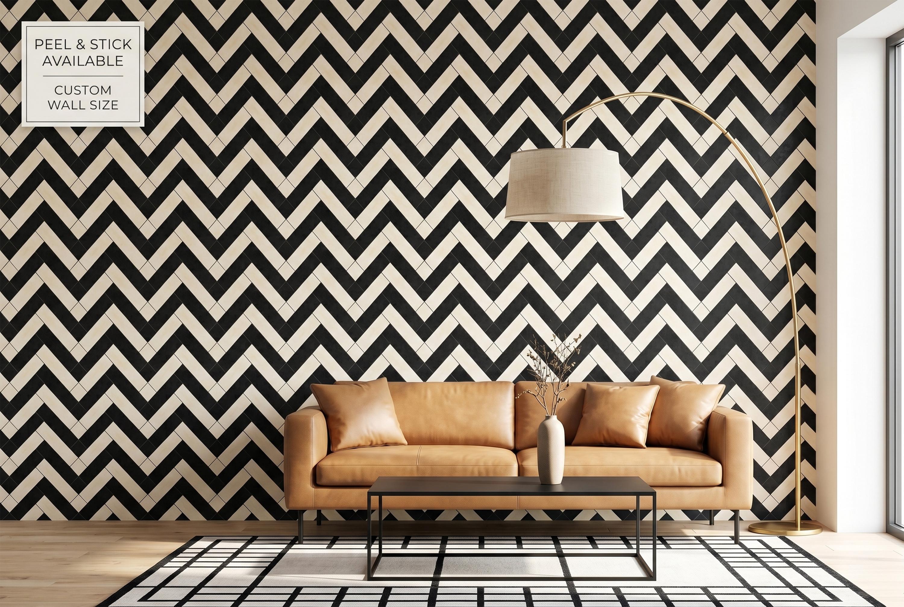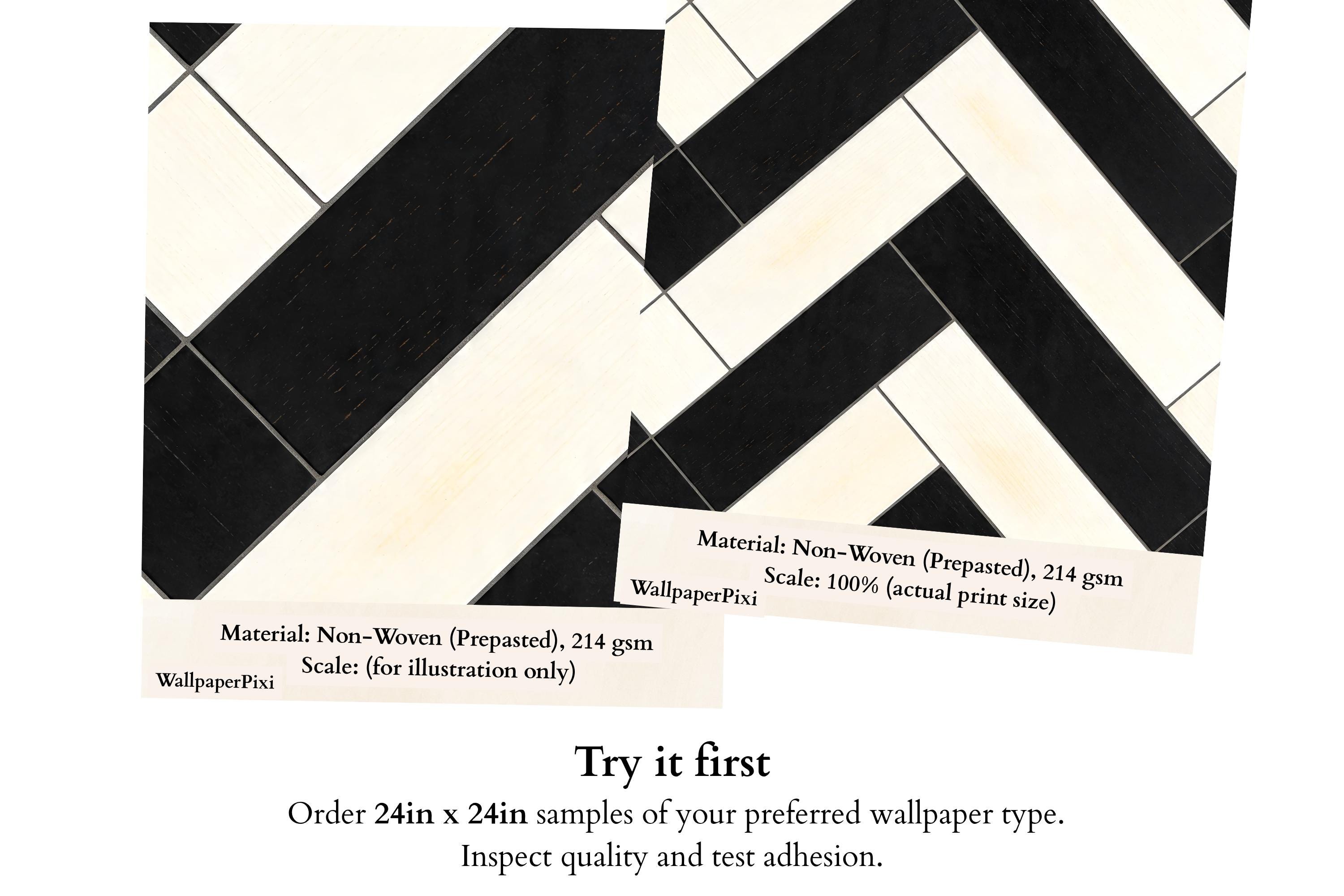 Make a bold, architectural statement with this striking black and white herringbone tile wallpaper. Oversized rectangular planks in deep charcoal-black and warm cream-ivory are arranged in a classic herringbone parquet pattern, complete with realistic grout lines and subtle wood-grain texture that give the design an authentic, tactile feel.